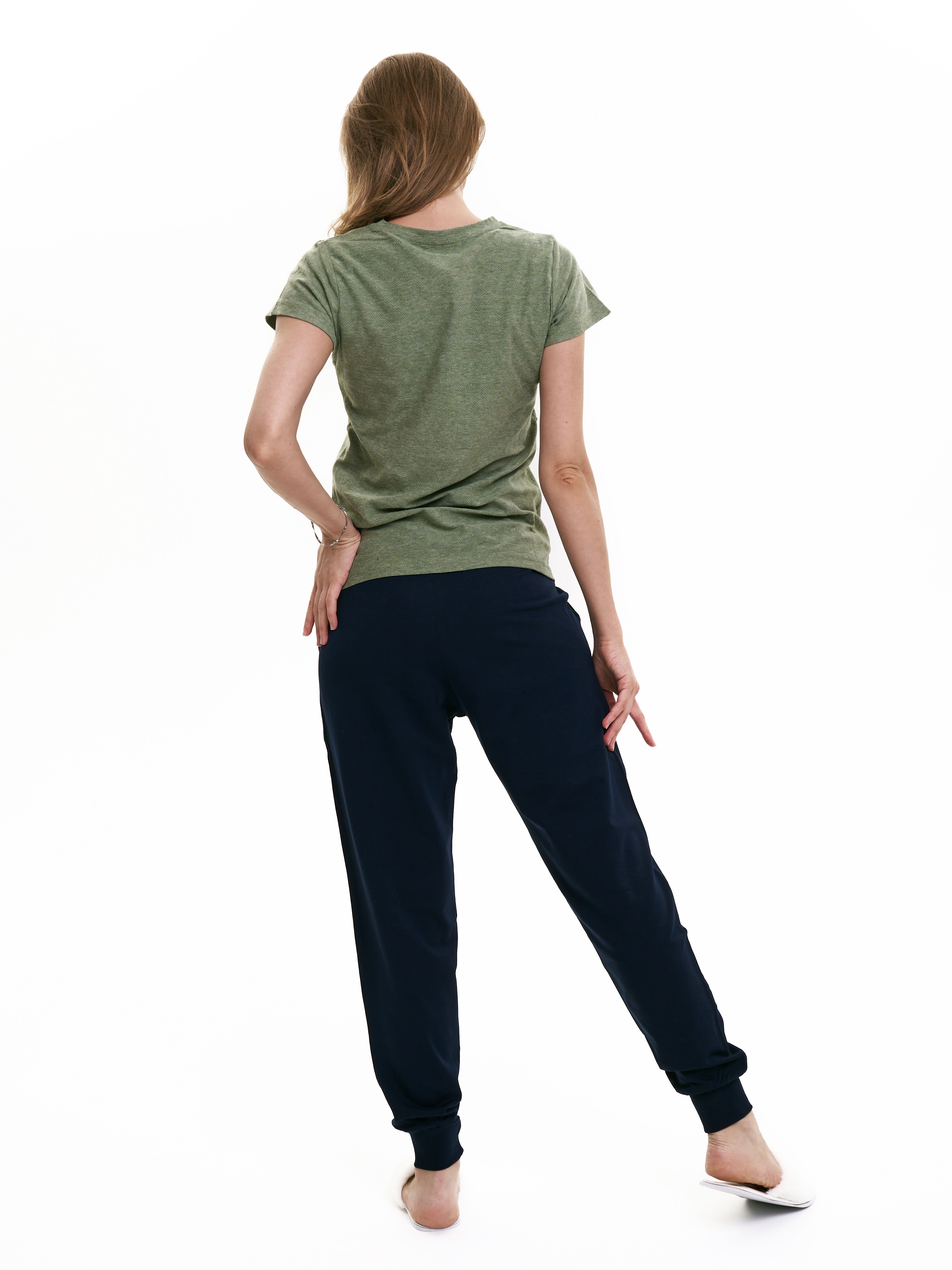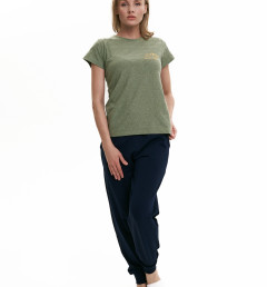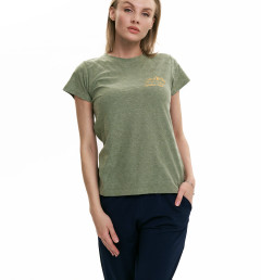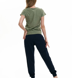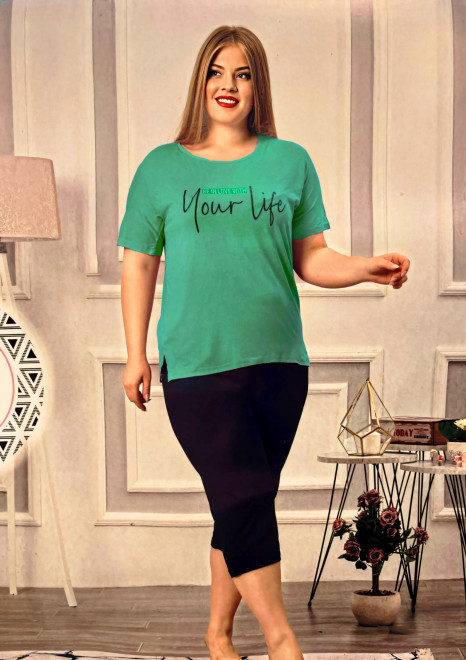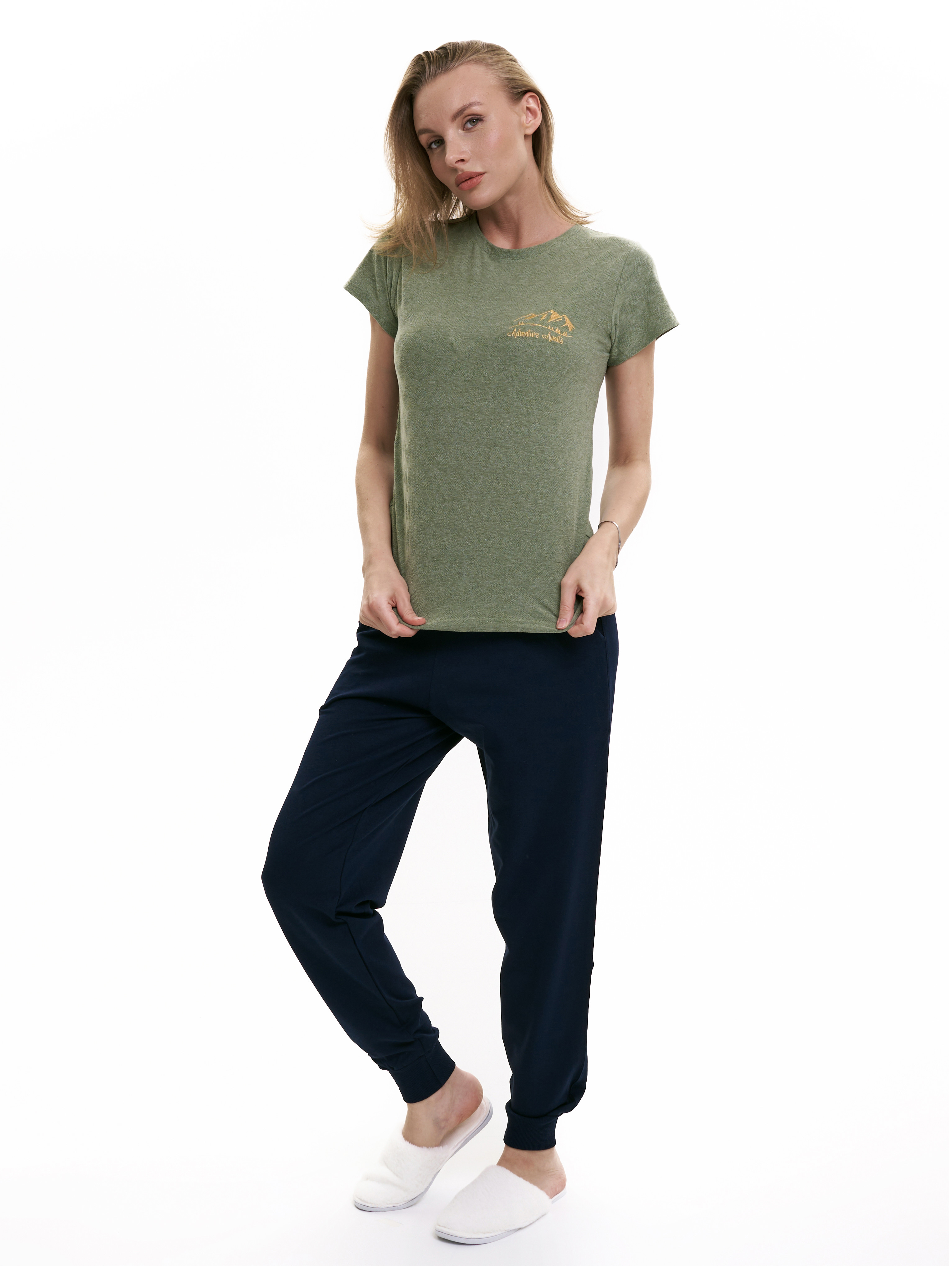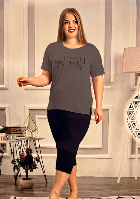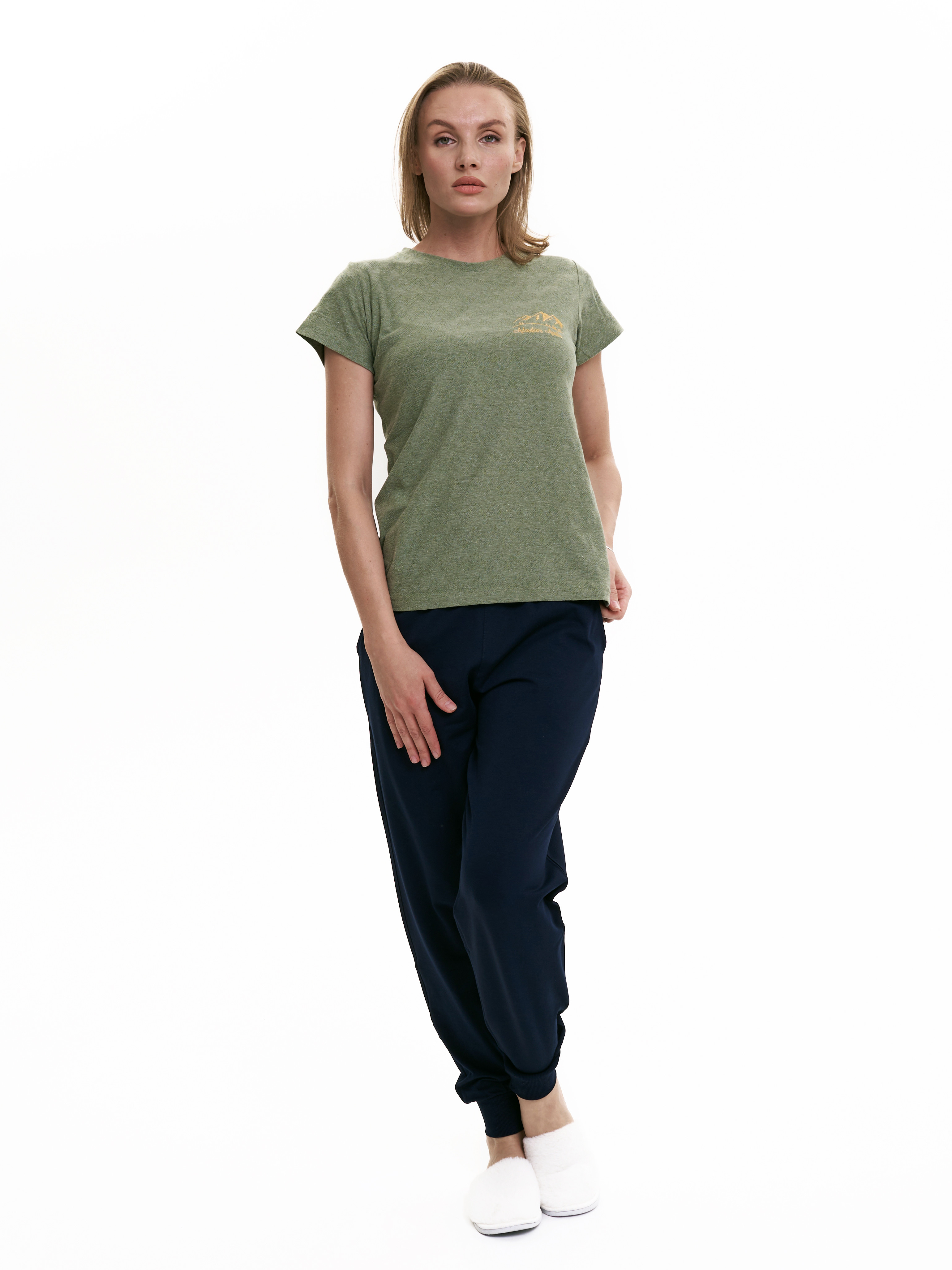 Женский комплект Berrak: светло-зеленая футболка с небольшим принтом и темно-серые легинсы. Верх изготовлен из 50% полиэстера и 50% хлопка, а низ - из 100% хлопка pamuk.