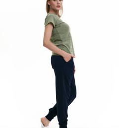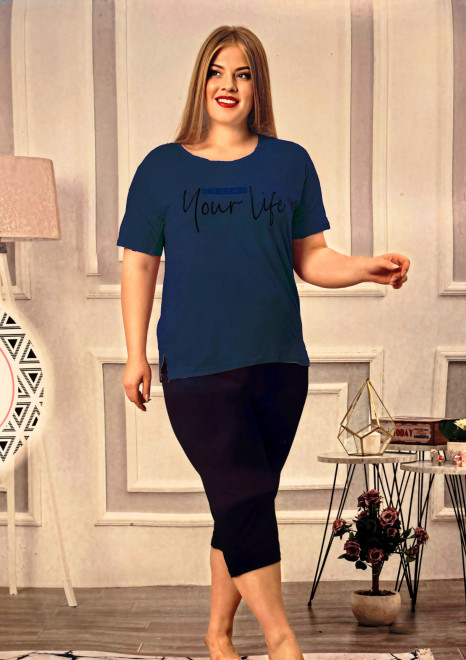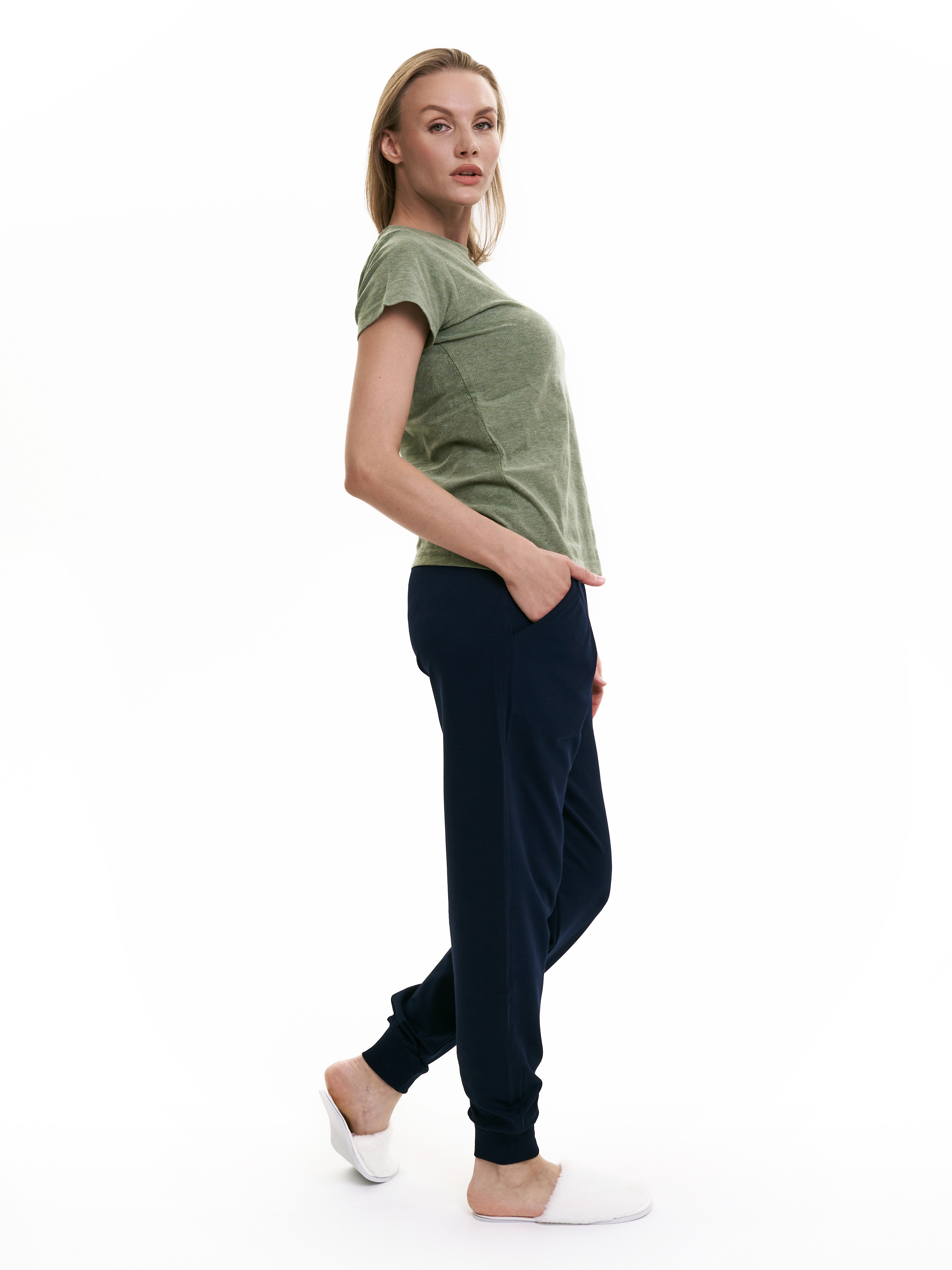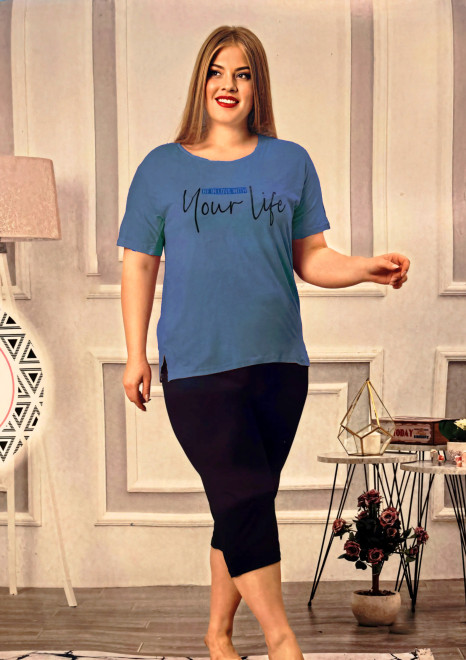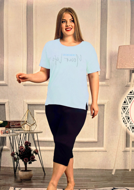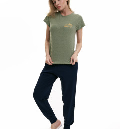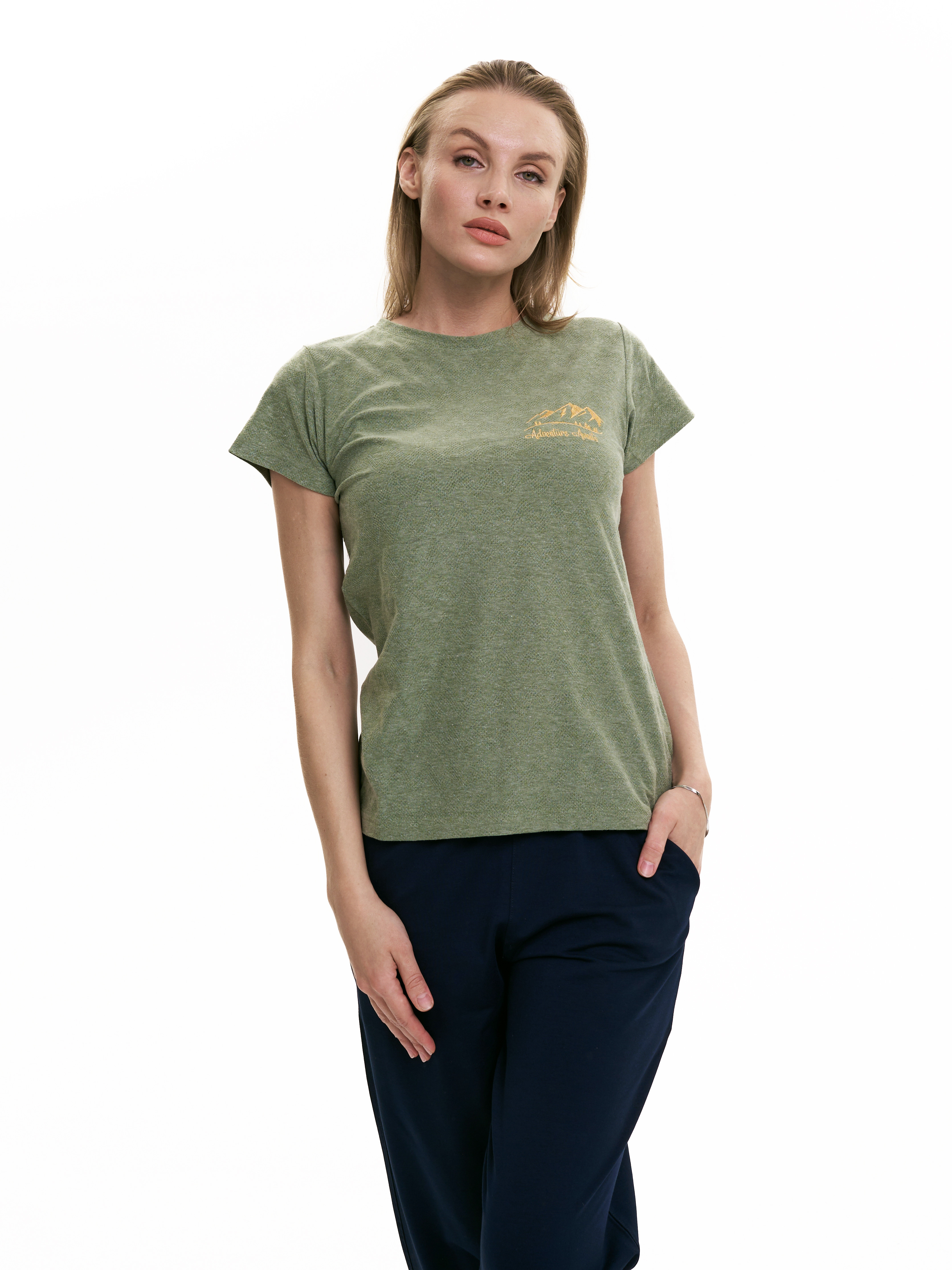 Женский комплект Berrak: светло-зеленая футболка с небольшим принтом и темно-серые легинсы. Верх изготовлен из 50% полиэстера и 50% хлопка, а низ - из 100% хлопка pamuk.