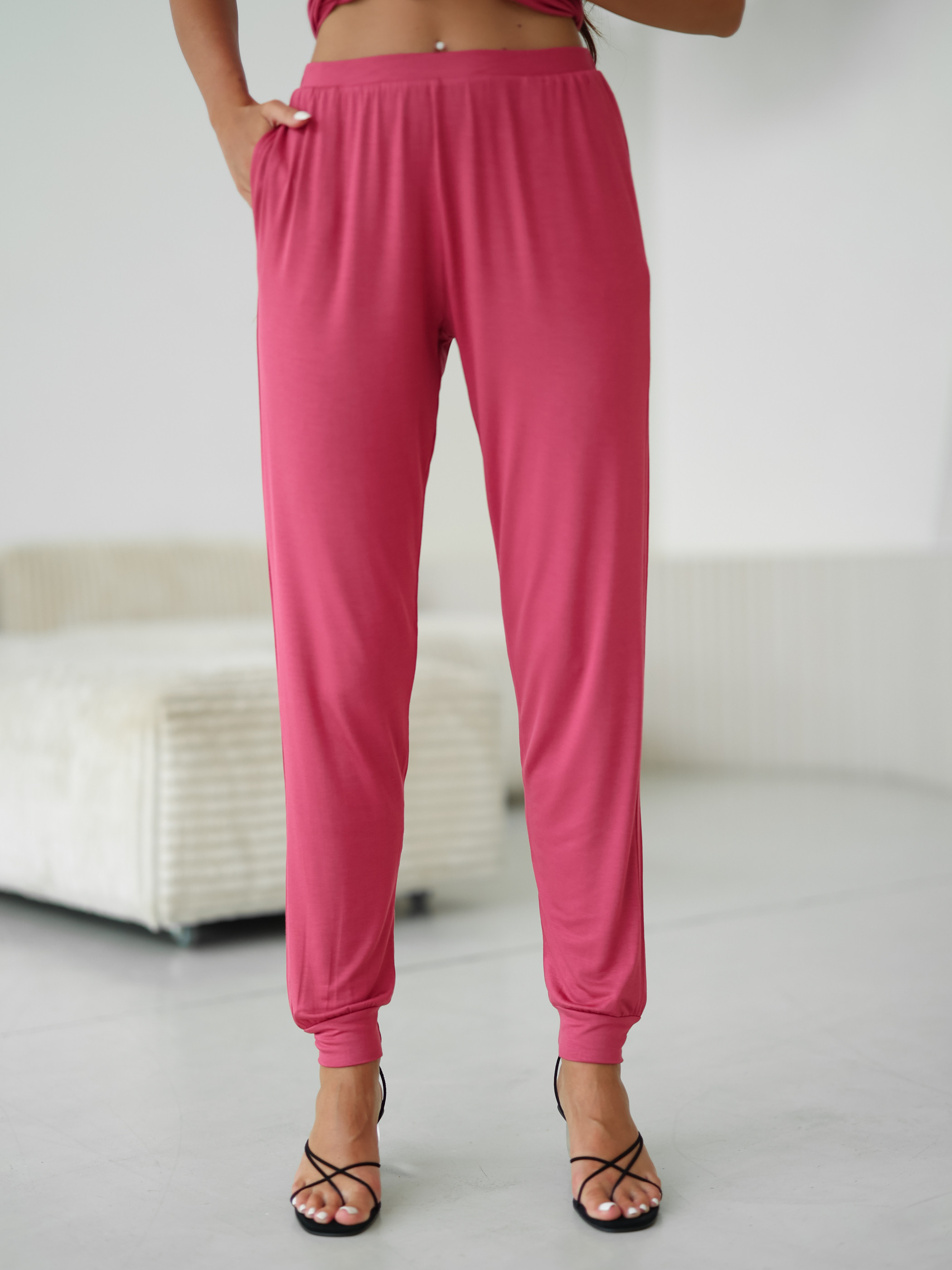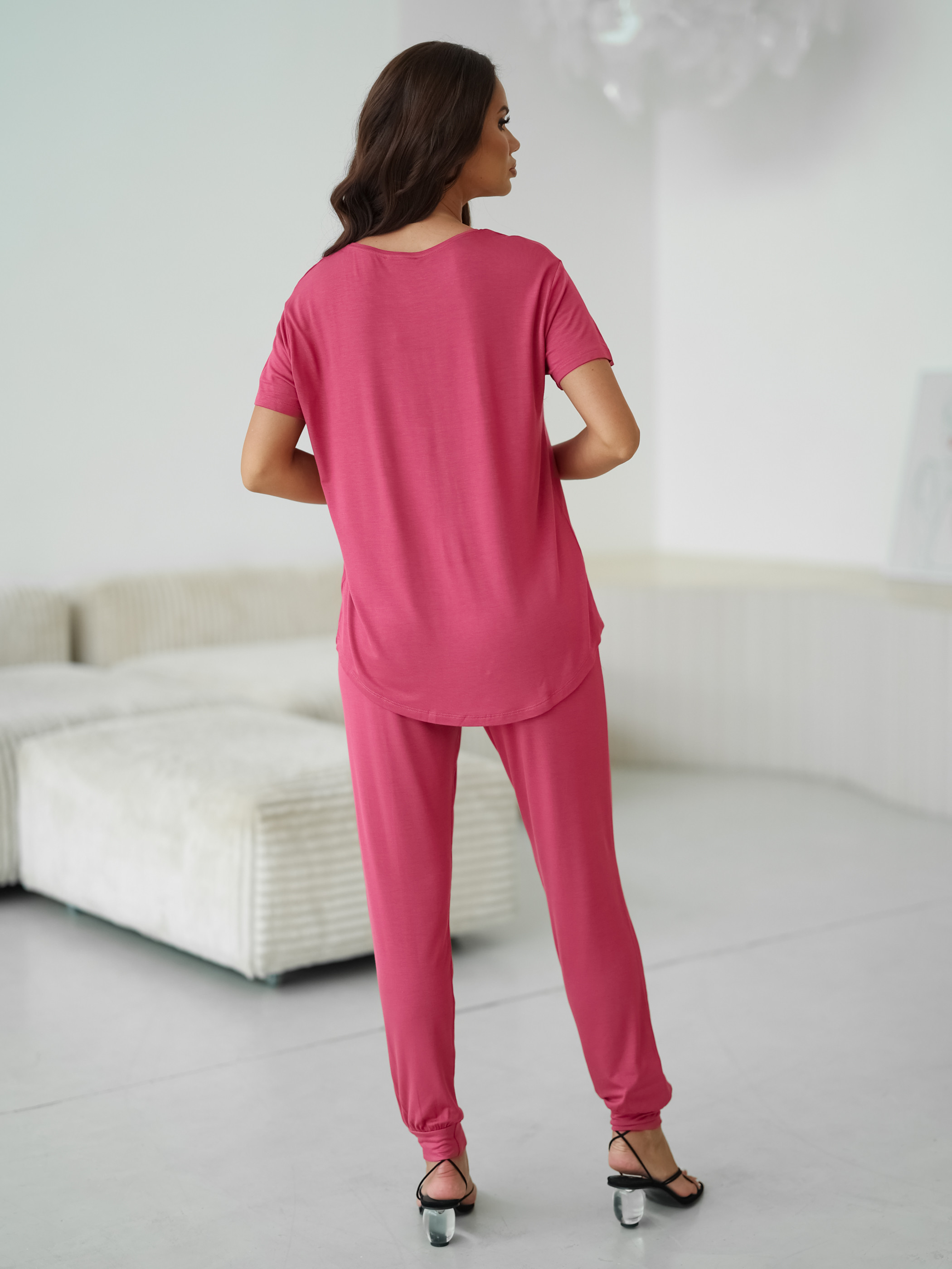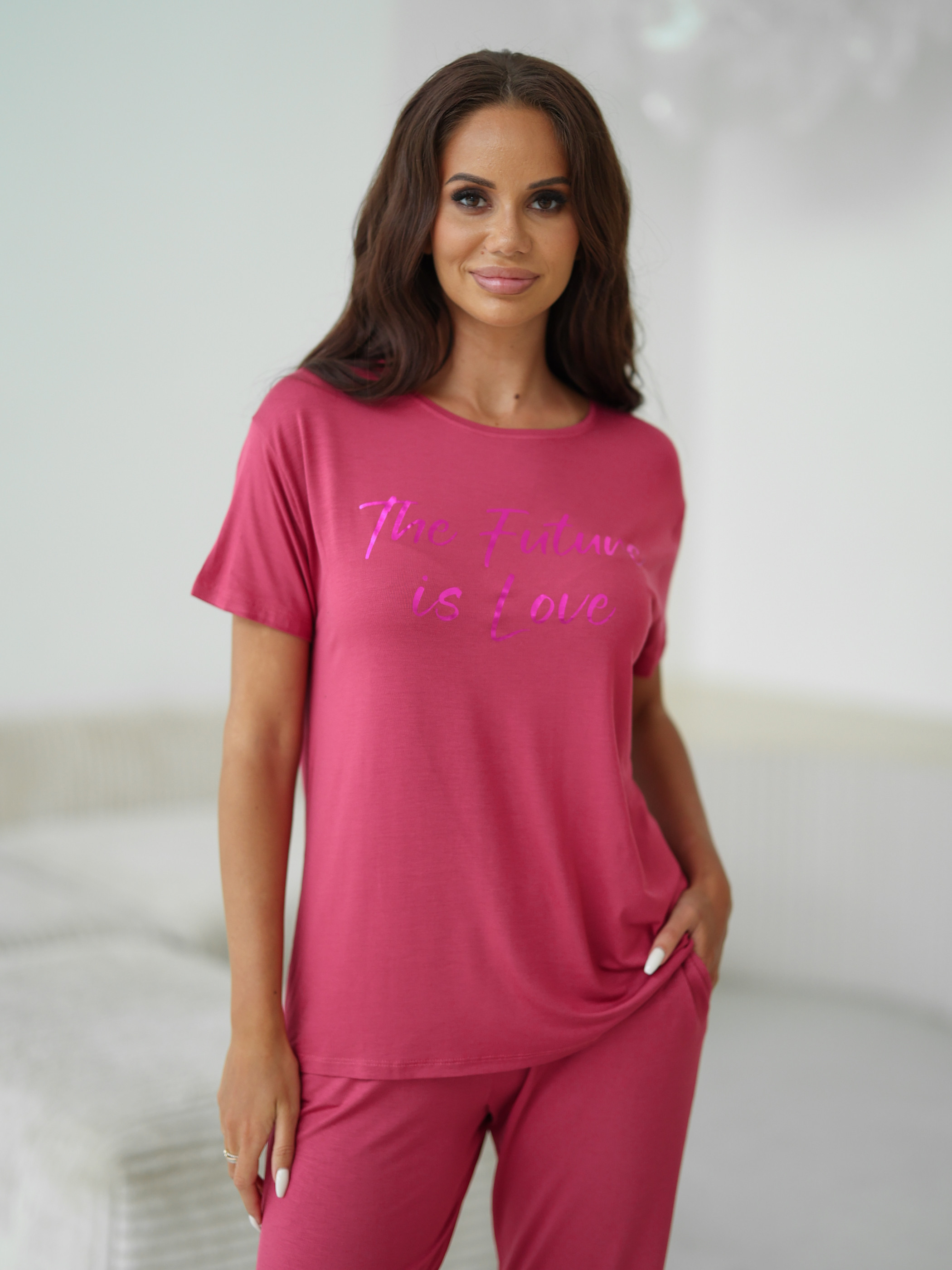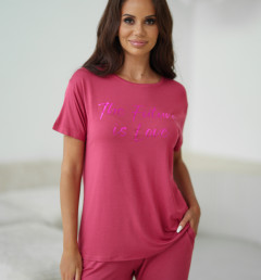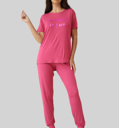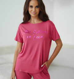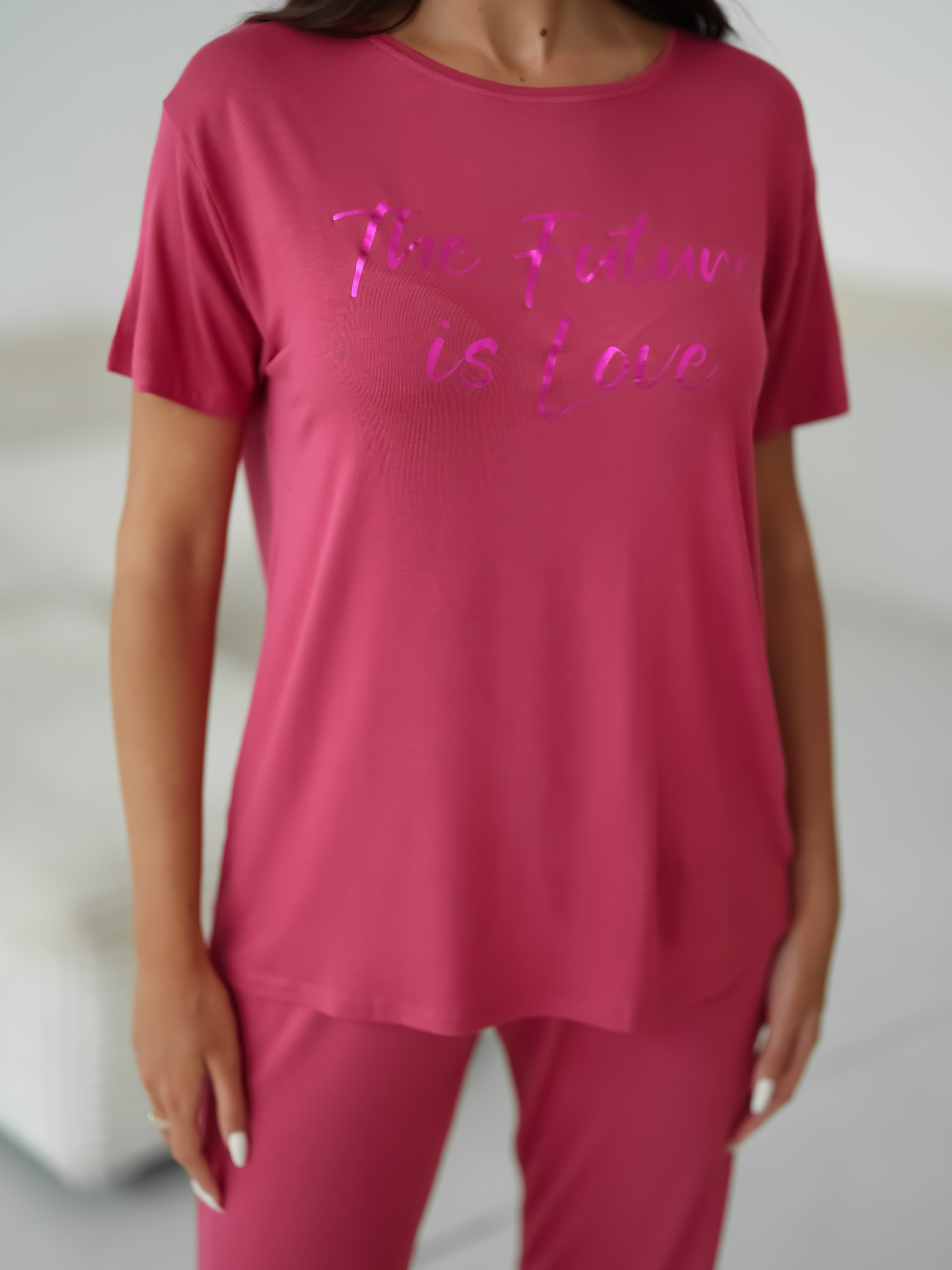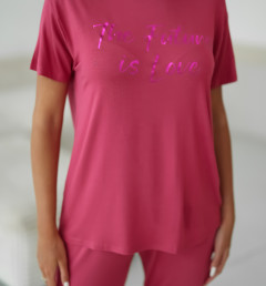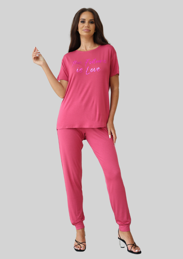 Женский комплект Sevim цвета фуксии: футболка свободного кроя с надписью и обтягивающие штаны. Комплект изготовлен из 100% вискозы.