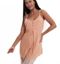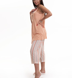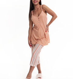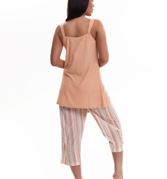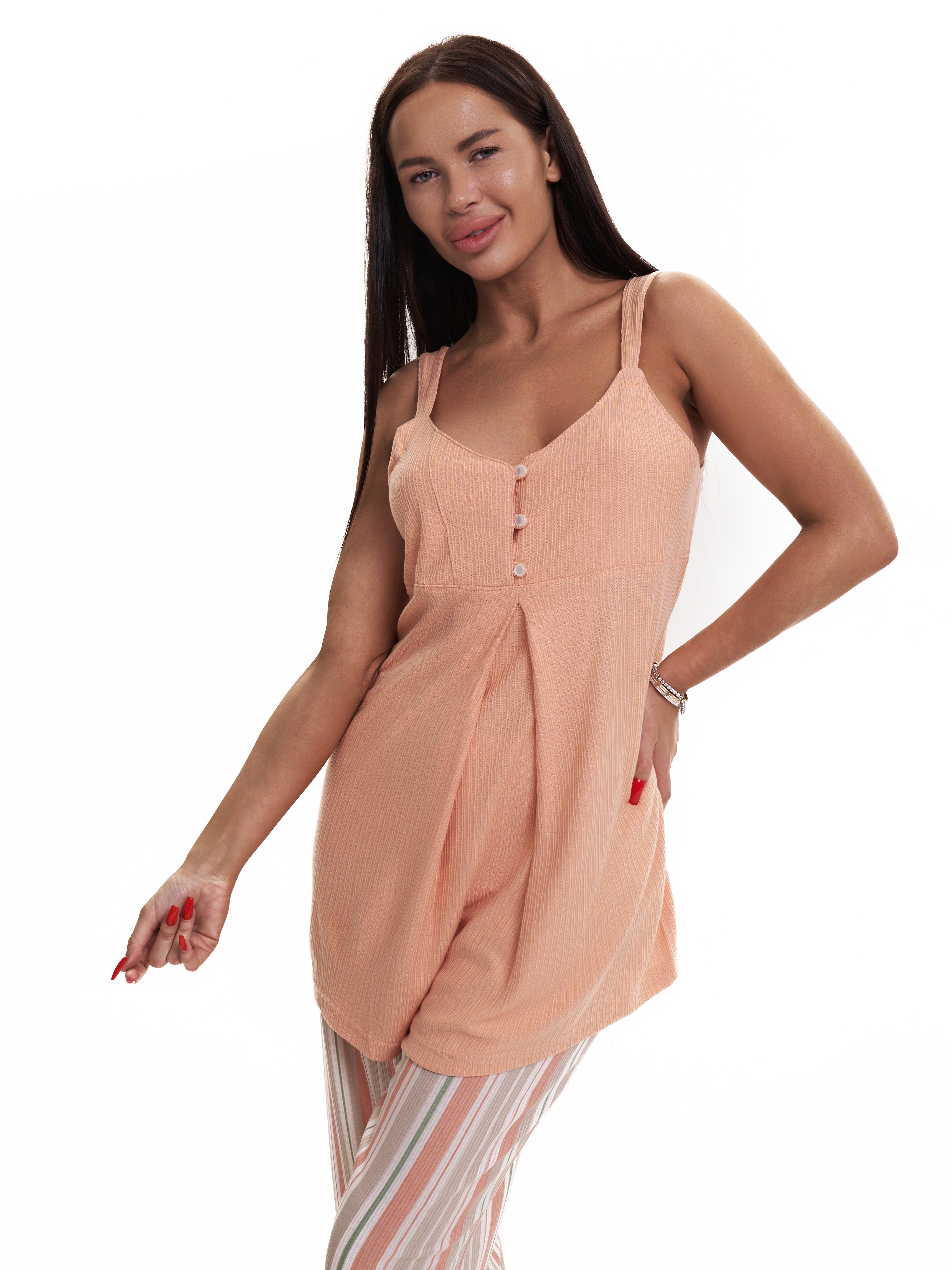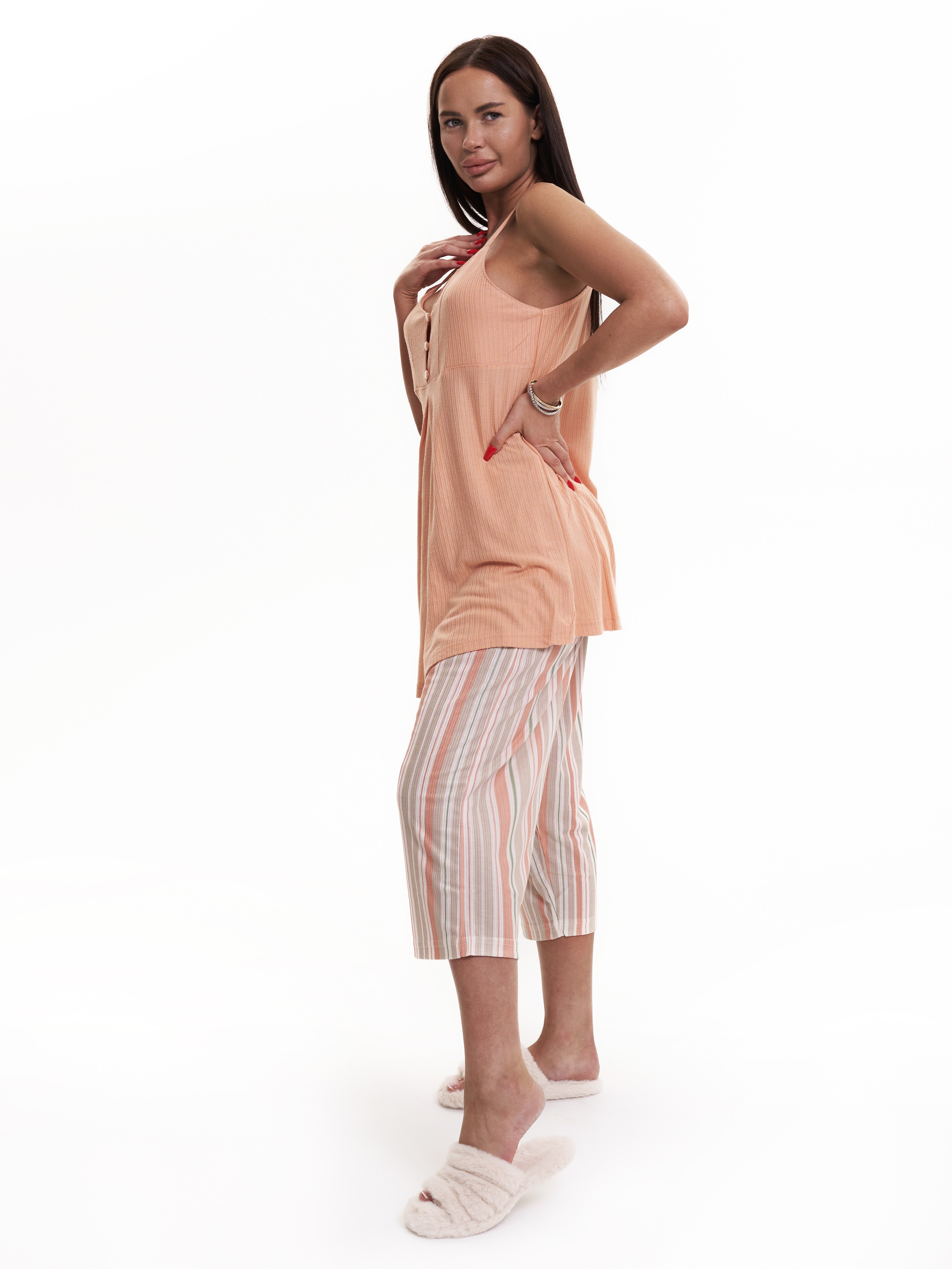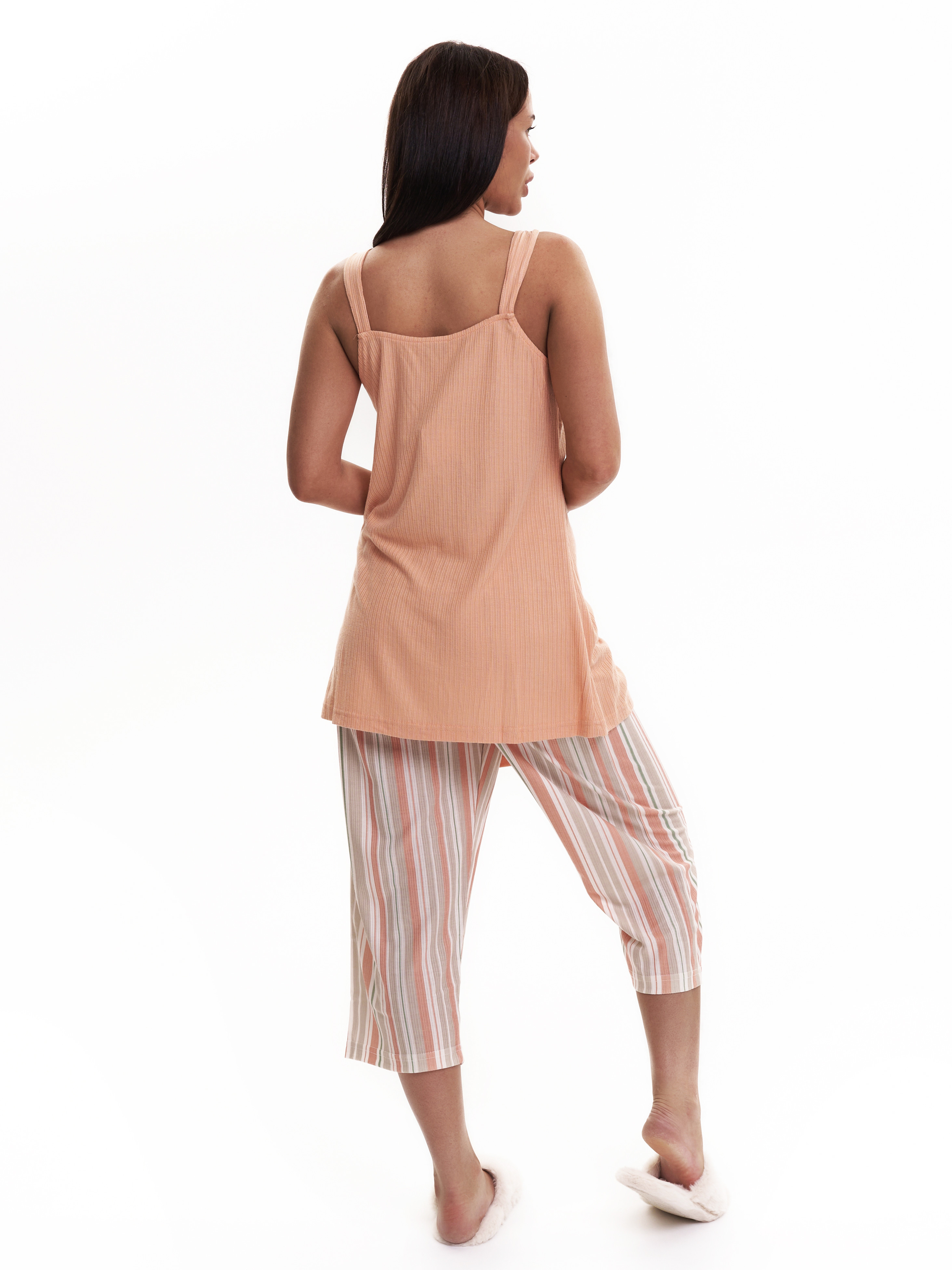 Женский комплект для беременных Berrak персикового цвета: удлиненная футболка на широких лямках и укороченные разноцветные штаны в полоску. Верх изготовлен из 80% вискозы, а низ - из 65%.