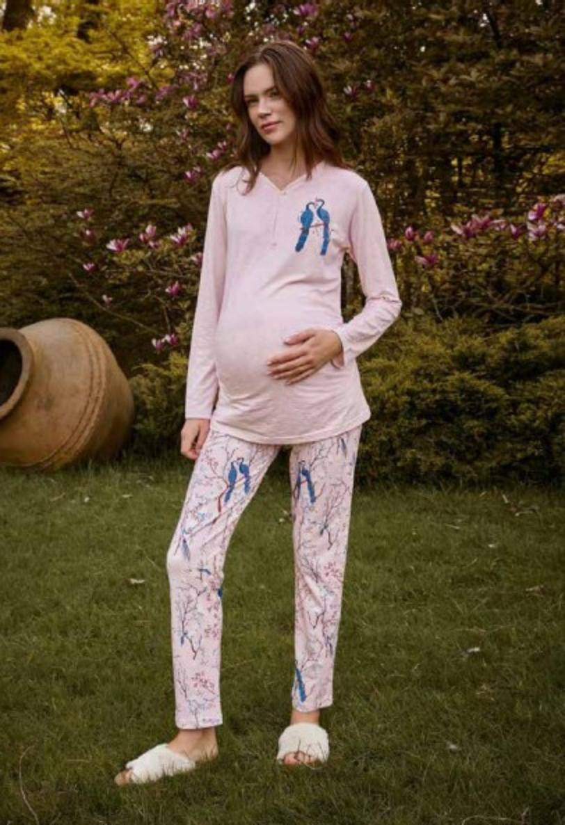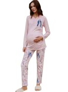 Женский комплект для беременных Berrak светло-розового цвета: лонгслив на пуговицах с небольшим принтом; обтягивающие штаны с принтом.