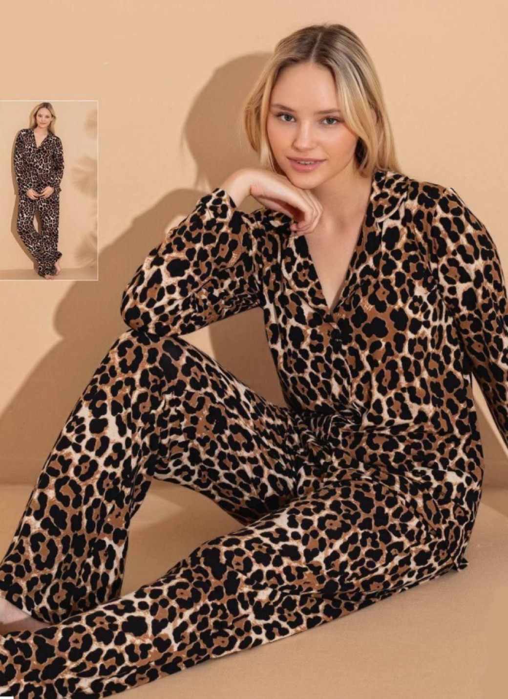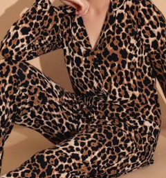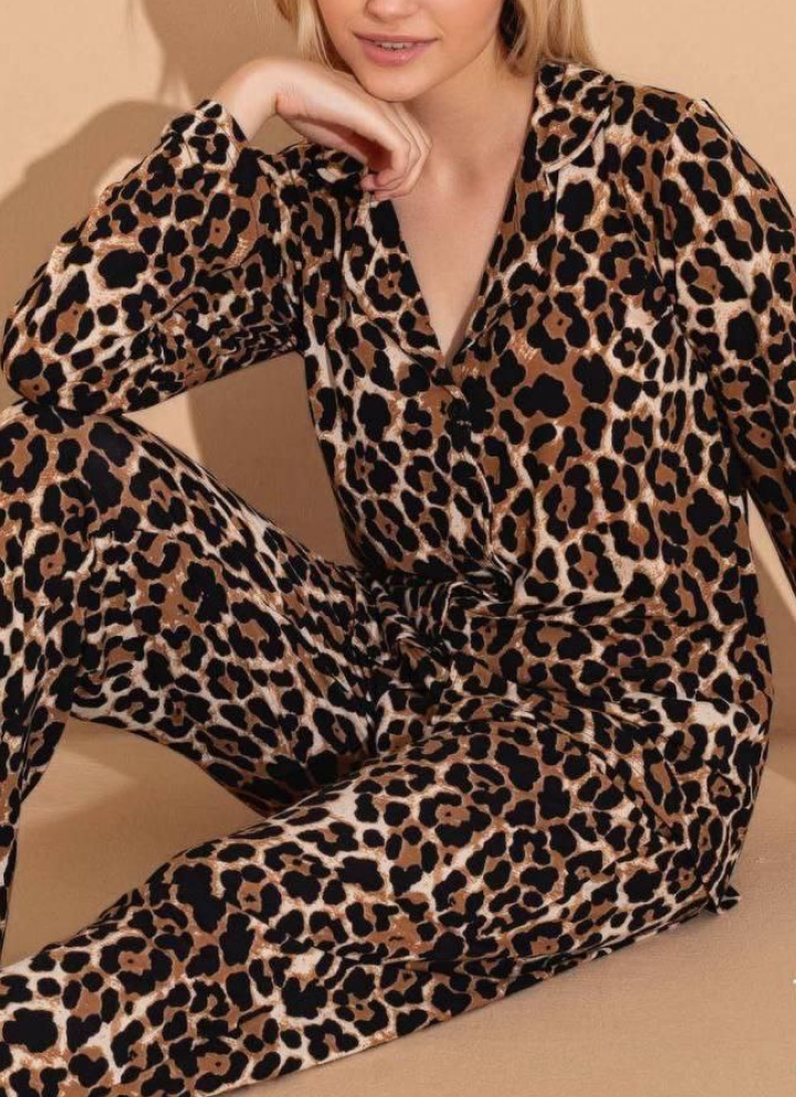 Комплект состоит из рубашки с длинным рукавами и свободных брюк. Рубашка с отложным воротником застегивается на пуговицы, а брюки на резинке обеспечат максимальный комфорт.
