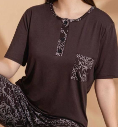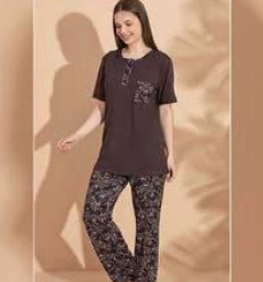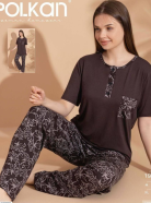 Данная модель женской домашней пижамы выполнена в классическом стиле и предназначена для комфортного отдыха и сна. Она состоит из двух частей: футболки и штанов.