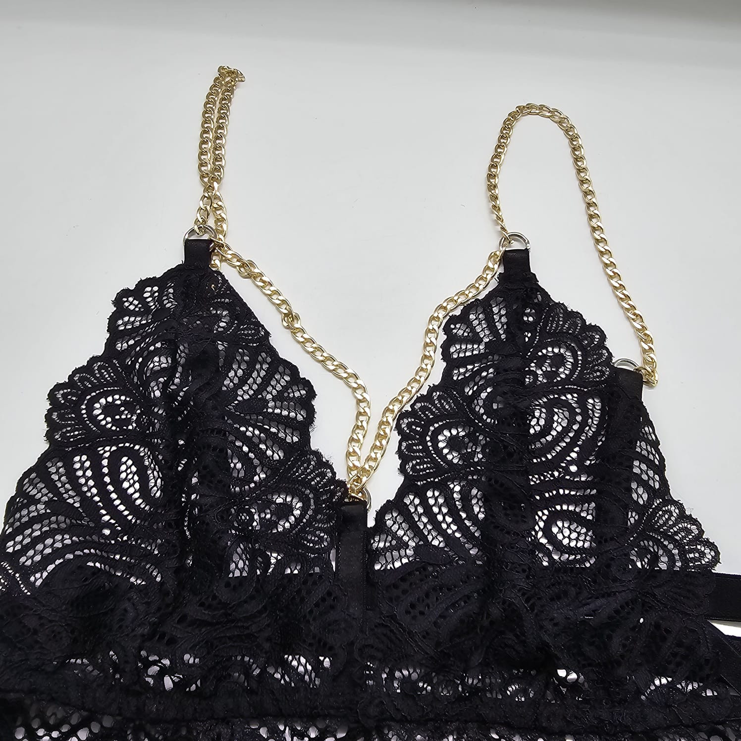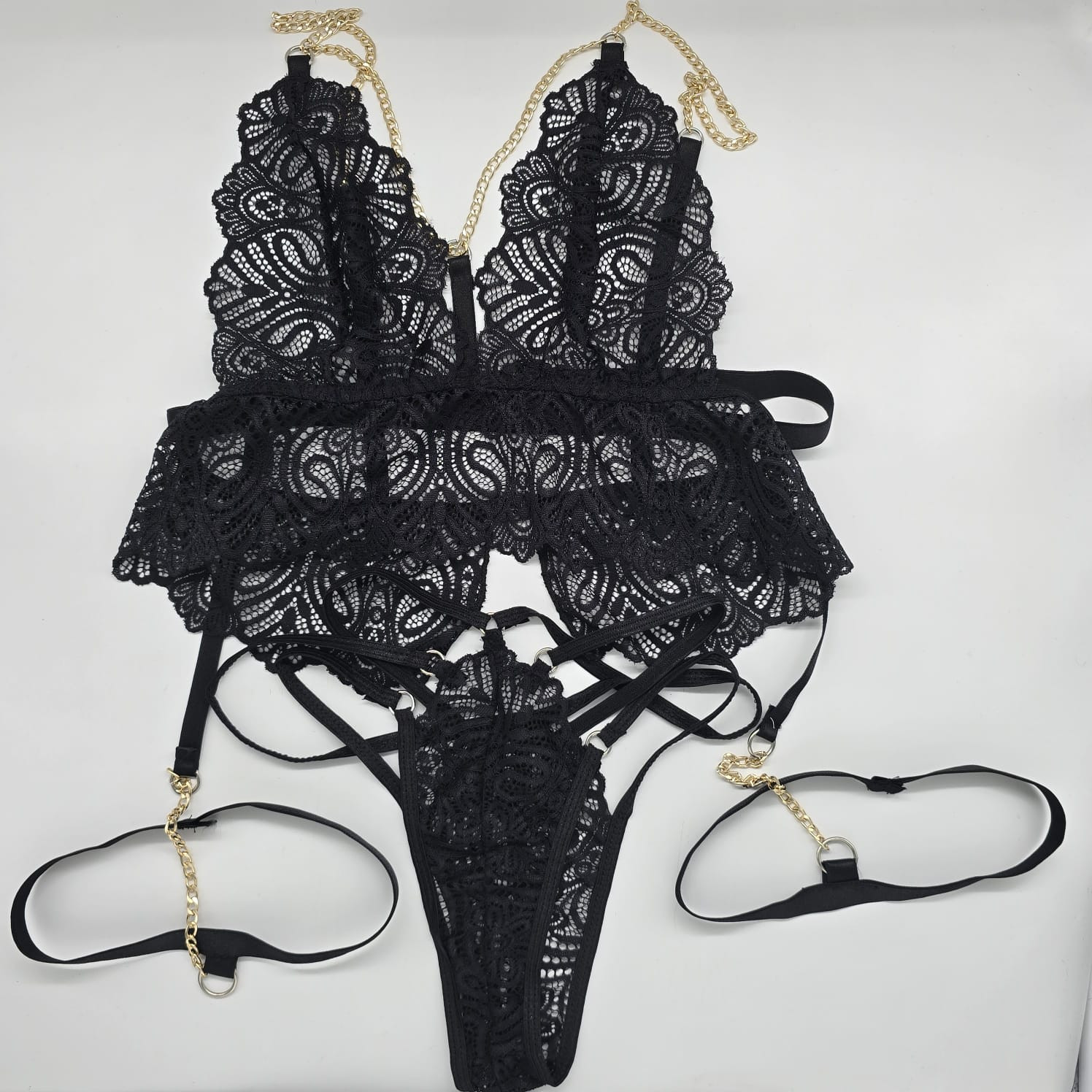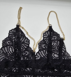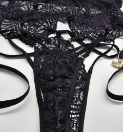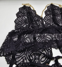 В комплект входит бюстгальтер (без косточек, мягкая прозрачная чашка), трусики и повязка на пояс и ноги