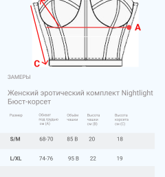 В комплект входит бюст-корсет (на косточках) и трусики стринги, регулируемые по объему талии. Бюст S/M - объём чашки 80, 85 B; L/XL - объём чашки 95 B.