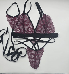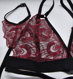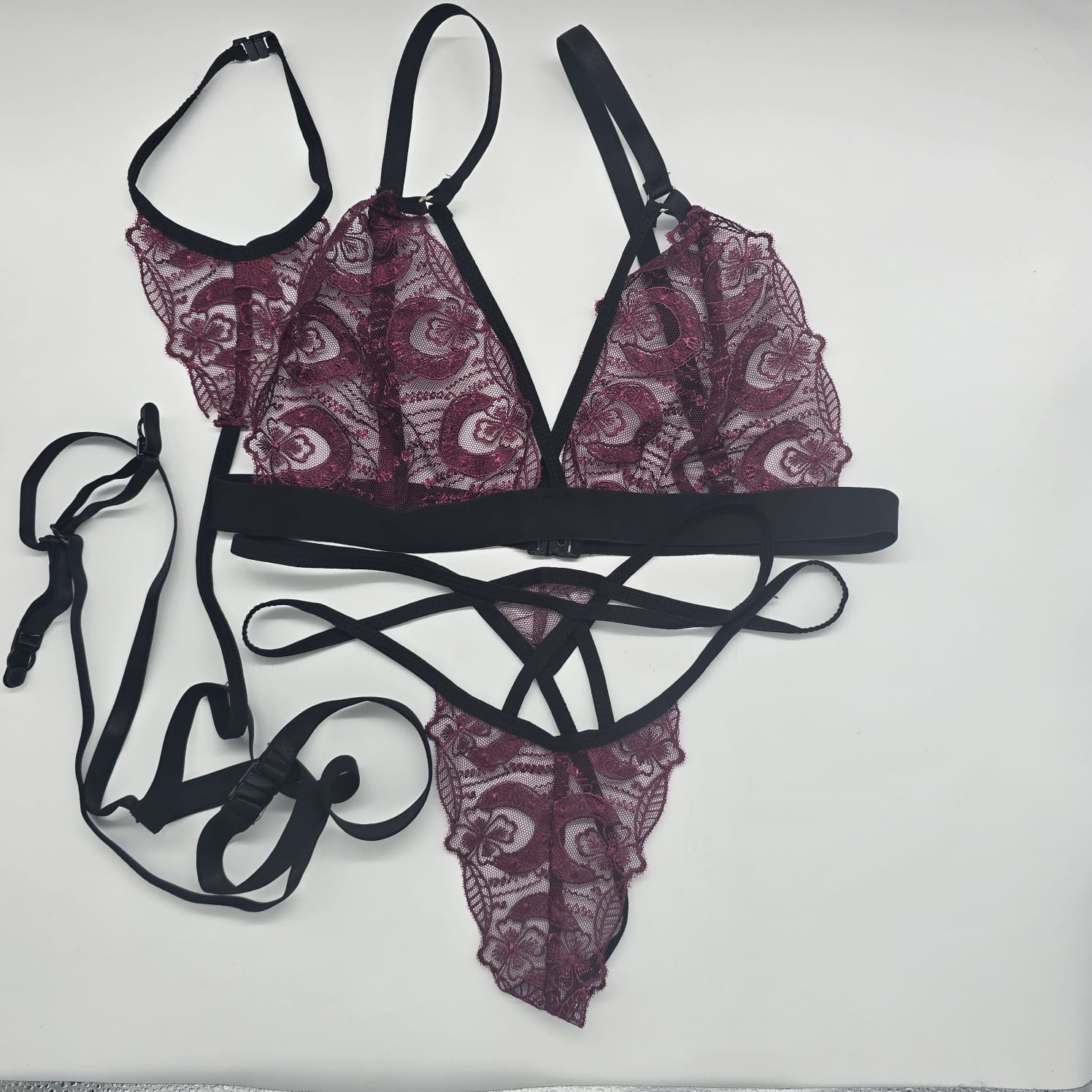 В комплект входит бюст-без косточек, на тонких бретельках, трусики и пояс-подвязка на талию и шею. Чулки входят в комплект!