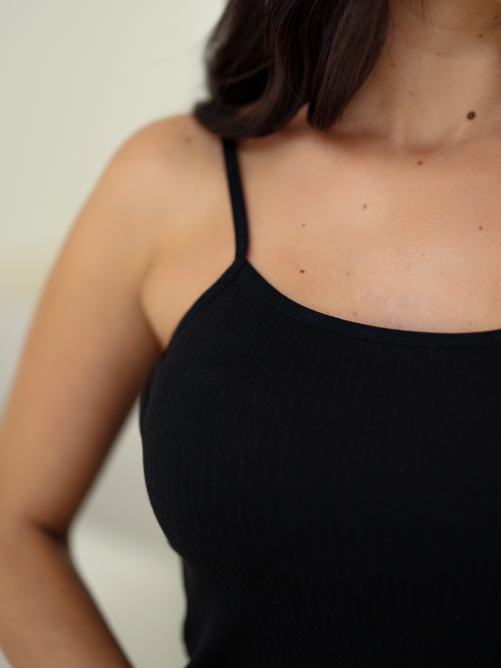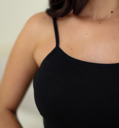 Женский комплект Berrak черного цвета: приталенная майка на тонких лямках и трусики. Ткань в рубчик. Комплект изготовлен из 50% хлопка pamuk и 50% модала.