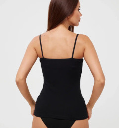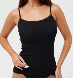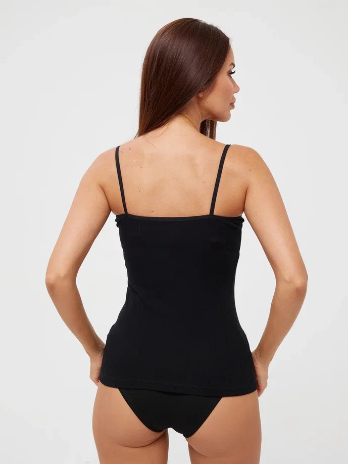 Женская майка Berrak черного цвета на тонких бретелях. Приталенная, ткань с узором. Майка изготовлена из 95% хлопка pamuk и 5% эластана.