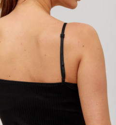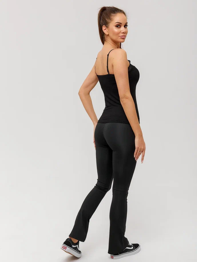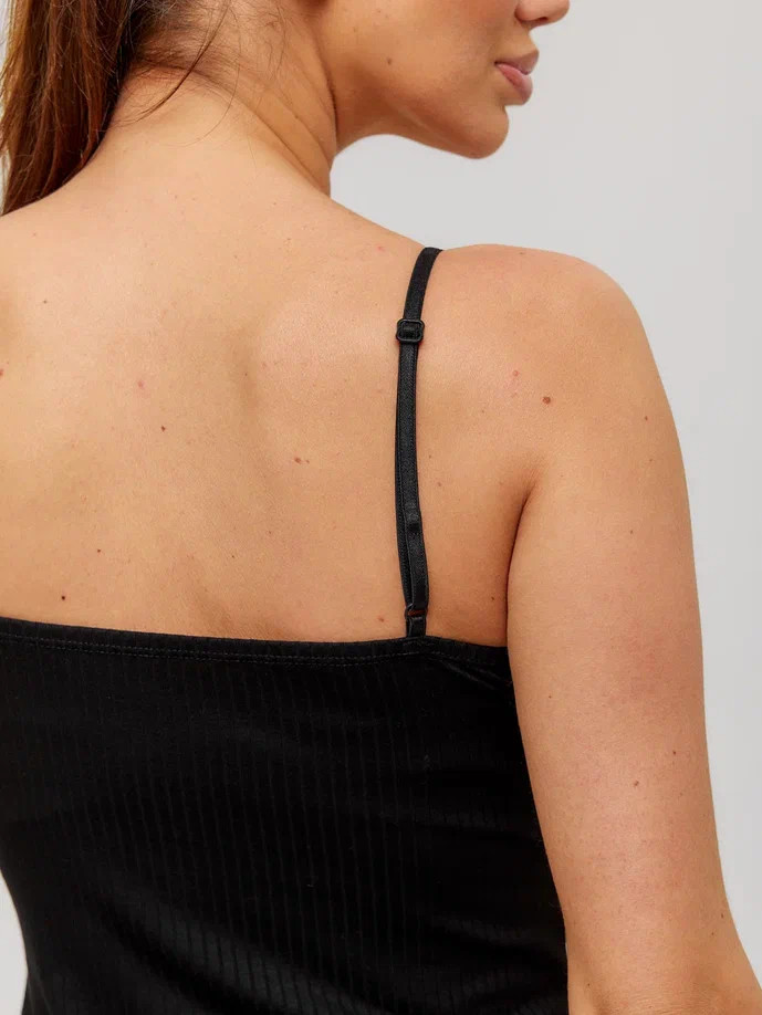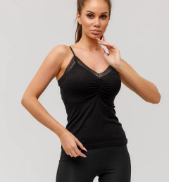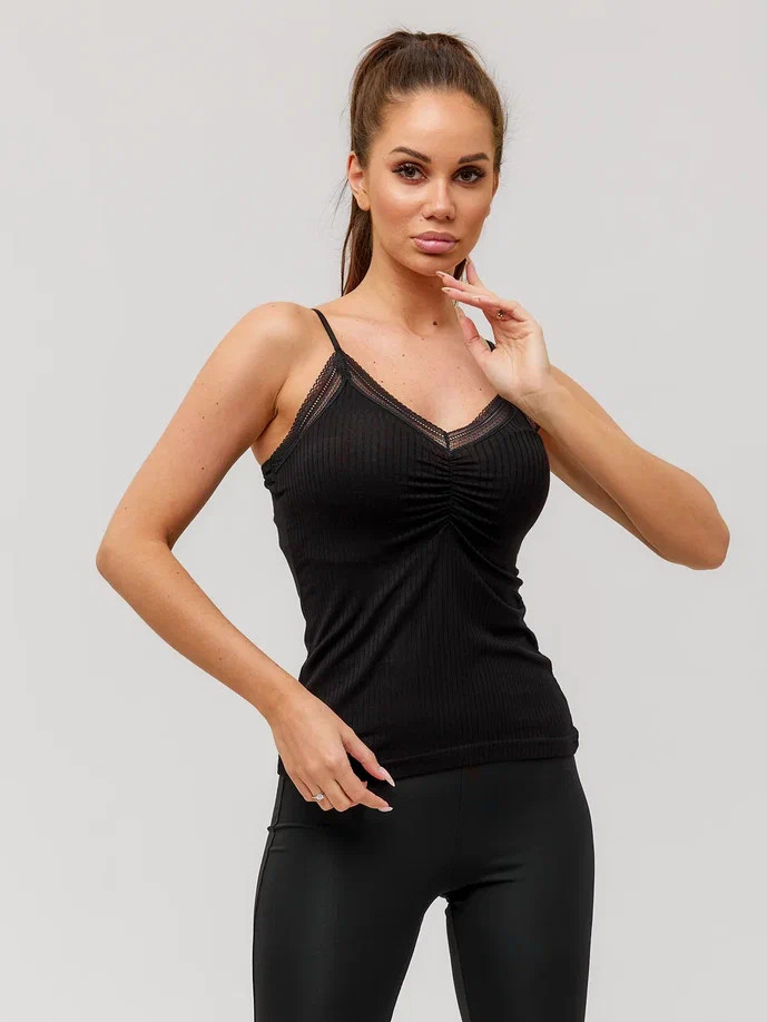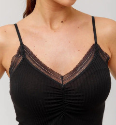 Женская майка Berrak черного цвета на тонких регулируемых бретелях с V-образным вырезом. Есть ажурные вставки на лифе. Майка изготовлена из 92% вискозы и 8% эластана. Вязка кружева может отличаться от кружева на фото.