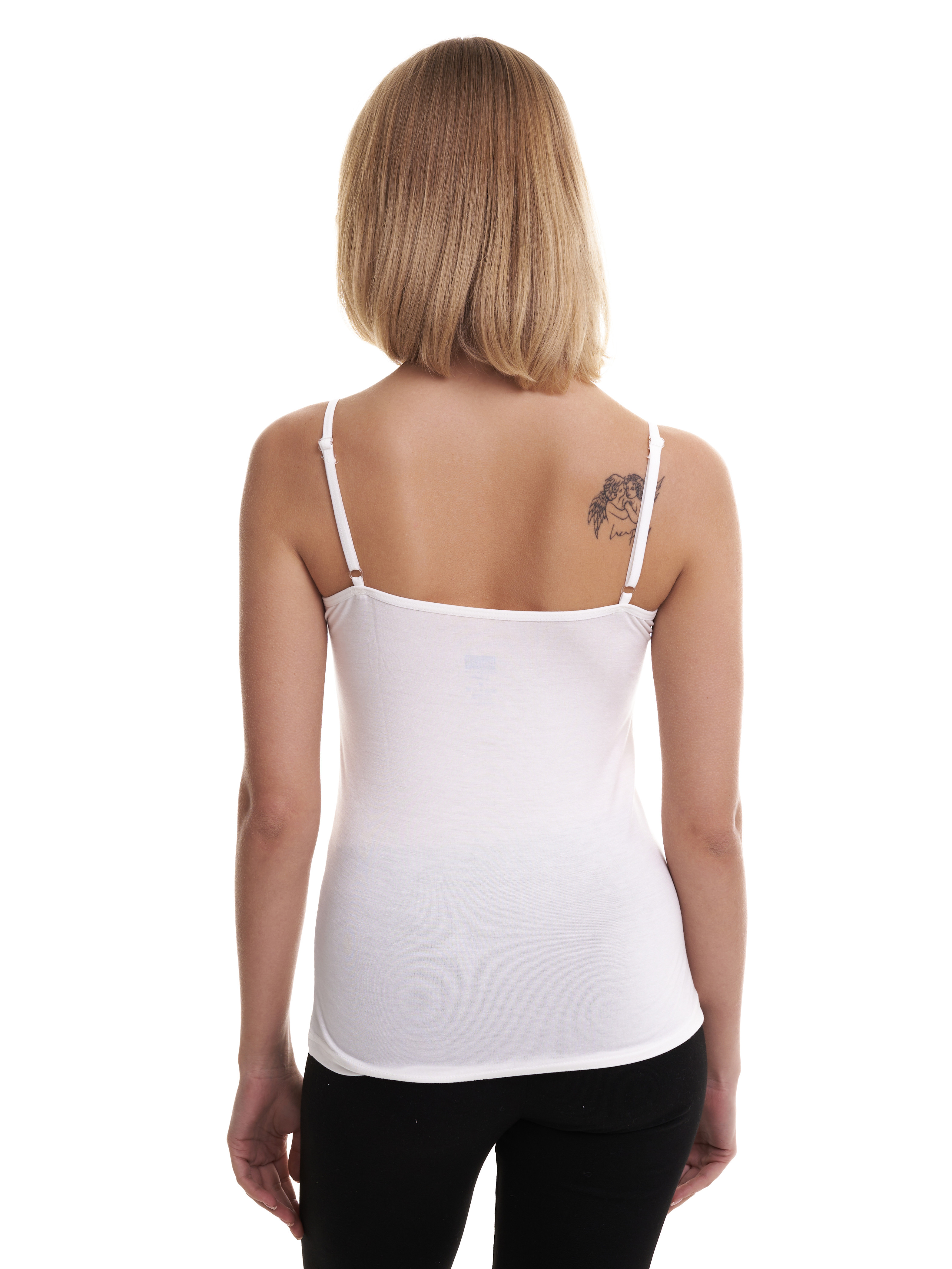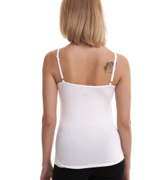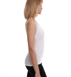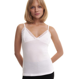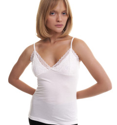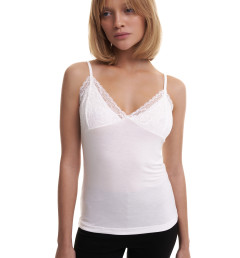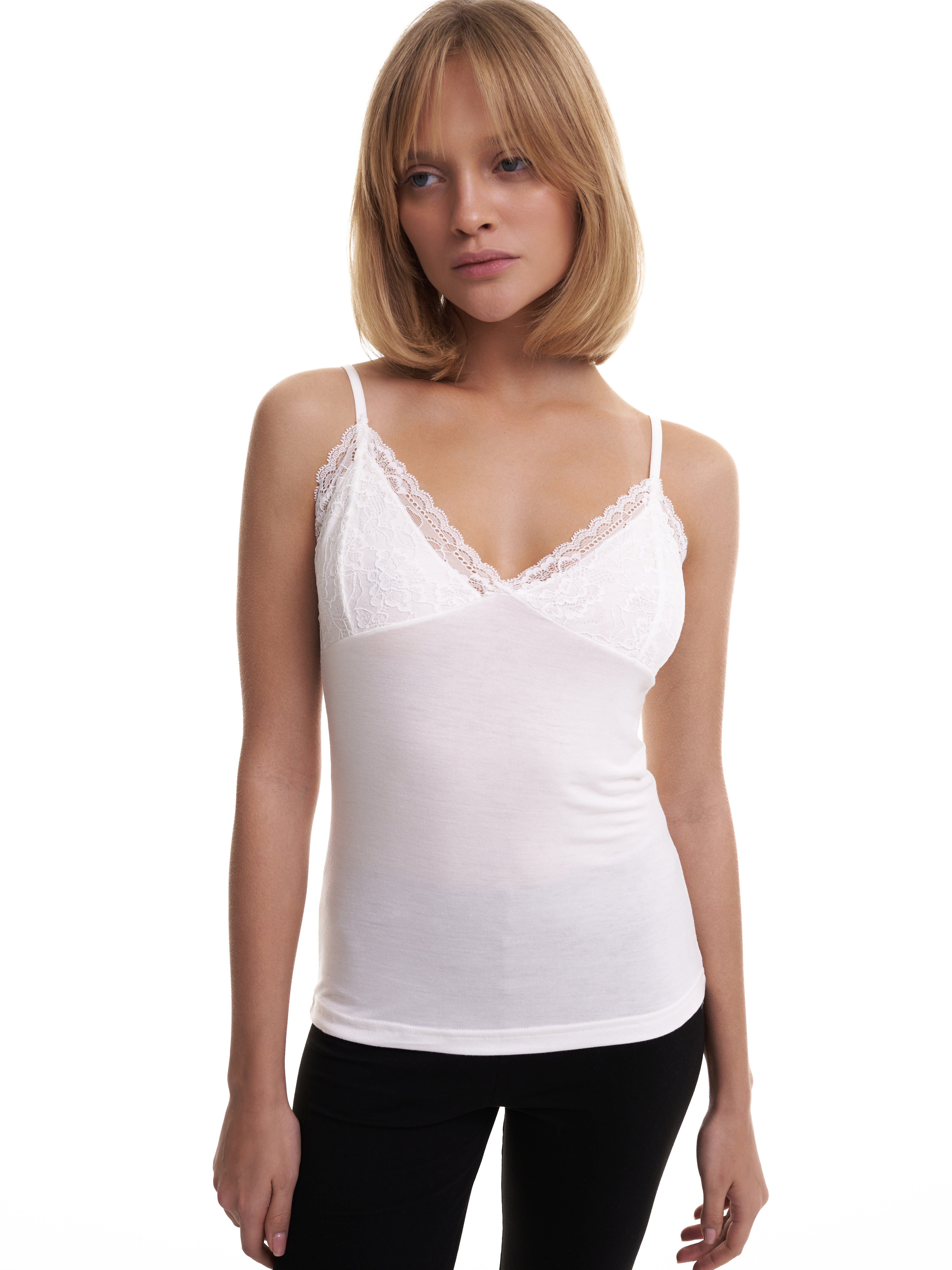 Майка на тонких регулируемых бретелях с декоративной ажурной вставкой по краю верха изделия.