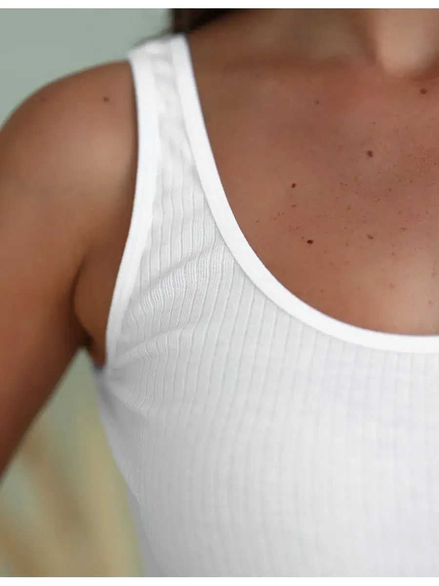 Женская майка Berrak белого цвета на широких лямках с классической спиной. Приталенная. Ткань в рубчик. Майка изготовлена из 50% хлопка pamuk и 50% модала.