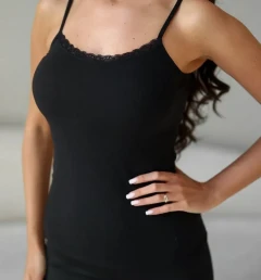Женская майка Berrak черного цвета на тонких лямках с классической спиной. Есть кружево по краю горловины. Приталенная. Ткань в рубчик. Майка изготовлена из 92% вискозы и 8% эластана.