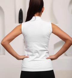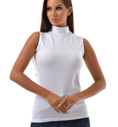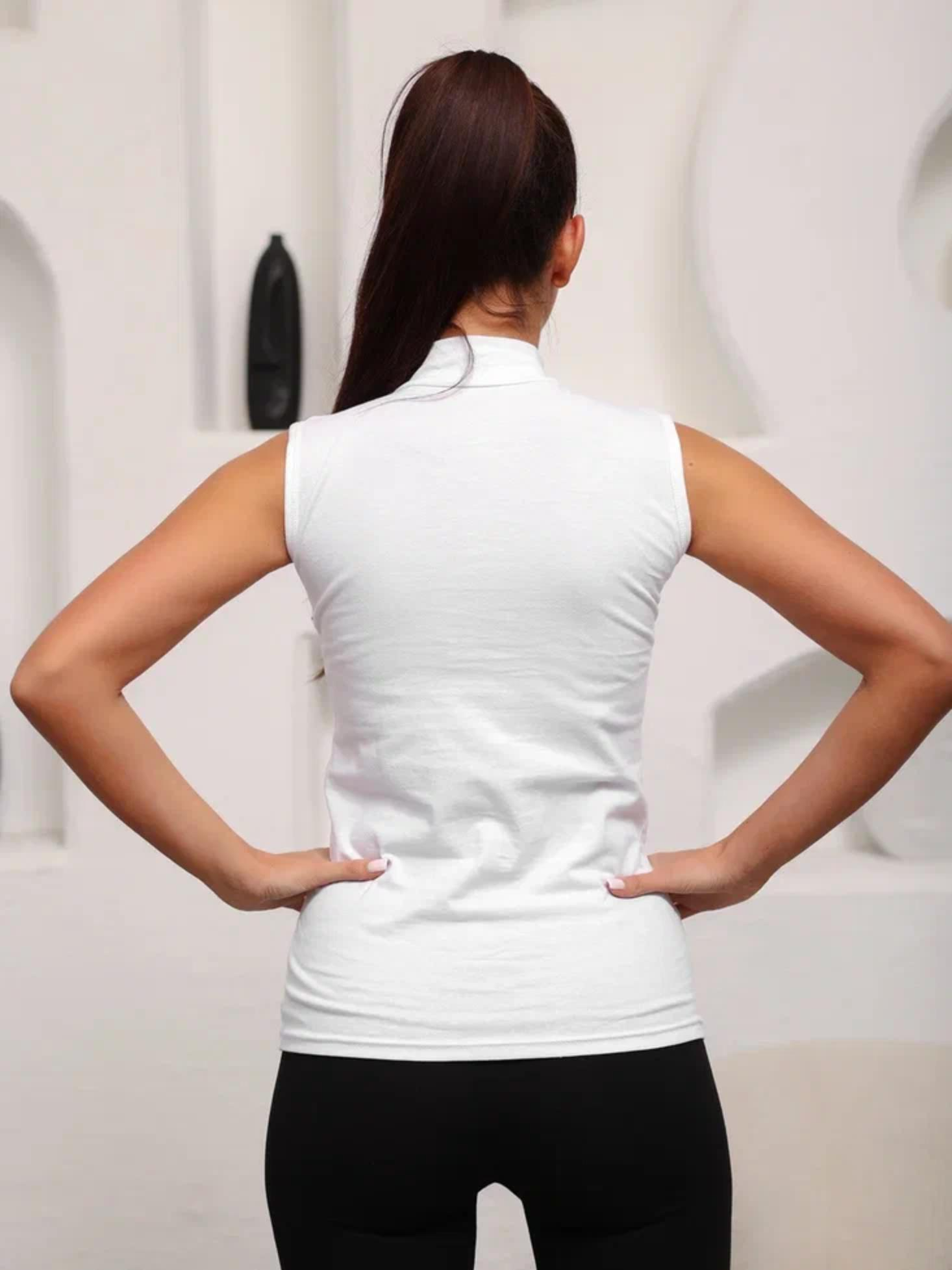 Женская майка Kota белого цвета со стойкой-воротничком. Слегка приталенная. Майка изготовлена из 93% хлопка и 7% эластана.
