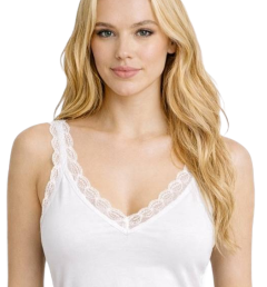 Элегантная майка выполнена из натуральной вискозы, обеспечивающей комфорт и легкость. Приталенный силуэт подчеркивает фигуру, а V-образный вырез украшен изящной ажурной отделкой, придающей изделию особый шарм и утонченность. Майка идеально подойдет для повседневного стиля, создавая гармоничный ансамбль с джинсами, юбками или брюками.