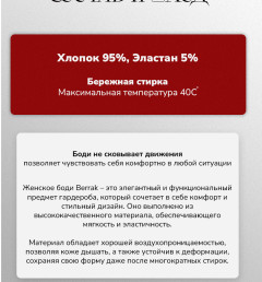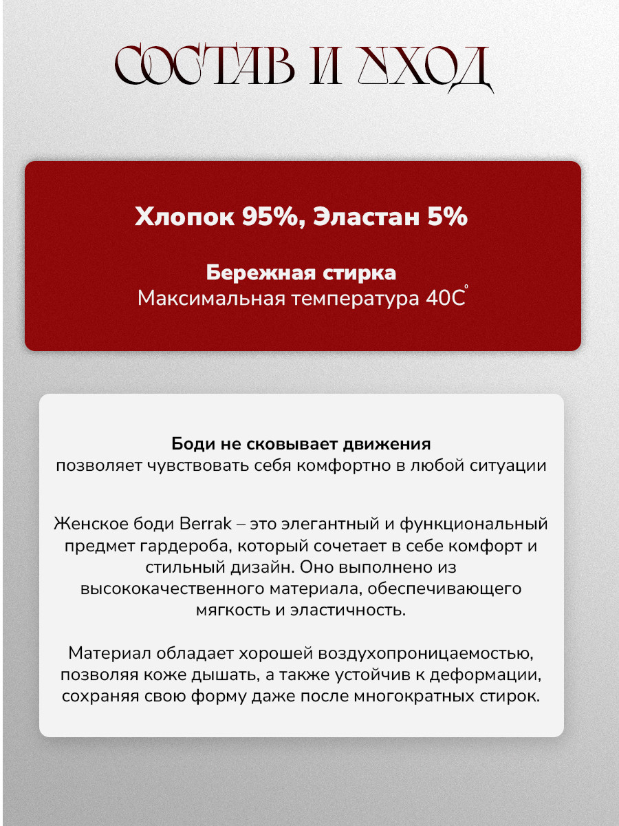 Женское боди Berrak – это элегантный и функциональный предмет гардероба, который сочетает в себе комфорт и стильный дизайн. Оно выполнено из высококачественного материала, обеспечивающего мягкость и эластичность, благодаря чему идеально сидит на фигуре, подчеркивая её достоинства. Боди имеет классический вырез горловины, длинные рукава и застежку внизу, что делает его удобным для повседневной носки. Материал обладает хорошей воздухопроницаемостью, позволяя коже дышать, а также устойчив к деформации, сохраняя свою форму даже после многократных стирок.