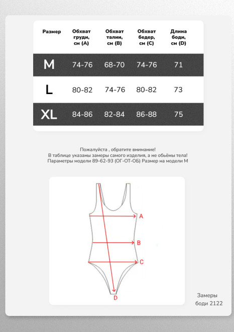 29.04.2025Идеальное боди по низкой цене, выбирала между им и боди в 2 раза дороже, сделала выбор в пользу этого. Не просвечивает (даже если без лифчика), облегает -