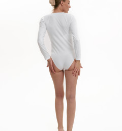 Классическое женское боди Kota белого цвета с длинными рукавами. Удобное крепление в виде 2 крючков. Боди изготовлено из 93% хлопка и 7% эластана.