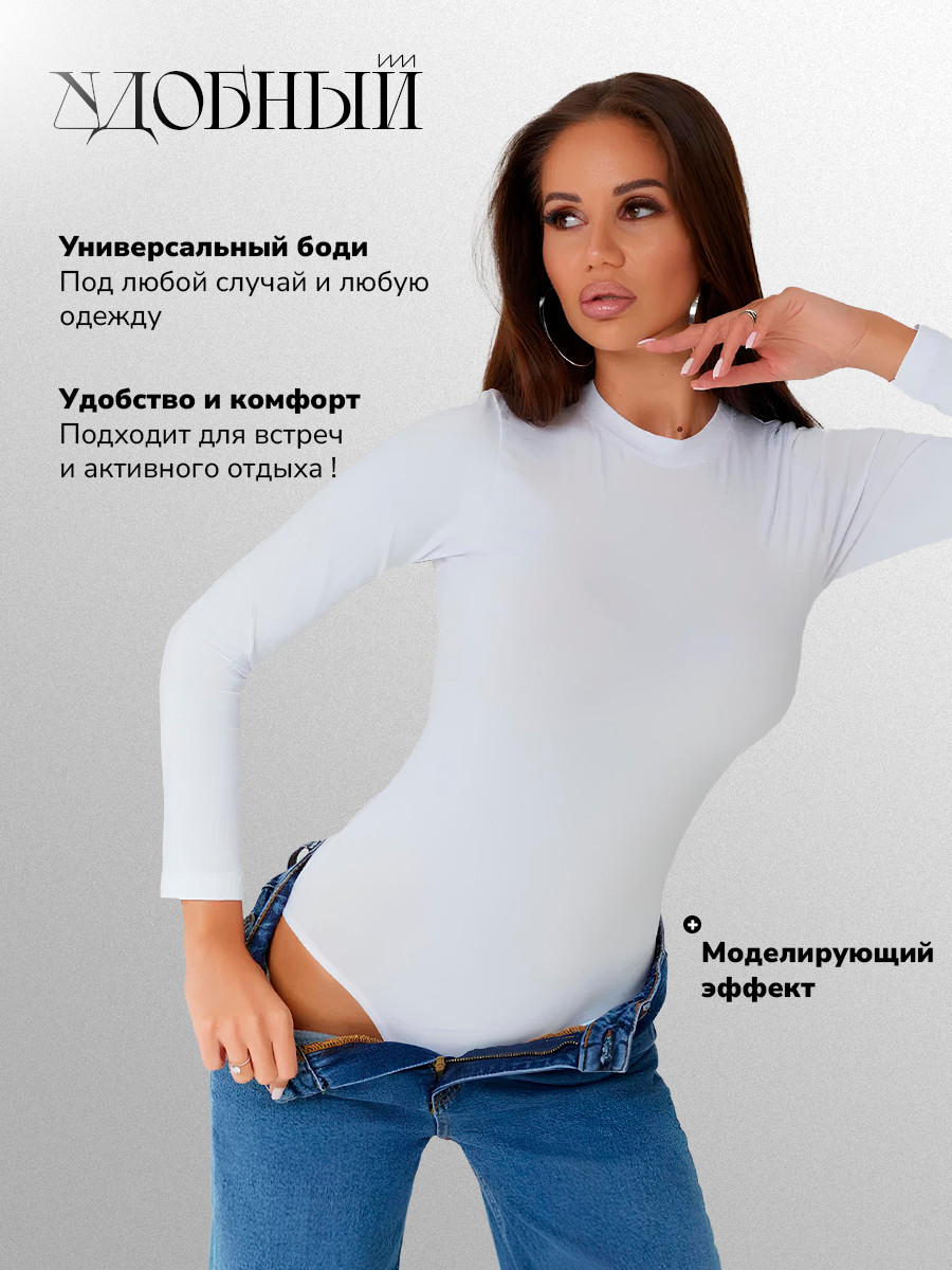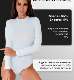 Элегантное боди с длинным рукавом белого цвета на 95% состоящее из хлопка – это невероятно красивое утонченное изделие, которое будет приятно прилегать к телу и окутывать Вас комфортом. Удобное крепление в виде 3 крючков сконструировано таким образом, чтобы Вы не чувствовали его во время носки и могли насладиться свободой движения.