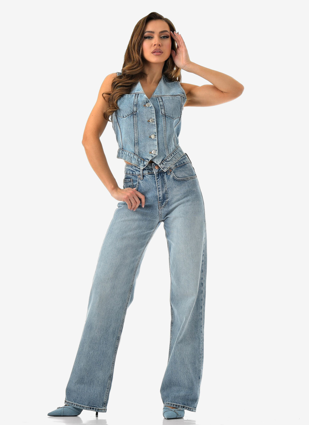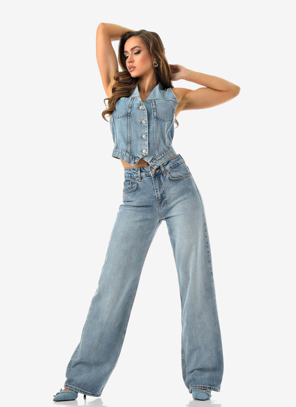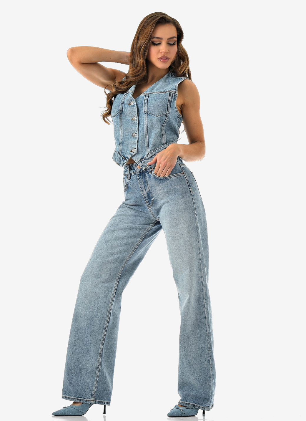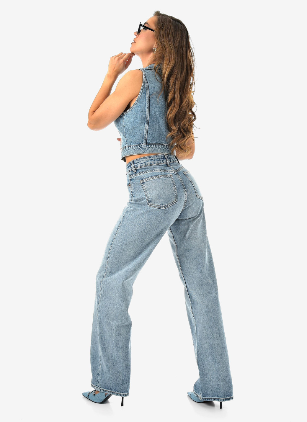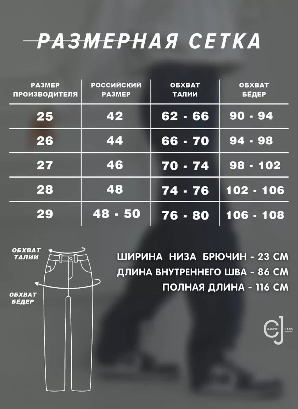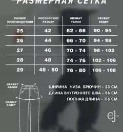 Параметры 25 размера. Полная длина 116, по внутреннему шву 86, ширина низа брючин 23 см. Рост модели на фото 173 см.