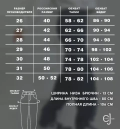 Длина изделия 104 см, длина по внутреннему шву 77 см. Размер на модели 27. состав: хлопок 98%, эластан 2%.