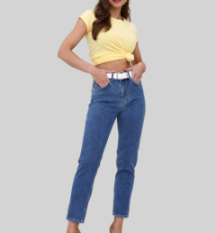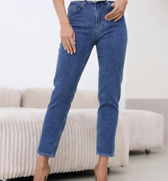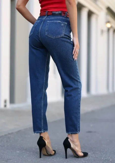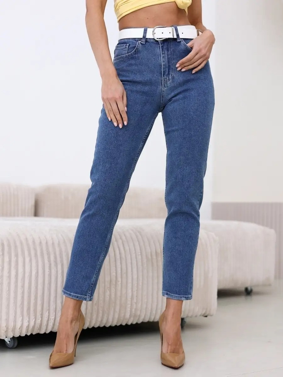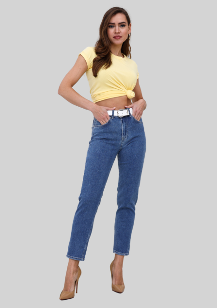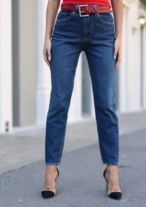 Джинсы женские МОМ с высокой посадкой и потертостями по краю брючин и карманах.
