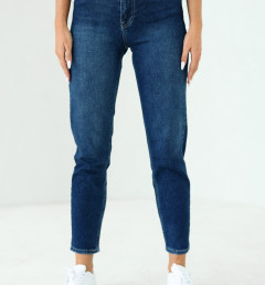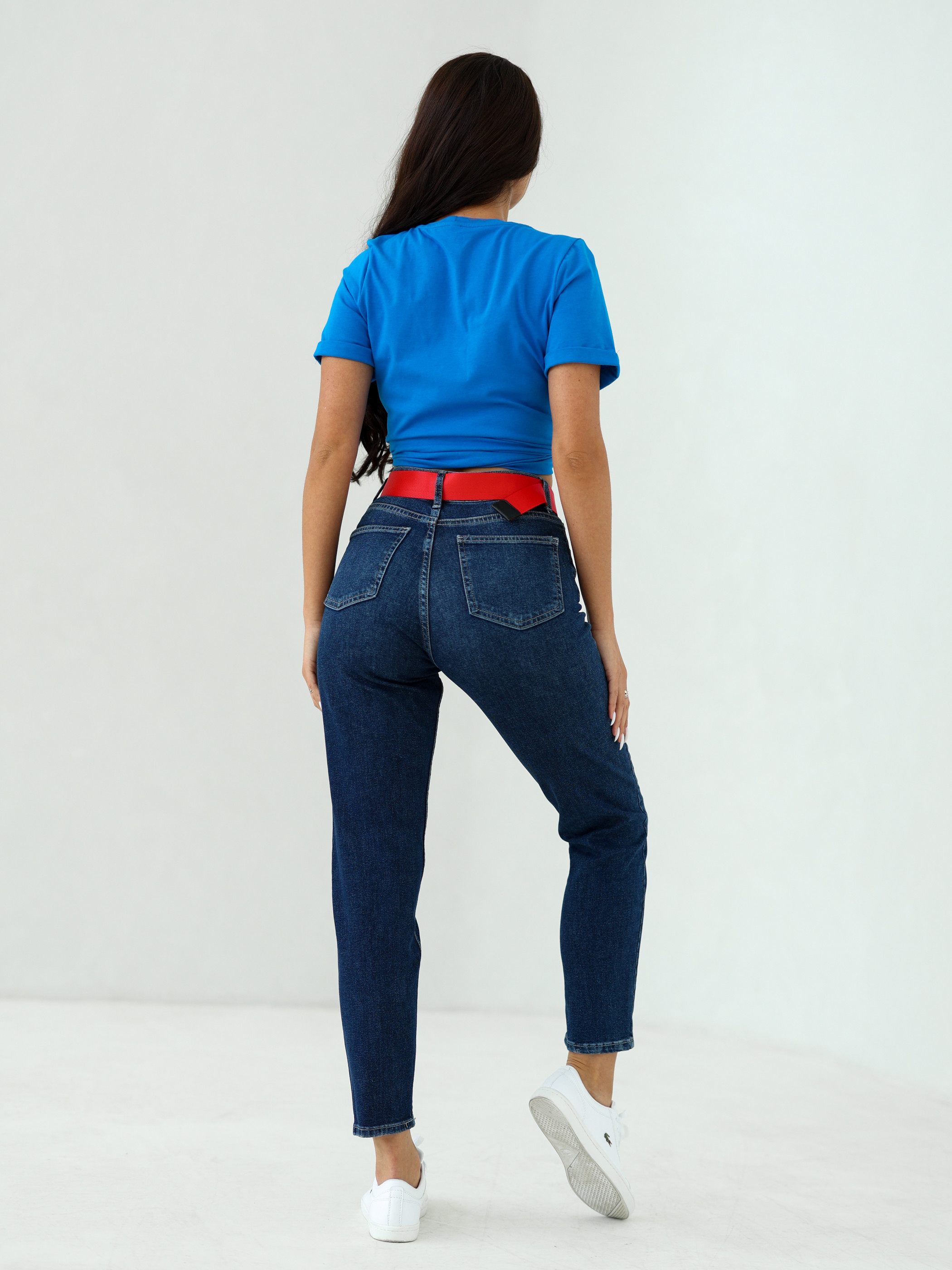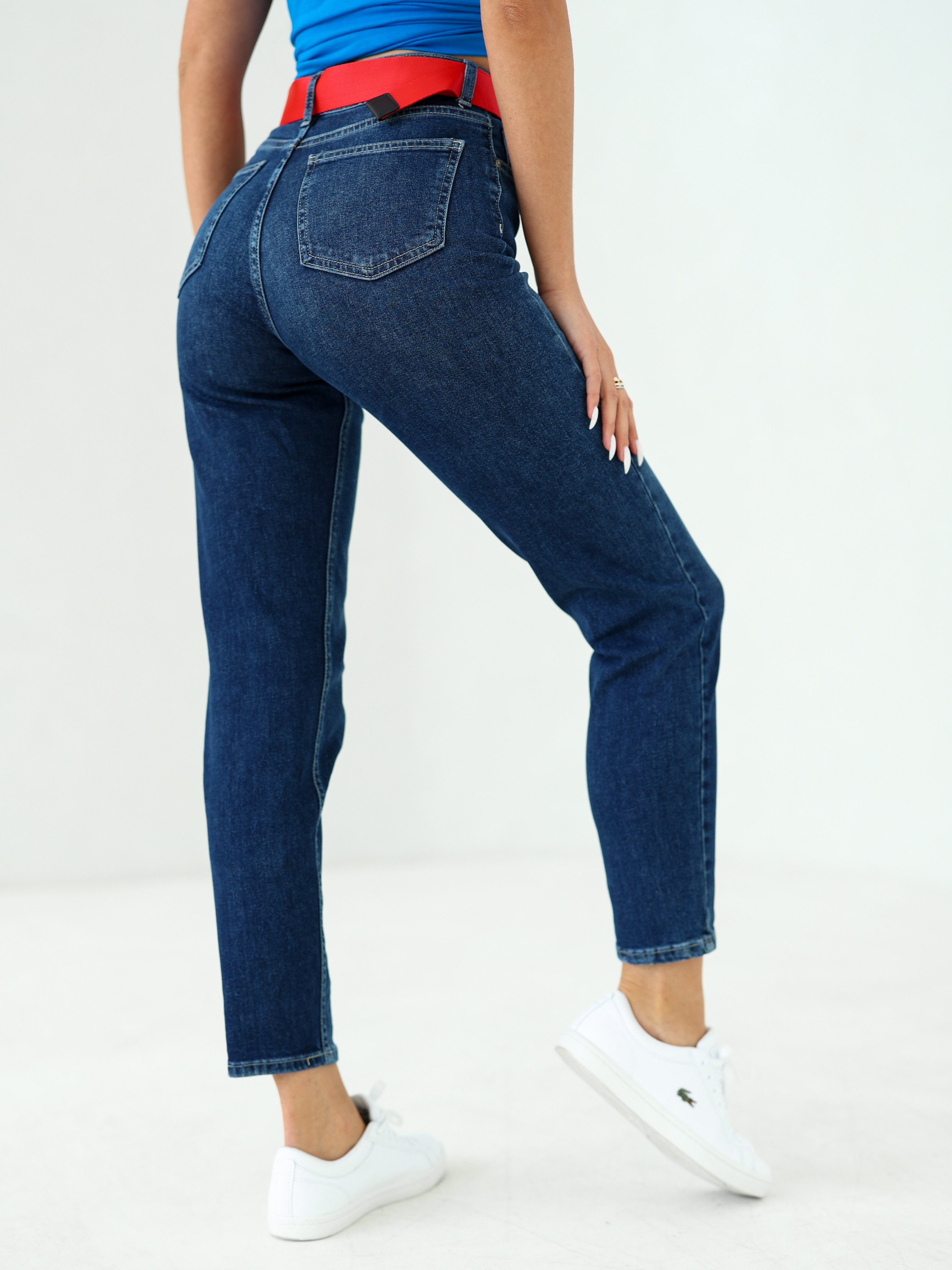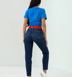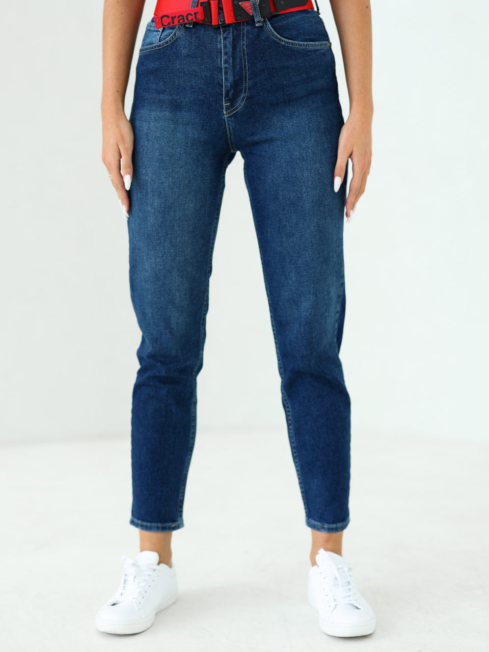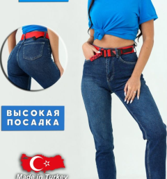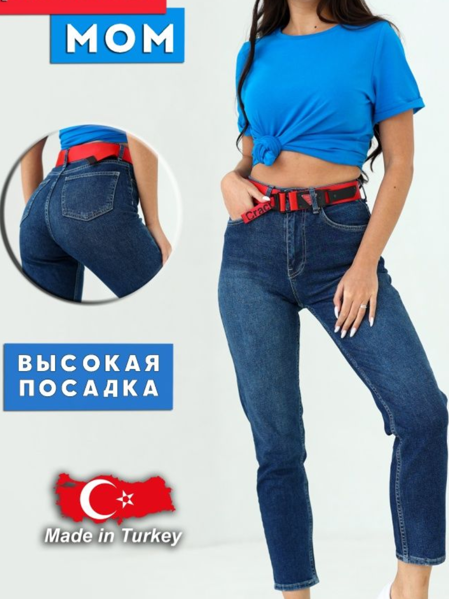 Джинсы с высокой талией МОМ. Сзади и спереди располагаются по два кармана. В низу брючин декоративные потёртости. В комплект входит ремень. Рост модели на фото 173 см. Параметры модели 89-62-93. Размер на модели 25.