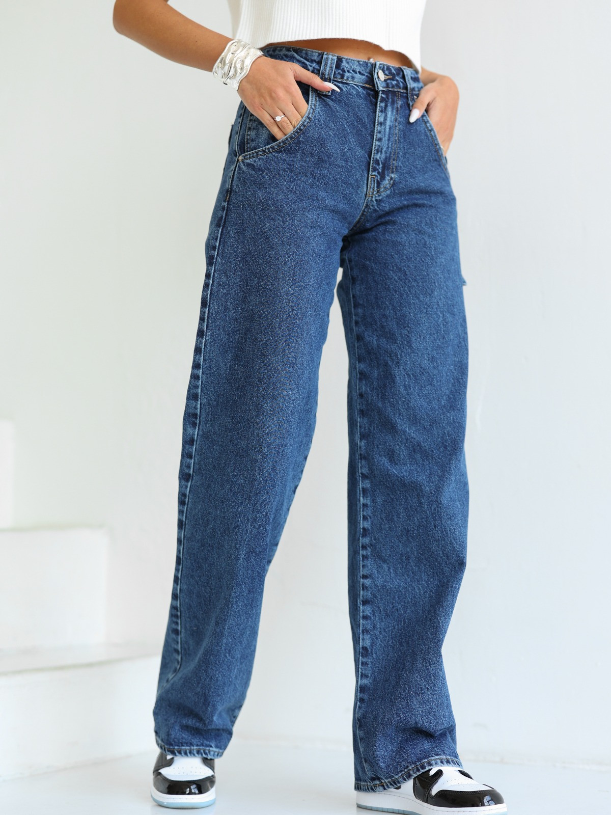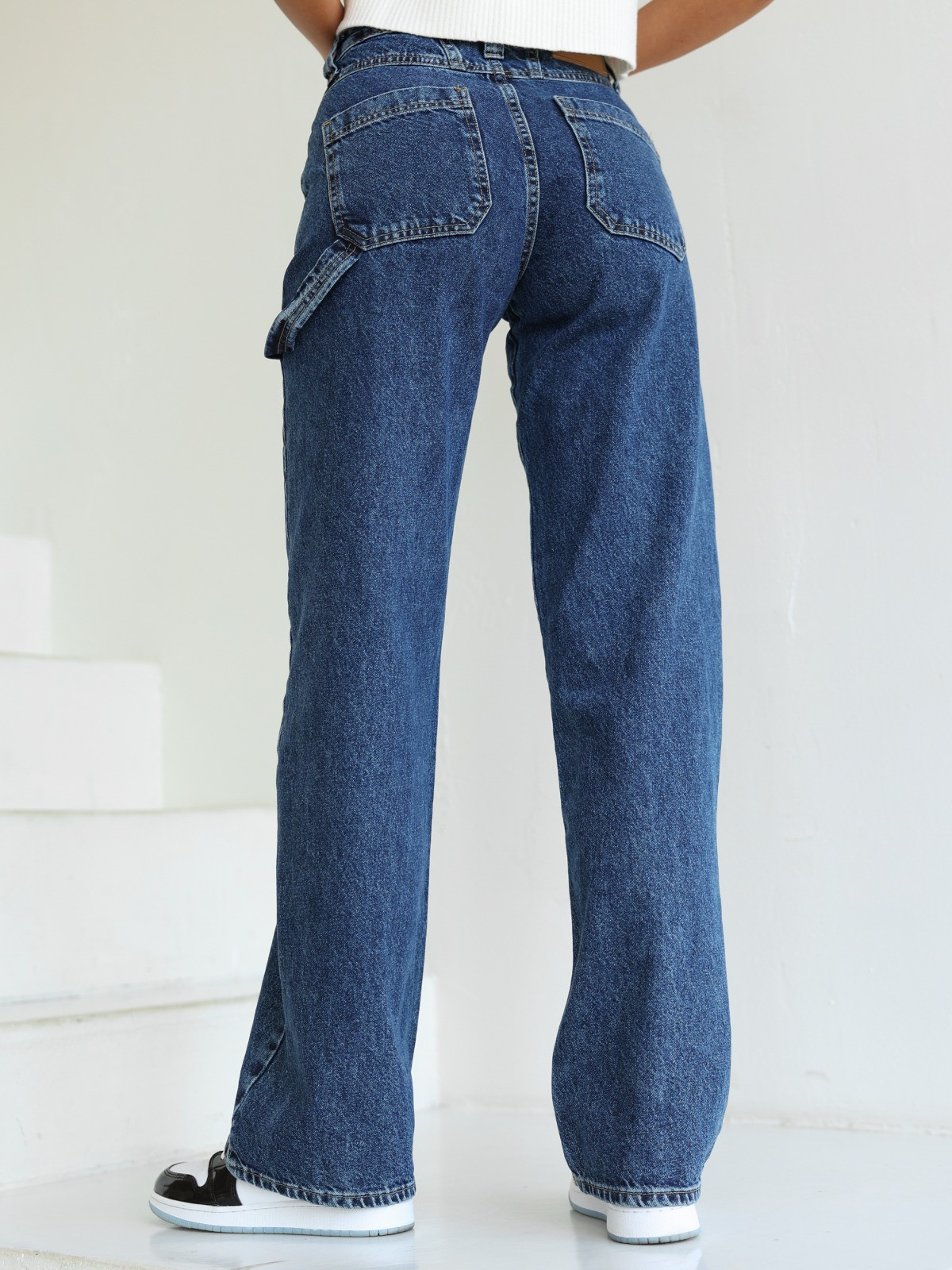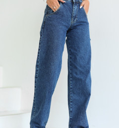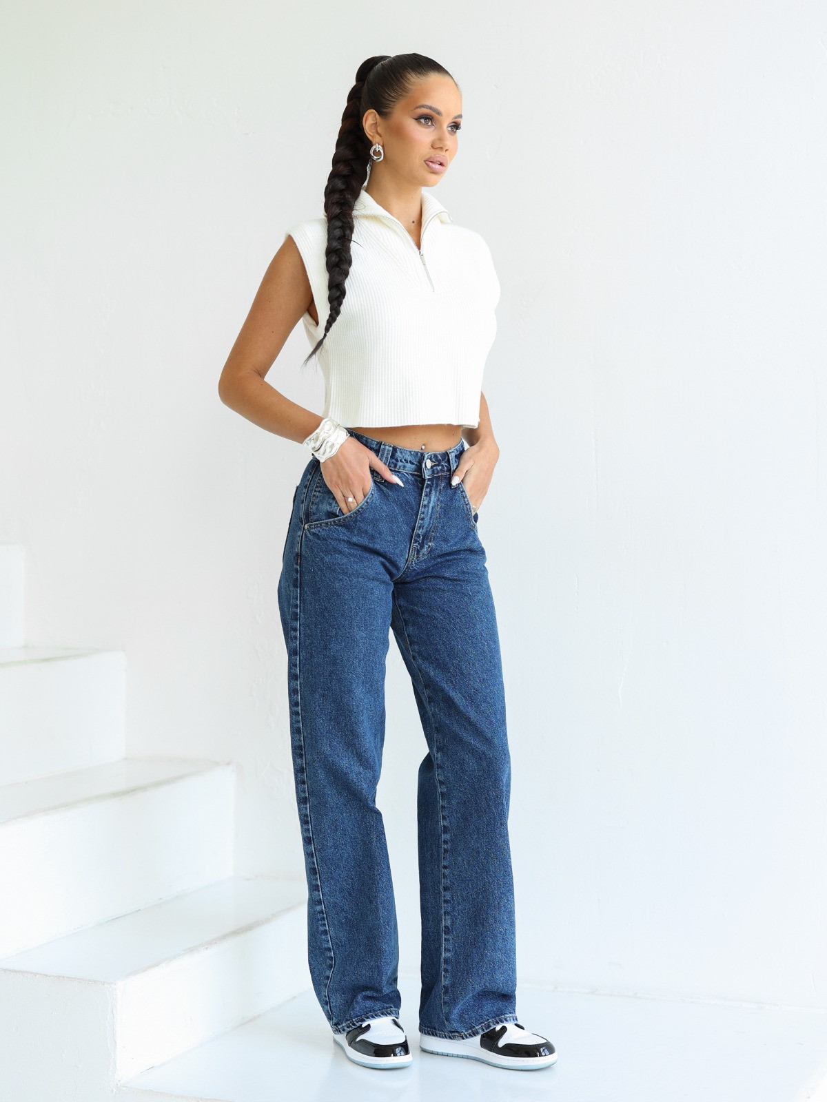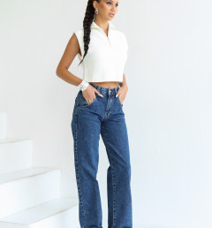 Джинсы прямого кроя декорированы тесьмой с левой стороны. Джинсы свободного кроя имеют 4 удобных кармана расположенных сзади, спереди.