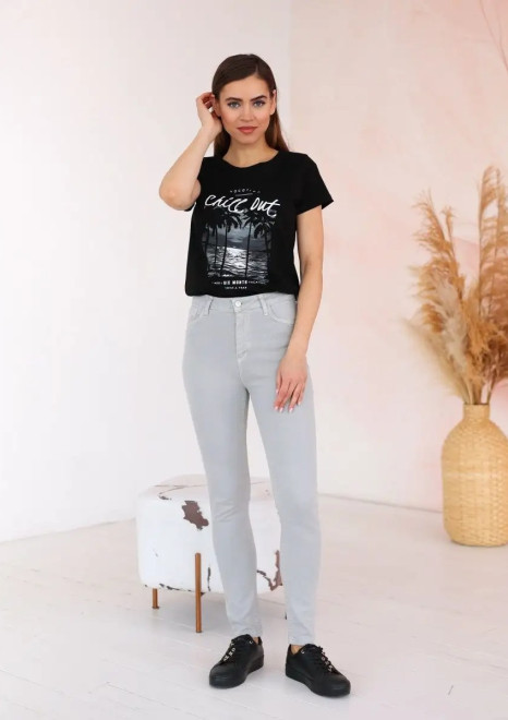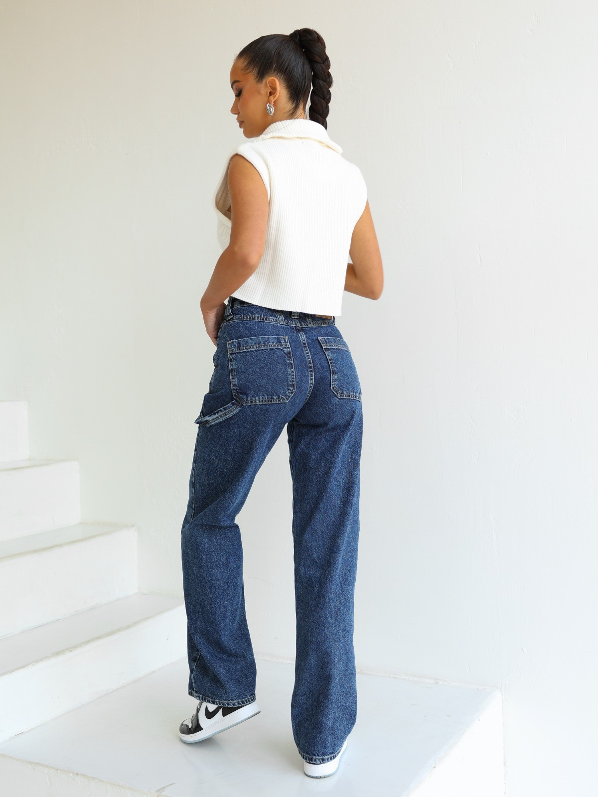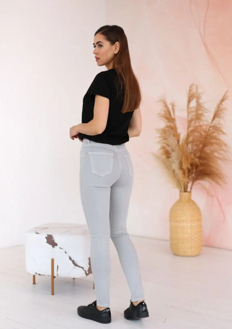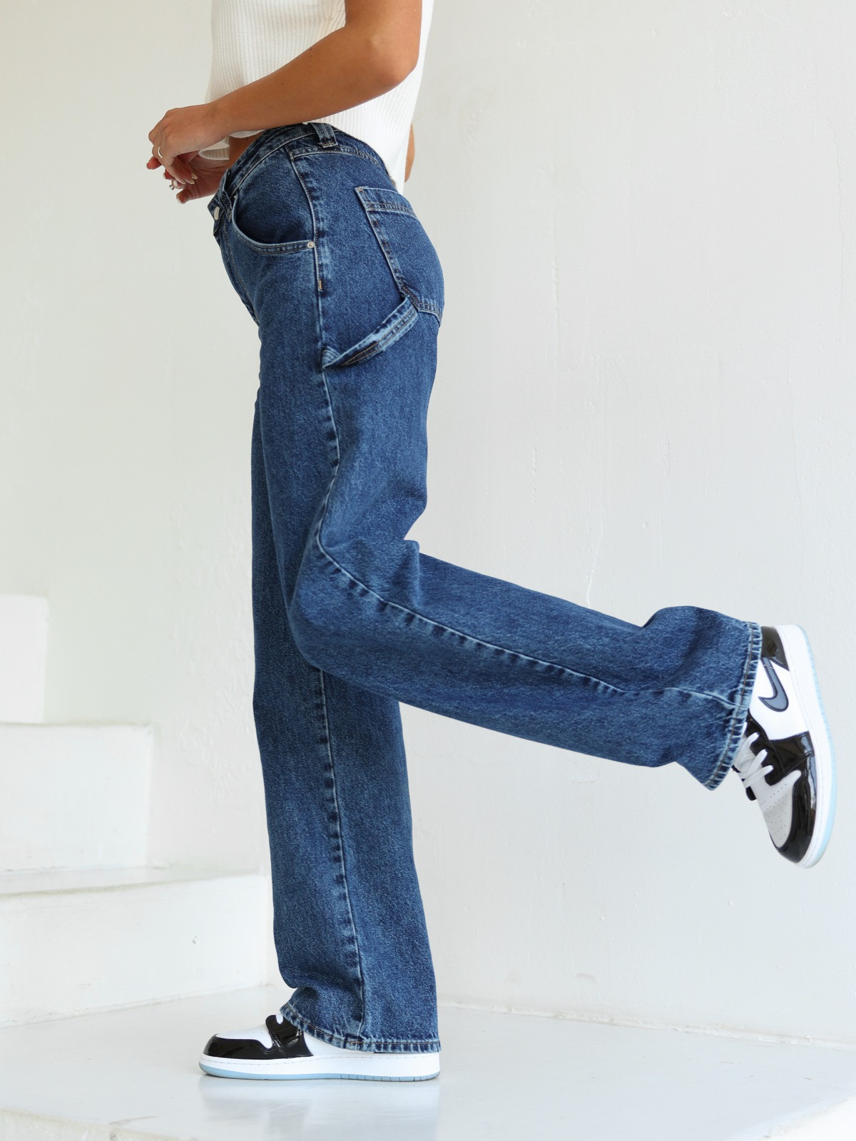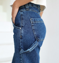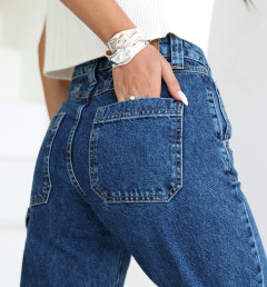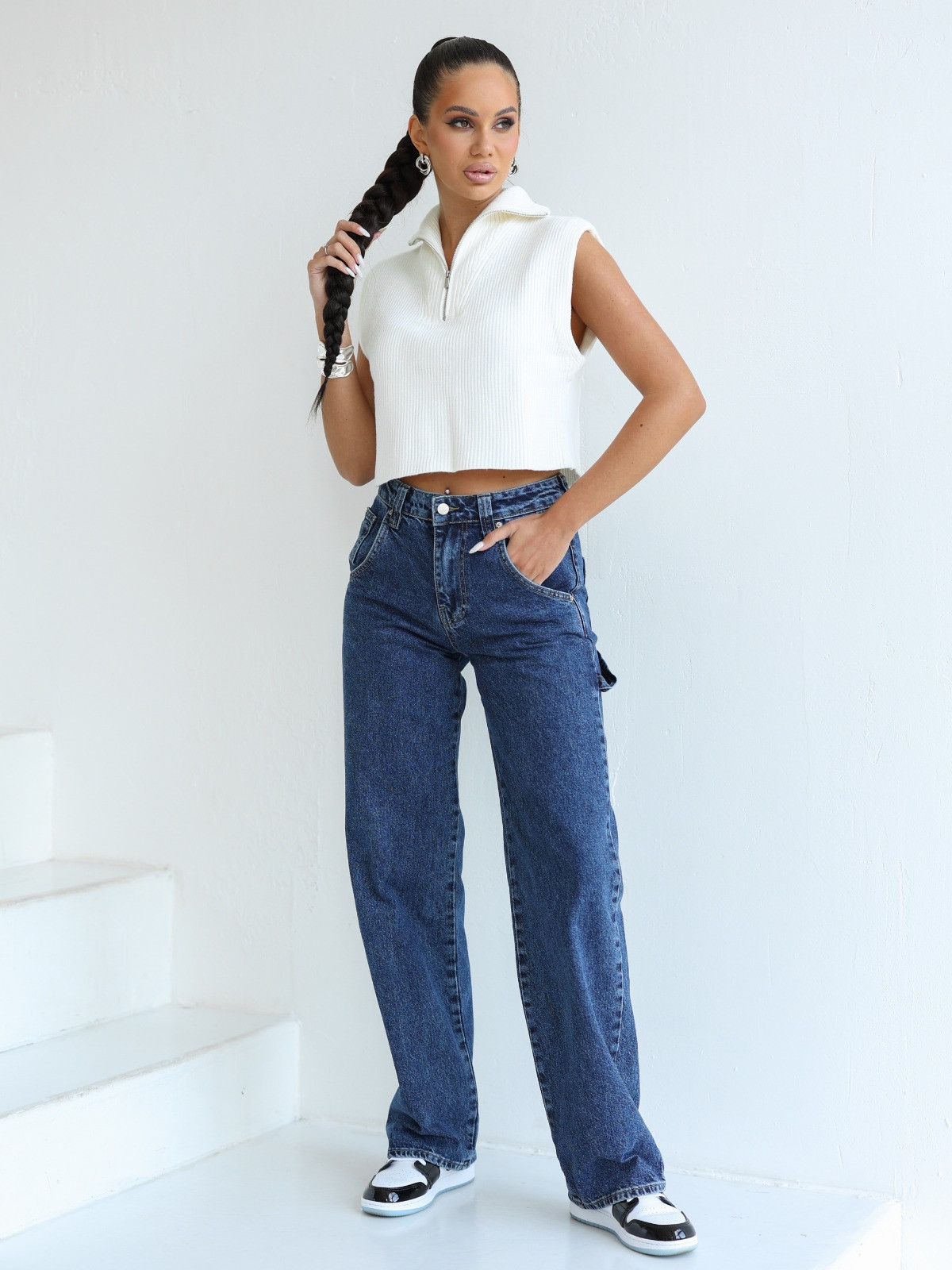 Джинсы прямого кроя декорированы тесьмой с левой стороны. Джинсы свободного кроя имеют 4 удобных кармана расположенных сзади, спереди.