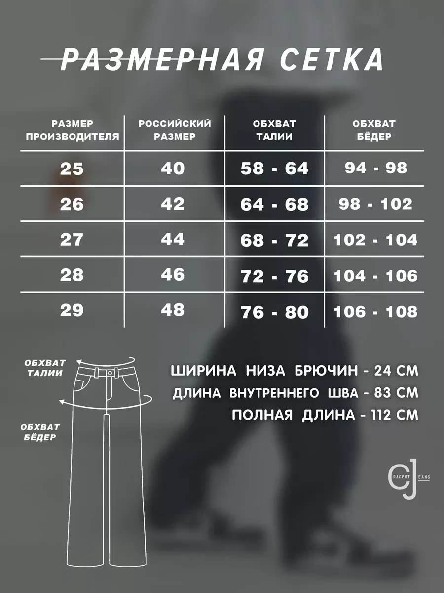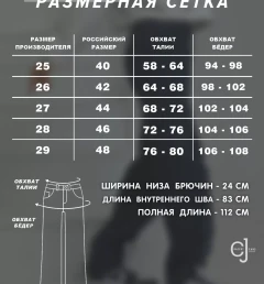 Рост модели 173. Размер на модели 25. длина модели 112см, длина по внутреннему шву 83см, ширина низа брючин 24см.