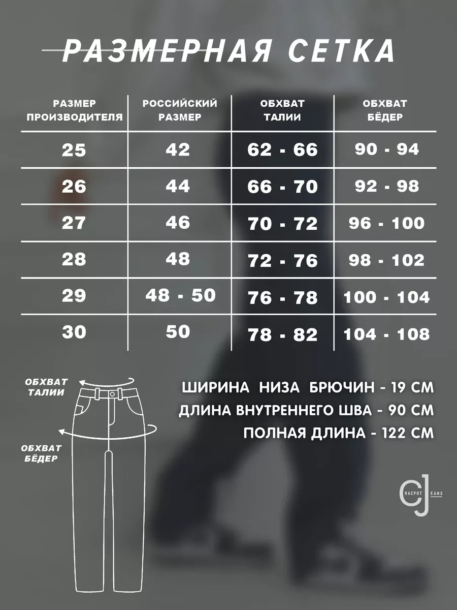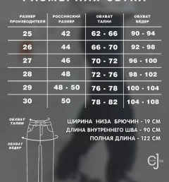 Размер 25. Полная длина модели 122 см по внутреннему шву 90см ширина низа брючин 19 см.