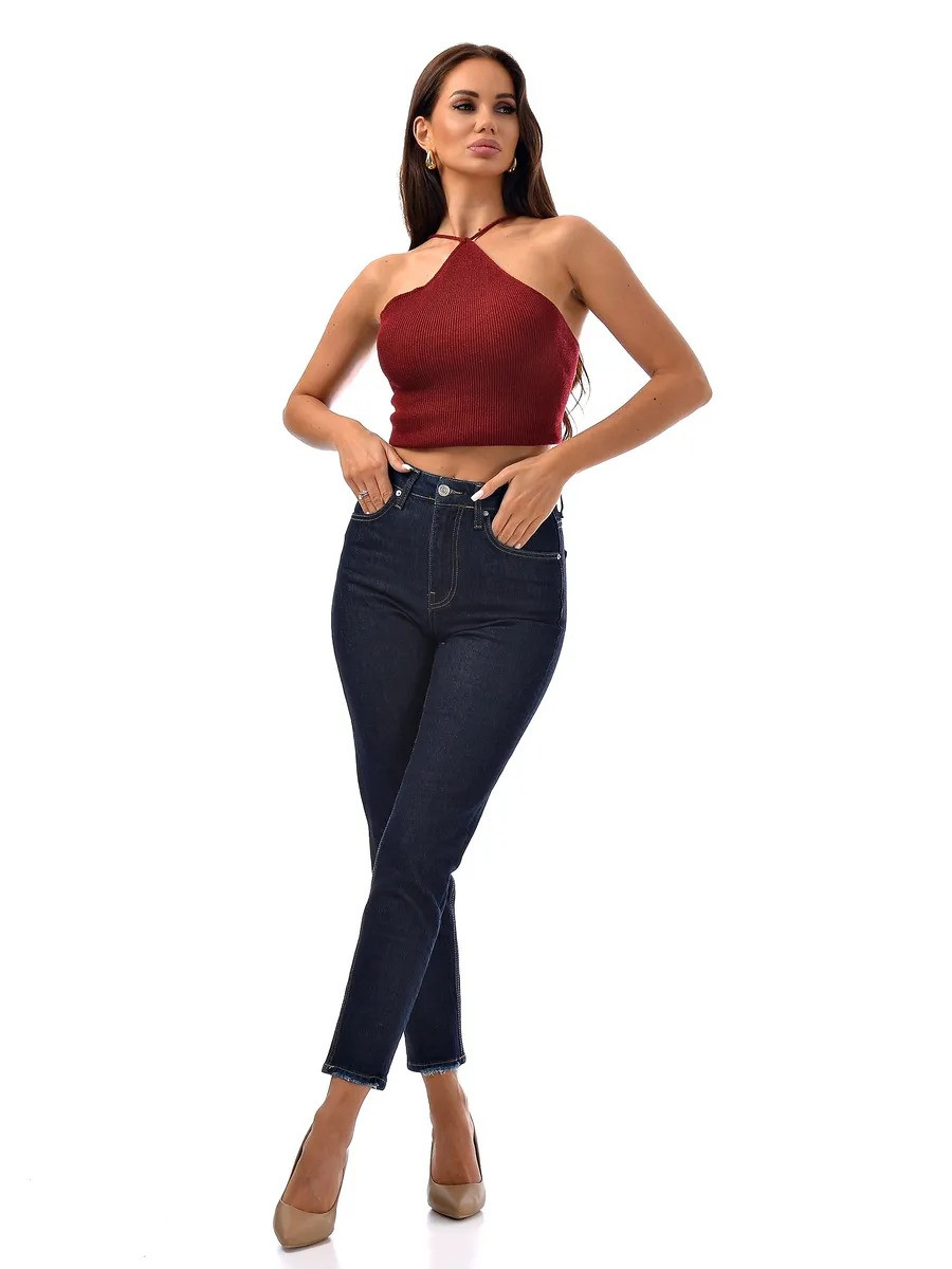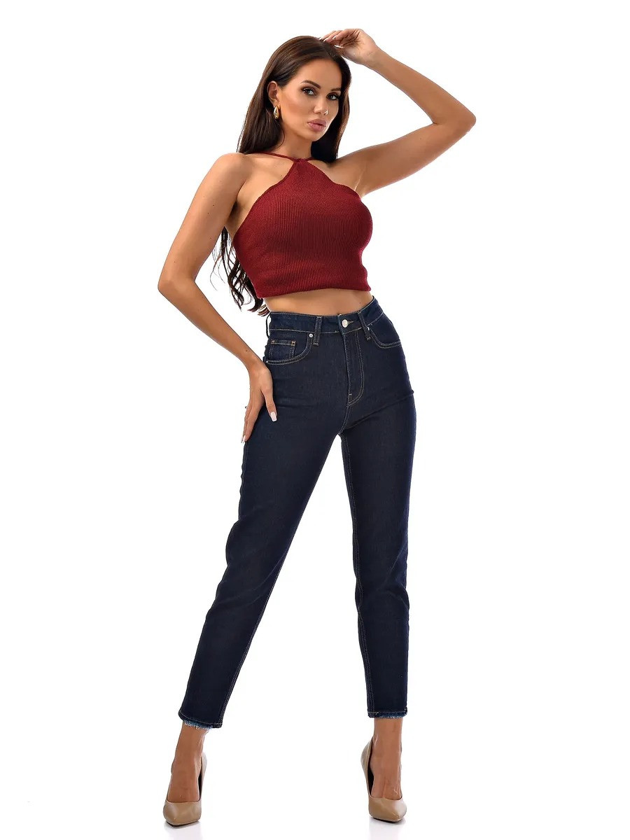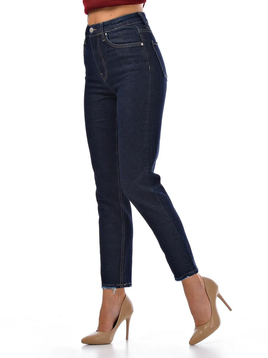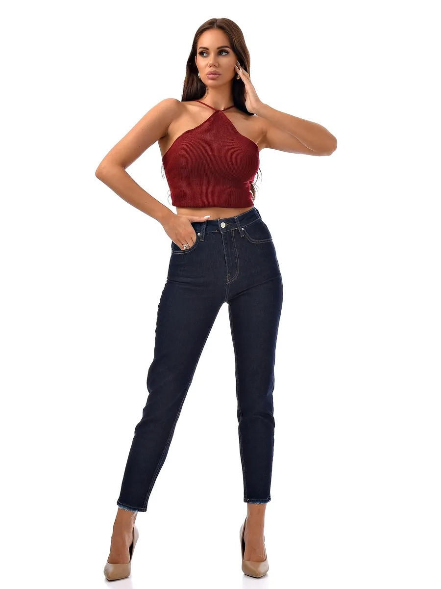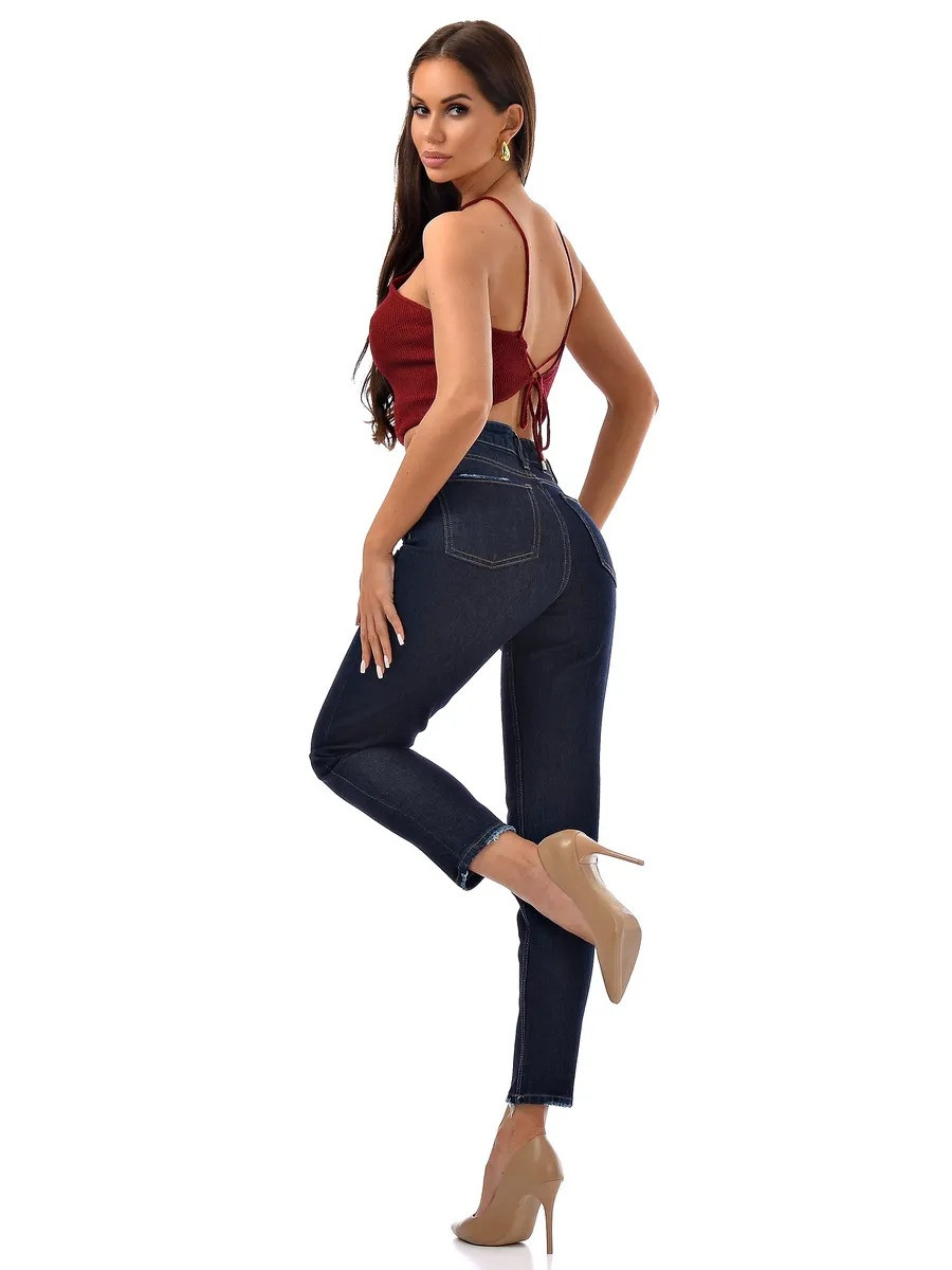 Тёмно-синий оттенок, эффект потертости и укороченный крой делают их идеальными как для офиса, так и для прогулки.