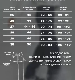Полная длина модели 122 см по внутреннему шву 93 см ширина низа брючин 23 см . Возможна погрешность +- 1 см.