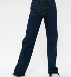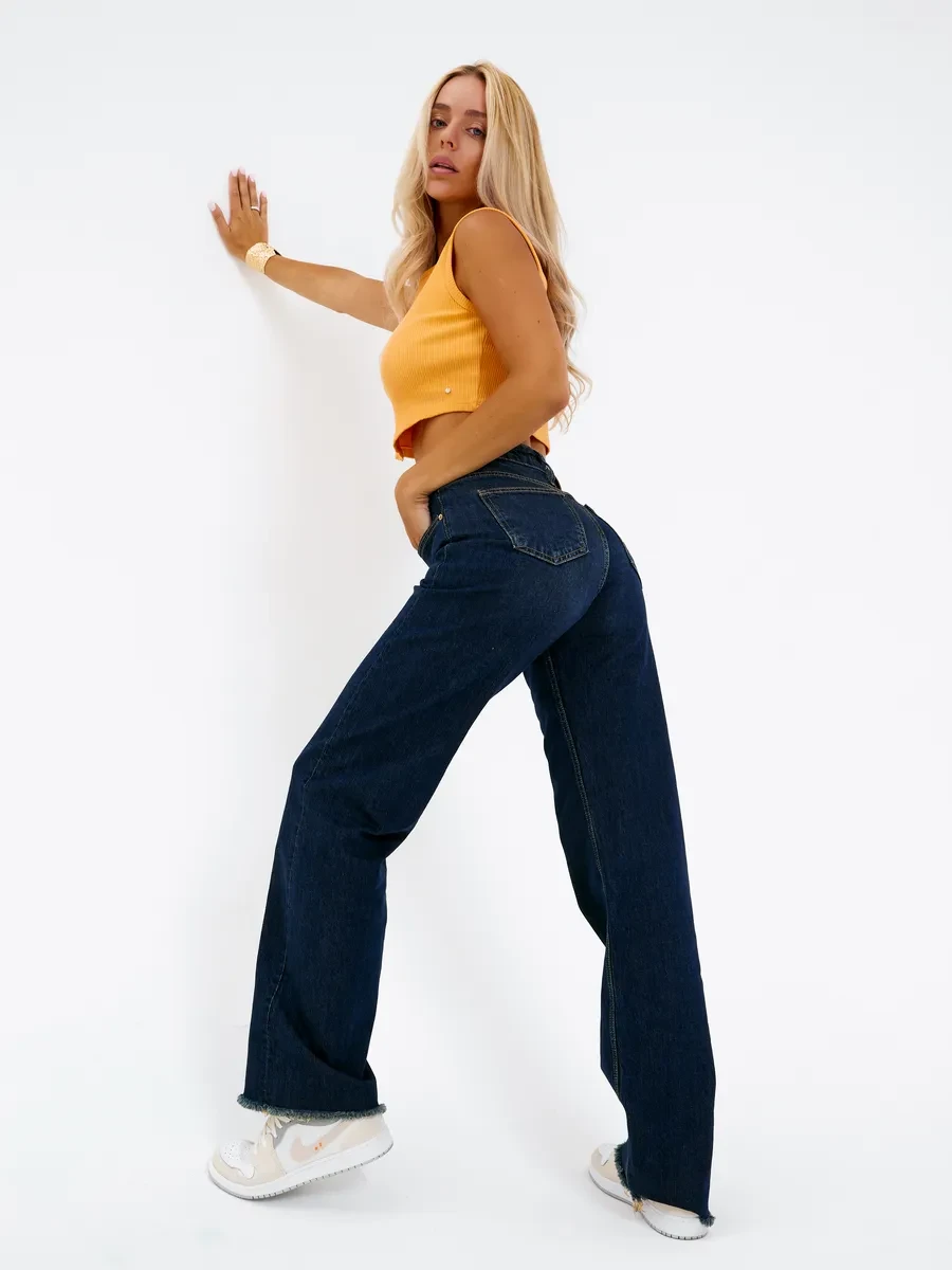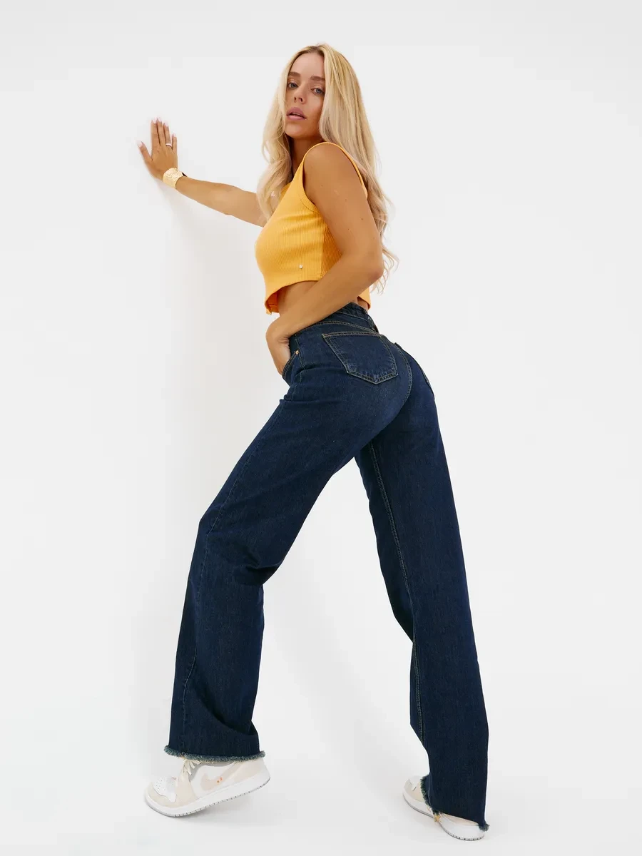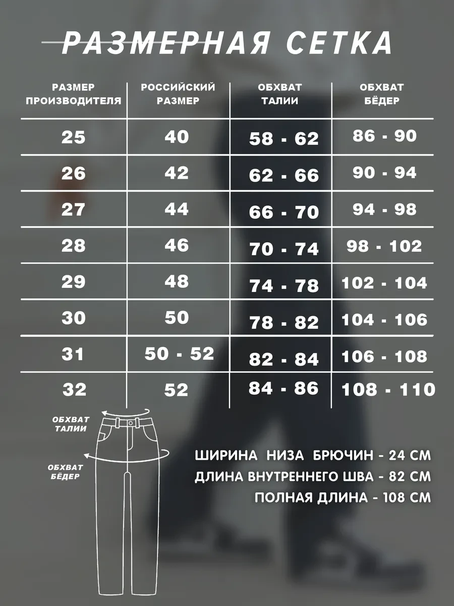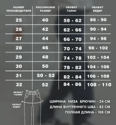 Полная длина — 108 см, длина по внутреннему шву — 82 см, ширина низа брючин — 24 см. Размер на модели: 26.