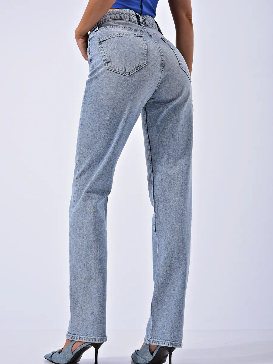 Наш бренд «CRACPOT» рад представить вам свою коллекцию популярных базовых женских джинсов прямого кроя с высокой посадкой. В этом сезоне весна-лето 2025-2026 особенно востребованы прямые голубые джинсы, изготовленные из 99% хлопка и 1% эластана. Этот состав обеспечивает комфорт и эластичность материала, позволяя джинсам сохранять свою форму даже после множества стирок.