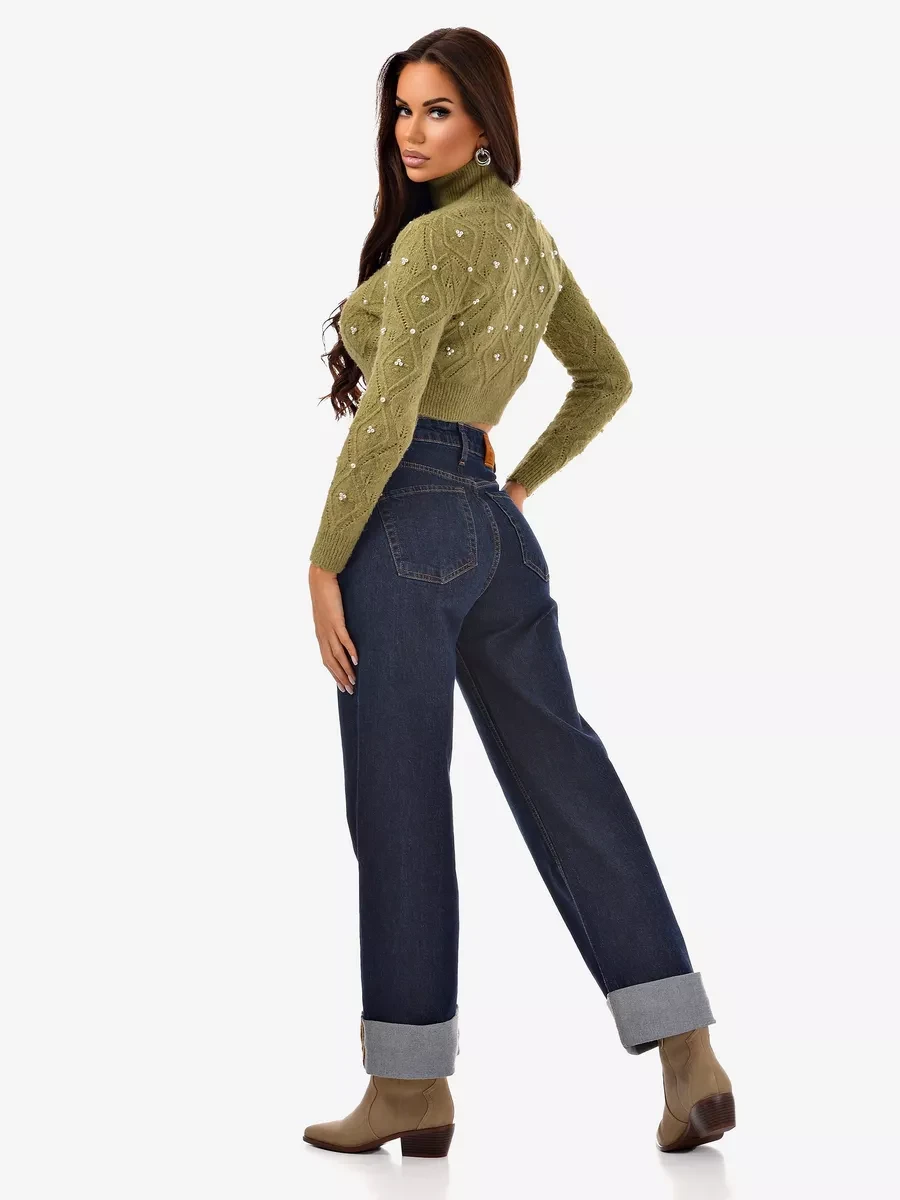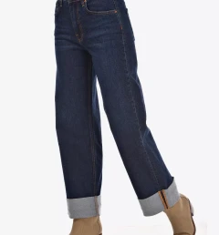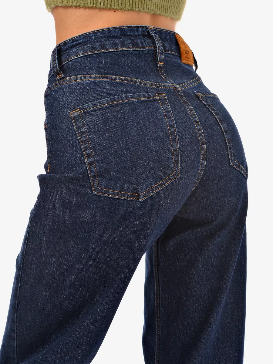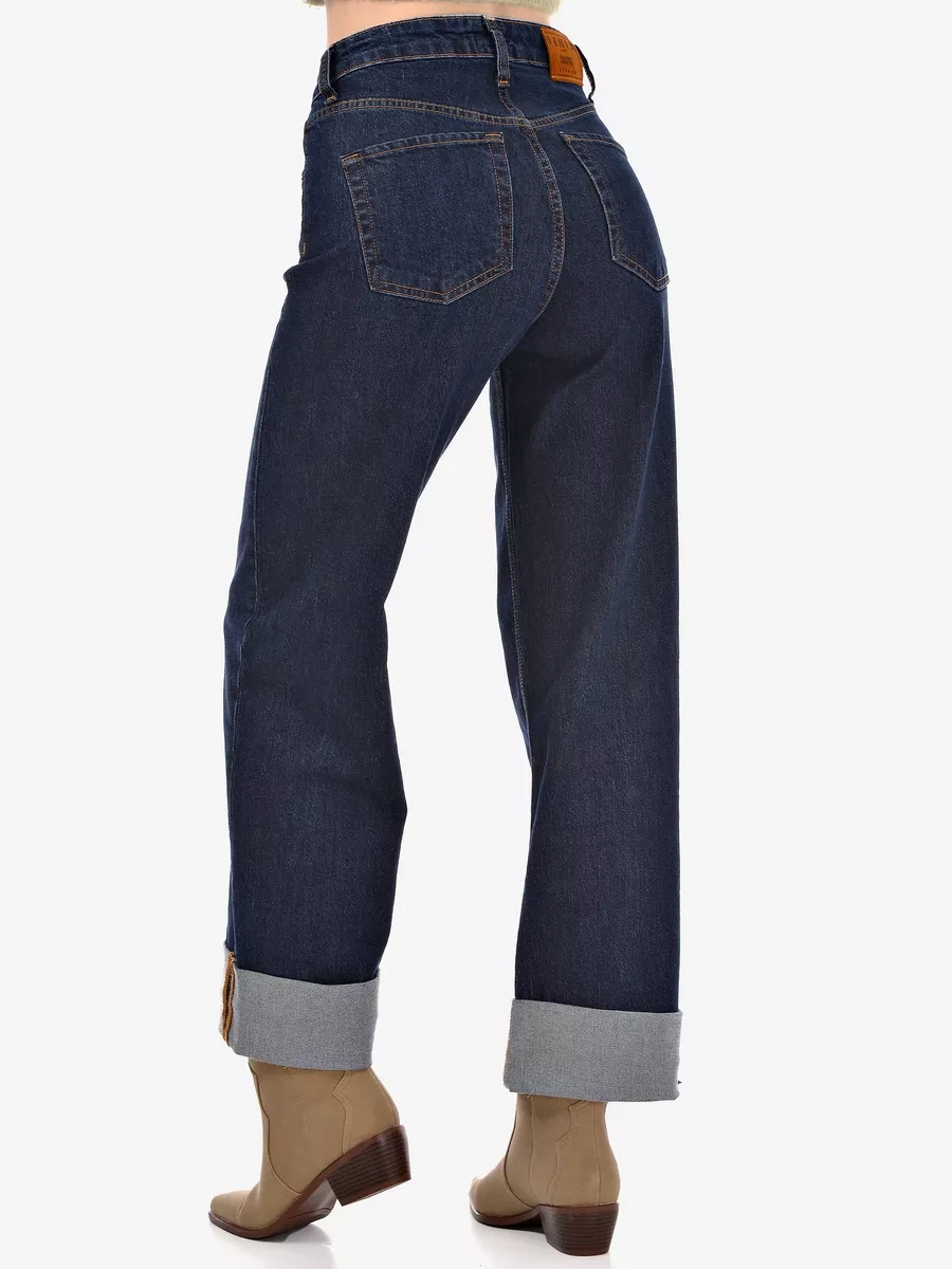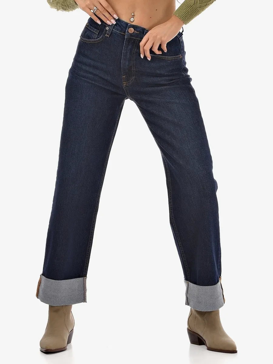 Свободные широкие джинсы с подворотами - идеальный микс комфорта и моды. Выточки визуально удлиняют ноги, а темно-синий цвет подчеркивает элегантность.