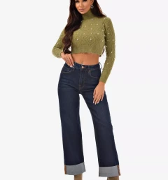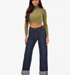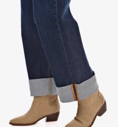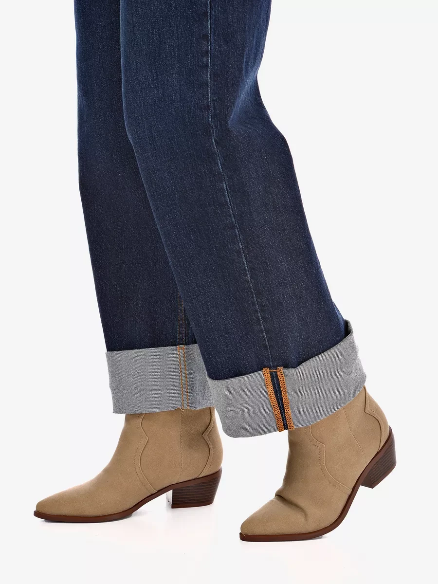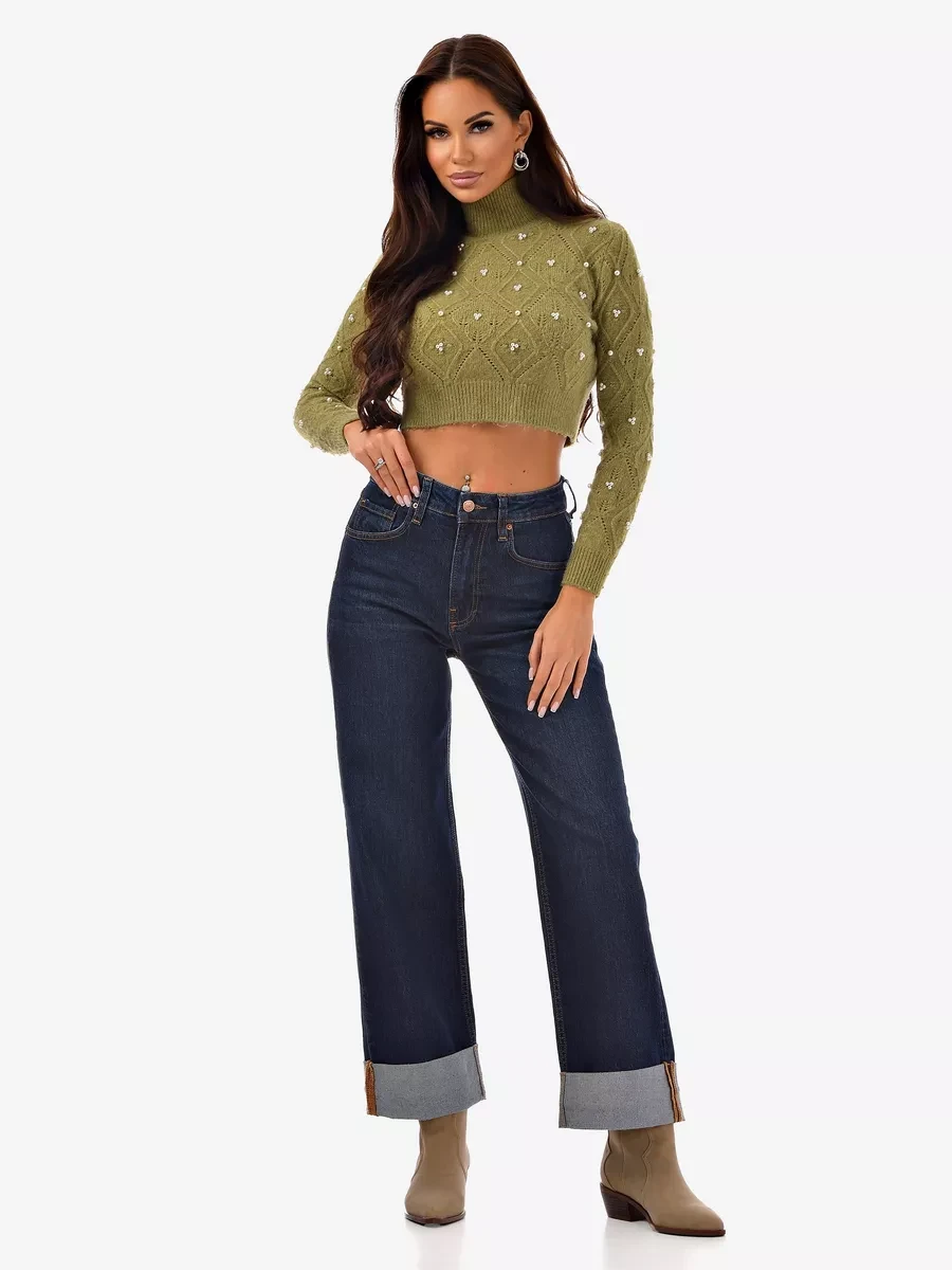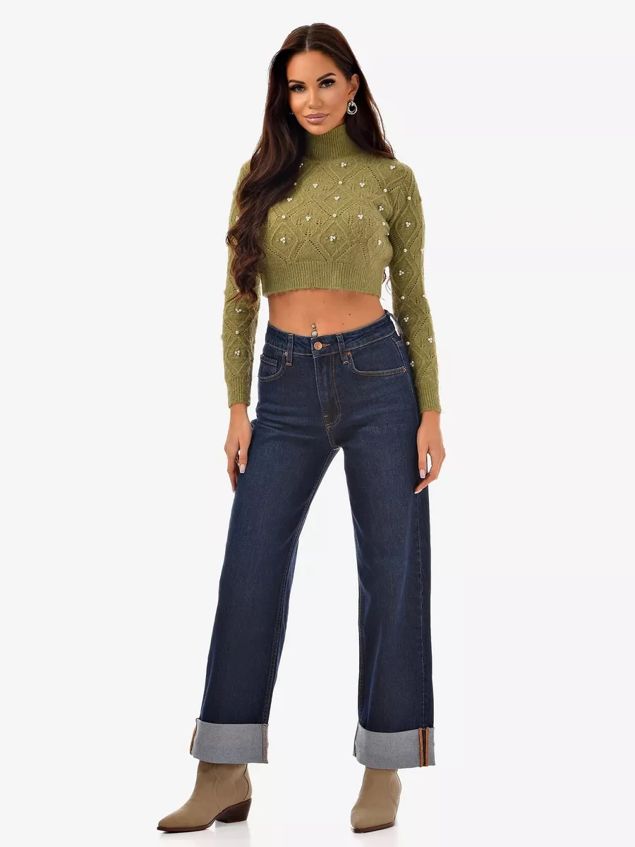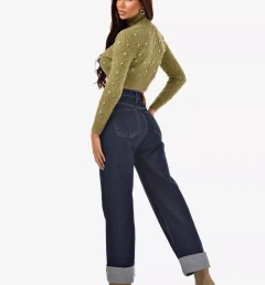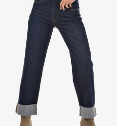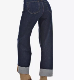 Свободные широкие джинсы с подворотами - идеальный микс комфорта и моды. Выточки визуально удлиняют ноги, а темно-синий цвет подчеркивает элегантность.