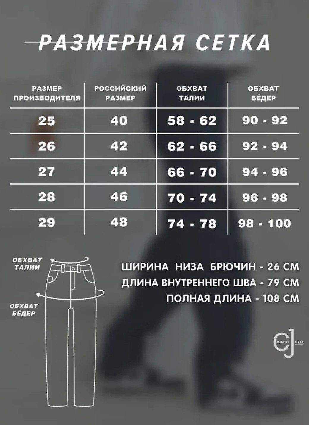 Размер: 25. Полная длина составляет 108 см, длина внутреннего шва — 79 см, а ширина низа брючины — 26 см. Чтобы правильно подобрать размер, пожалуйста, обратитесь к таблице в разделе «Фото». Рост модели — 174 см, Размер на модели — 26.