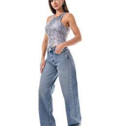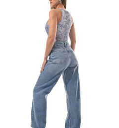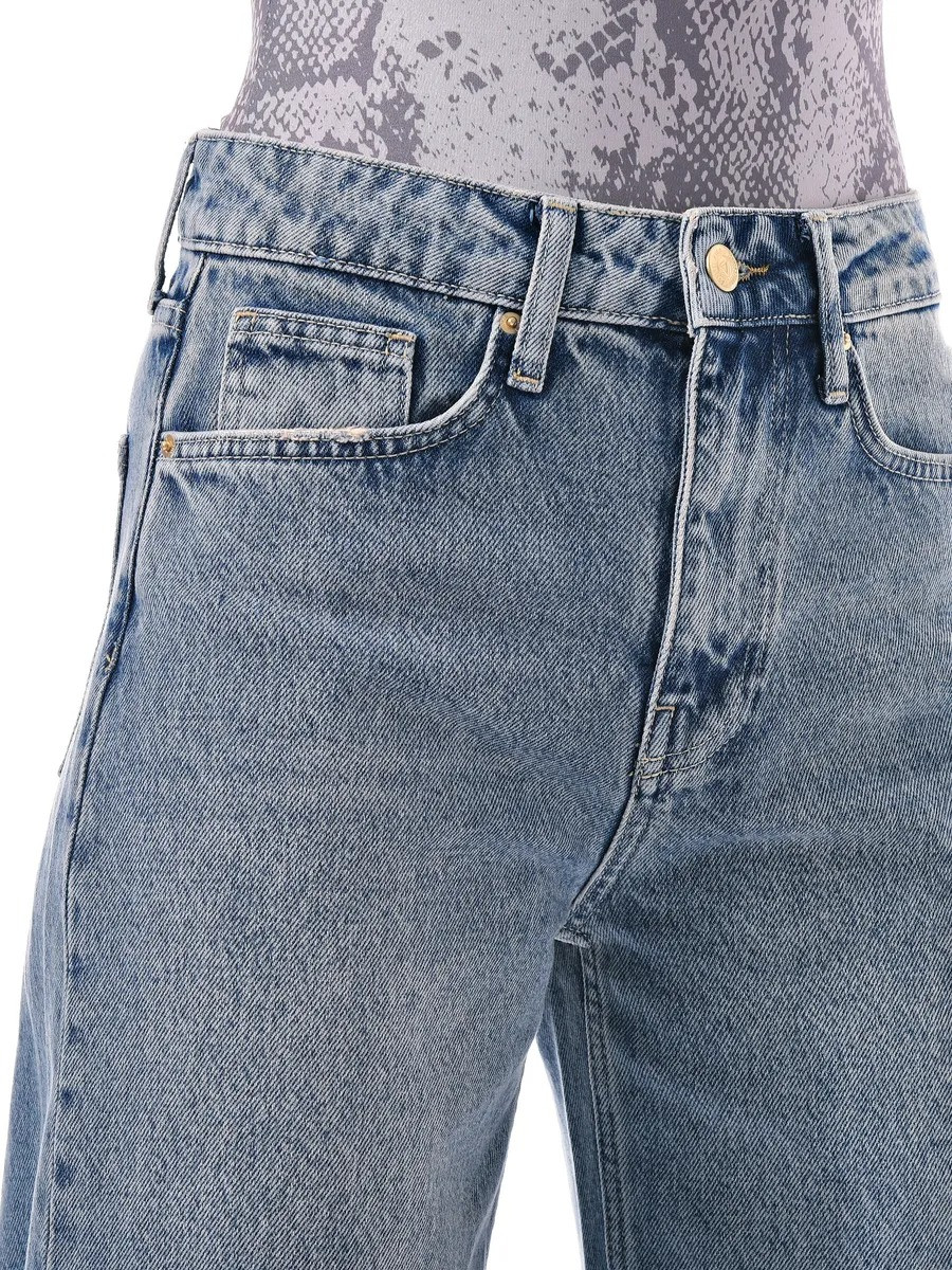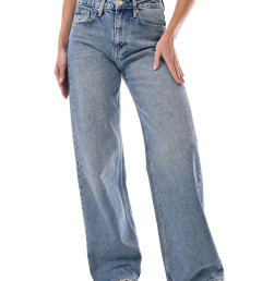 На брюках есть классическая застежка на пуговицу и замок-молнию, а также шлевки для ремня по поясу. Джинсы представлены в классическом голубом цвете с эффектом потертости, что придает им особый шарм. Для удобства предусмотрены прорезные и накладные карманы.