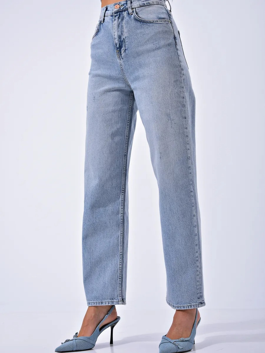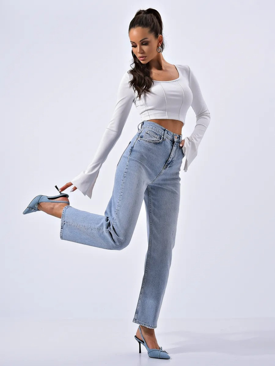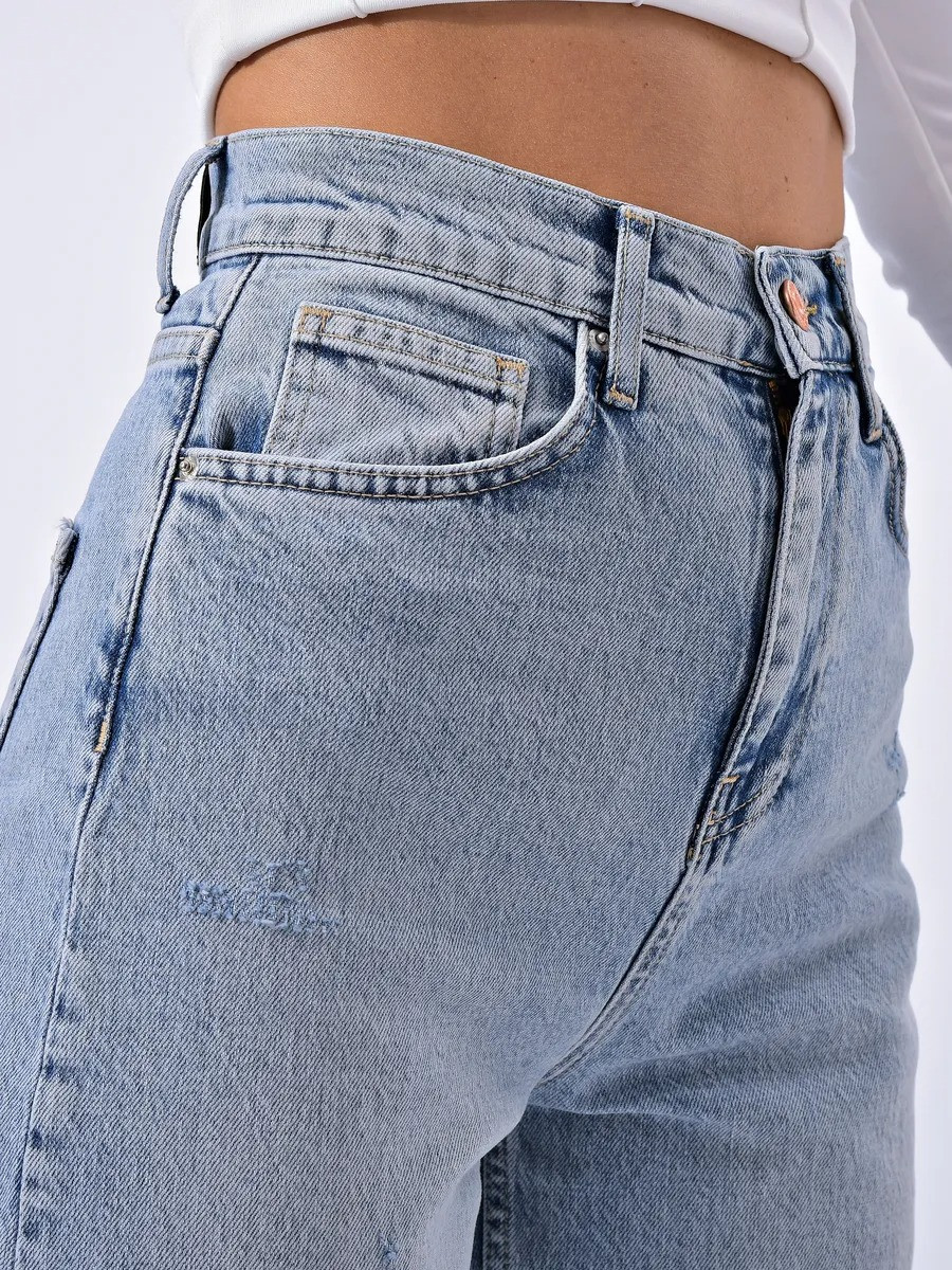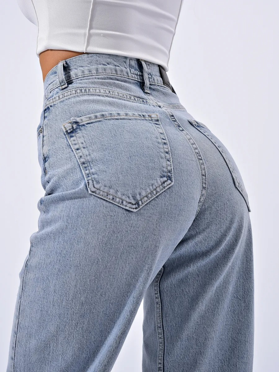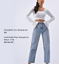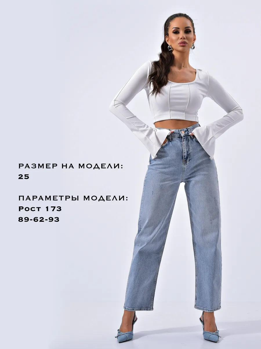 Джинсы с зауженной талией, высокой посадкой и мягкими потертостями визуально стройнят и подчёркивают фигуру.