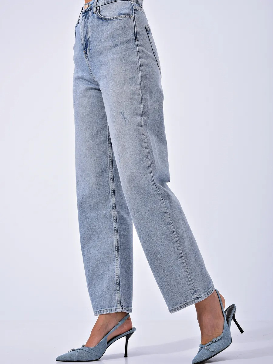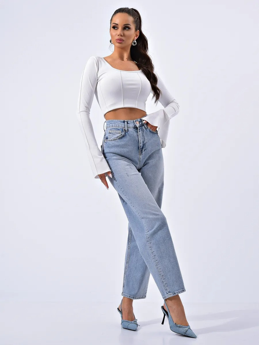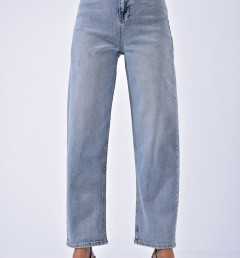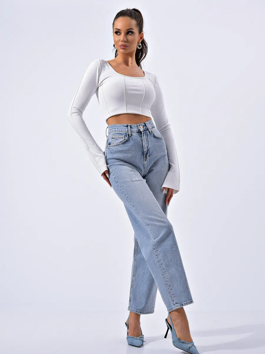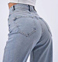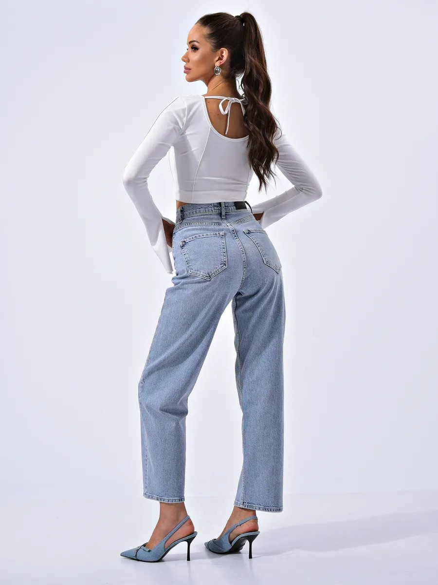 Джинсы с зауженной талией, высокой посадкой и мягкими потертостями визуально стройнят и подчёркивают фигуру.