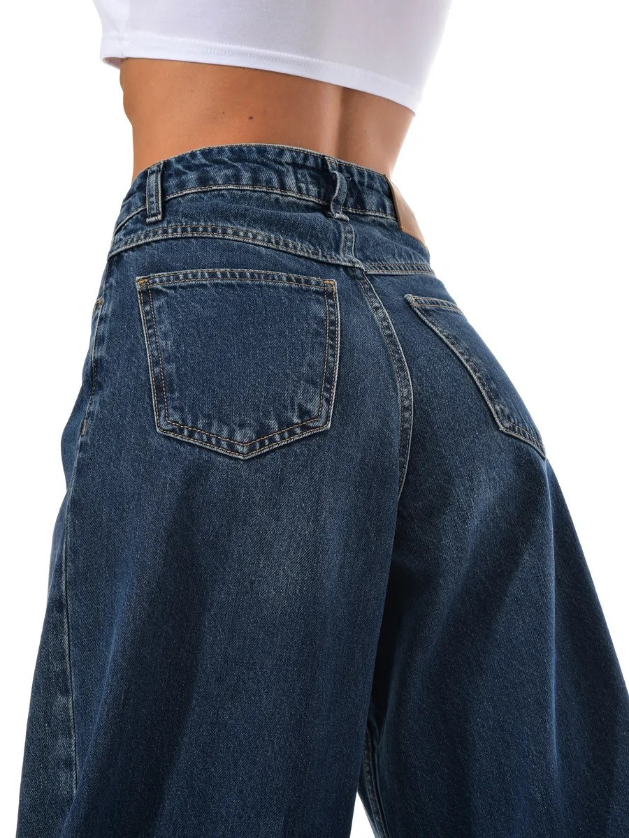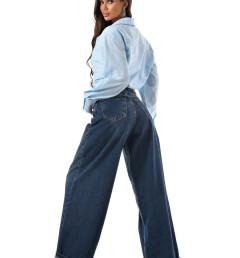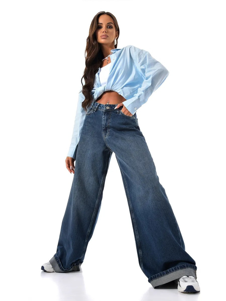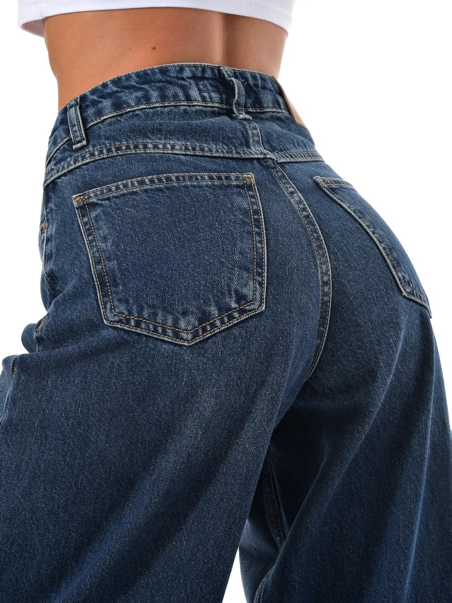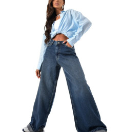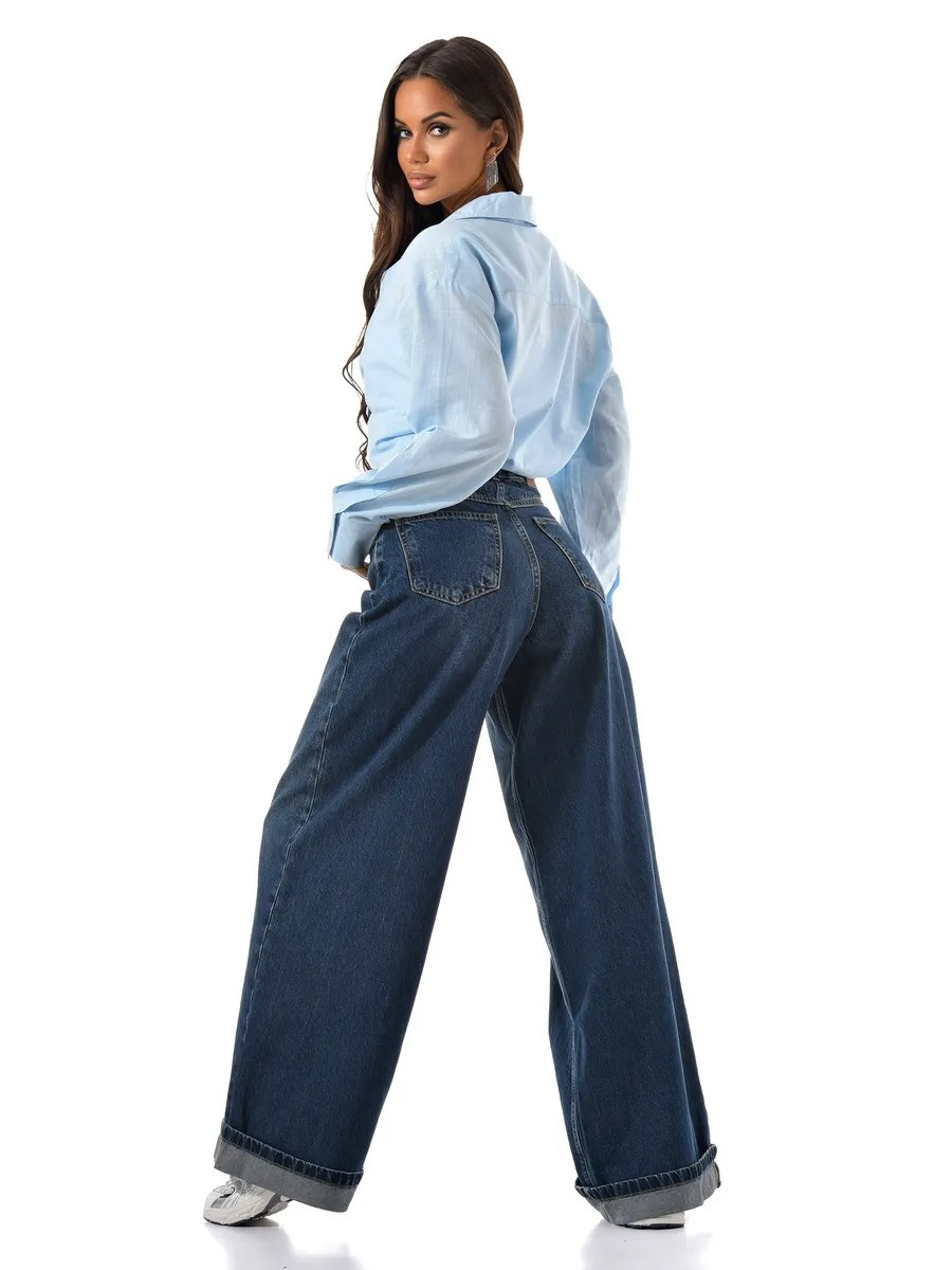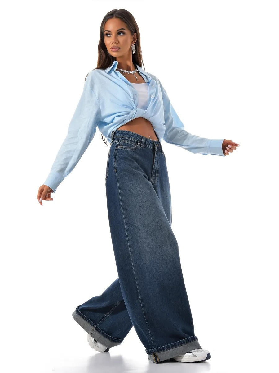 Тёмно-синий премиальный деним, высокая талия и прямой силуэт, который вытягивает ноги и делает талию тоньше.