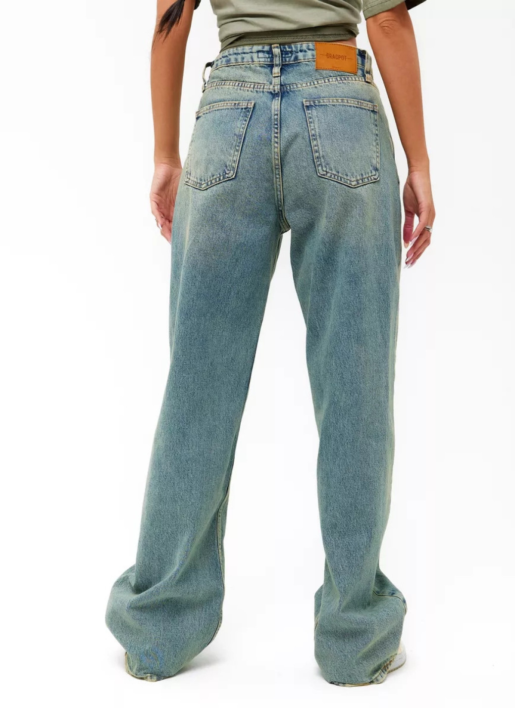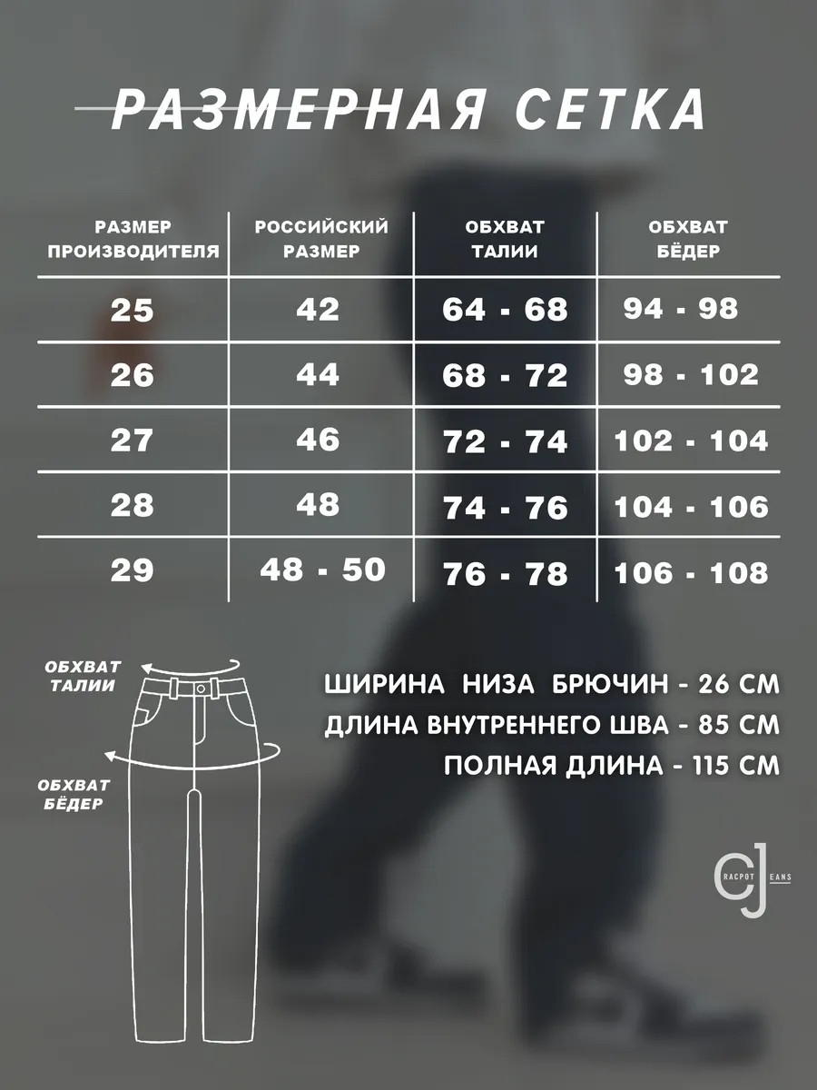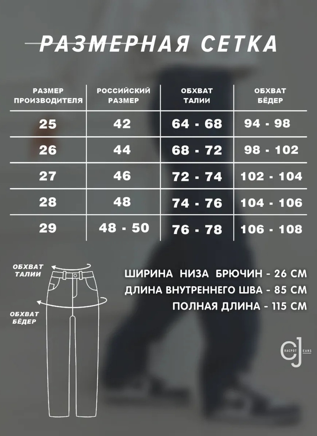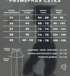 Размерная сетка: Размер 25. Полная длина - 115см , длина внутреннего шва - 85см, ширина низа брючины - 26 см. Размер на модели 25.