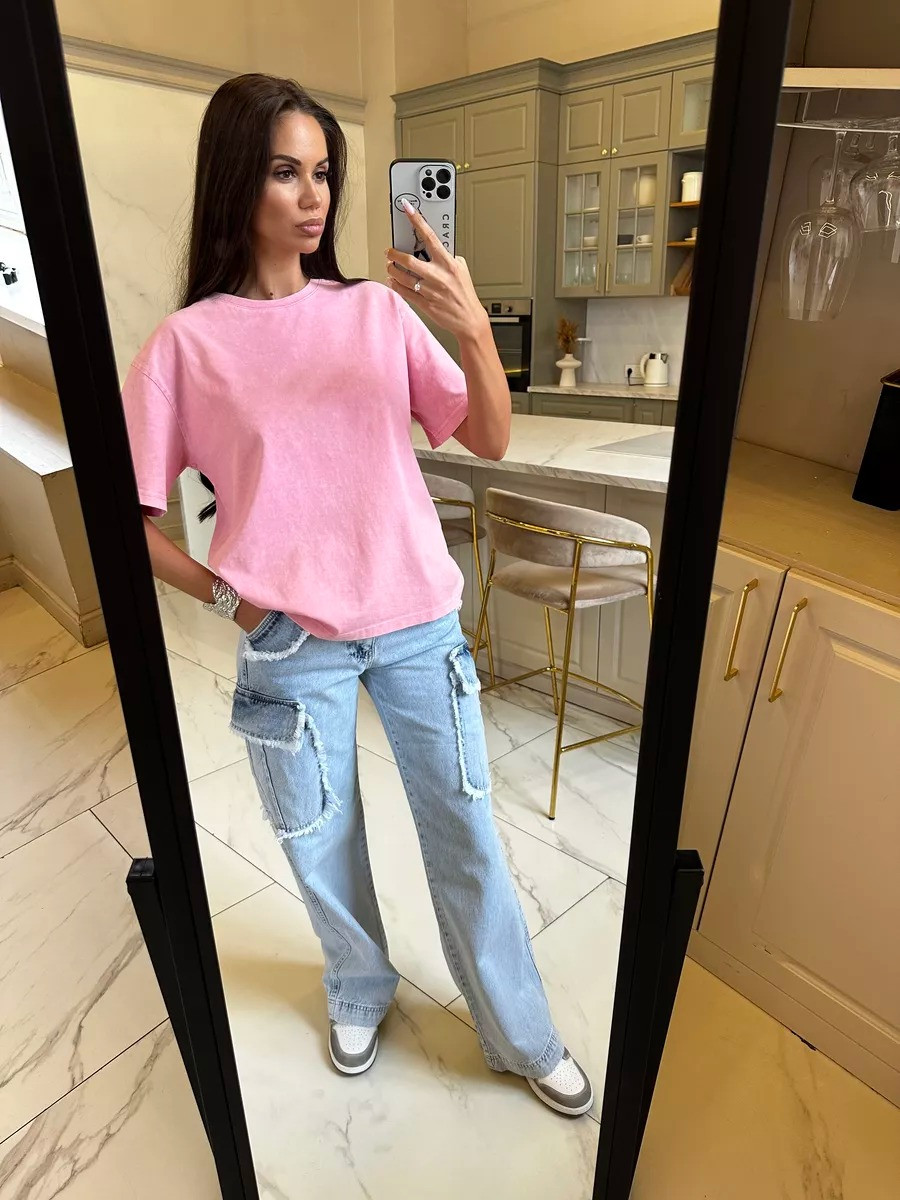 У нее свободный крой, округлая горловина и короткий рукав. Благодаря универсальному дизайну, эта футболка подходит как девушкам, так и мужчинам.