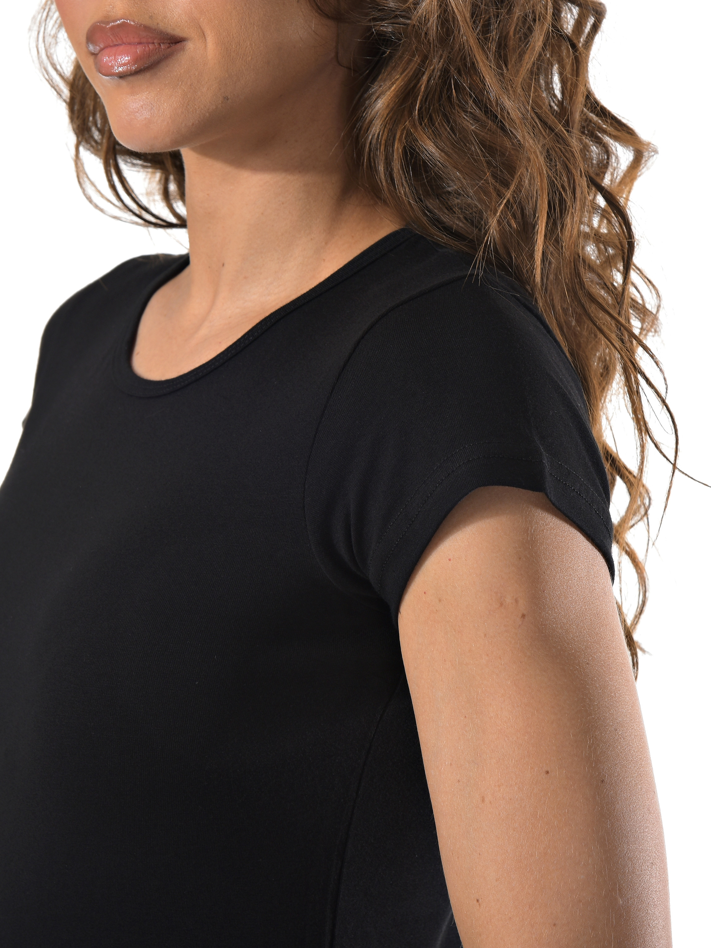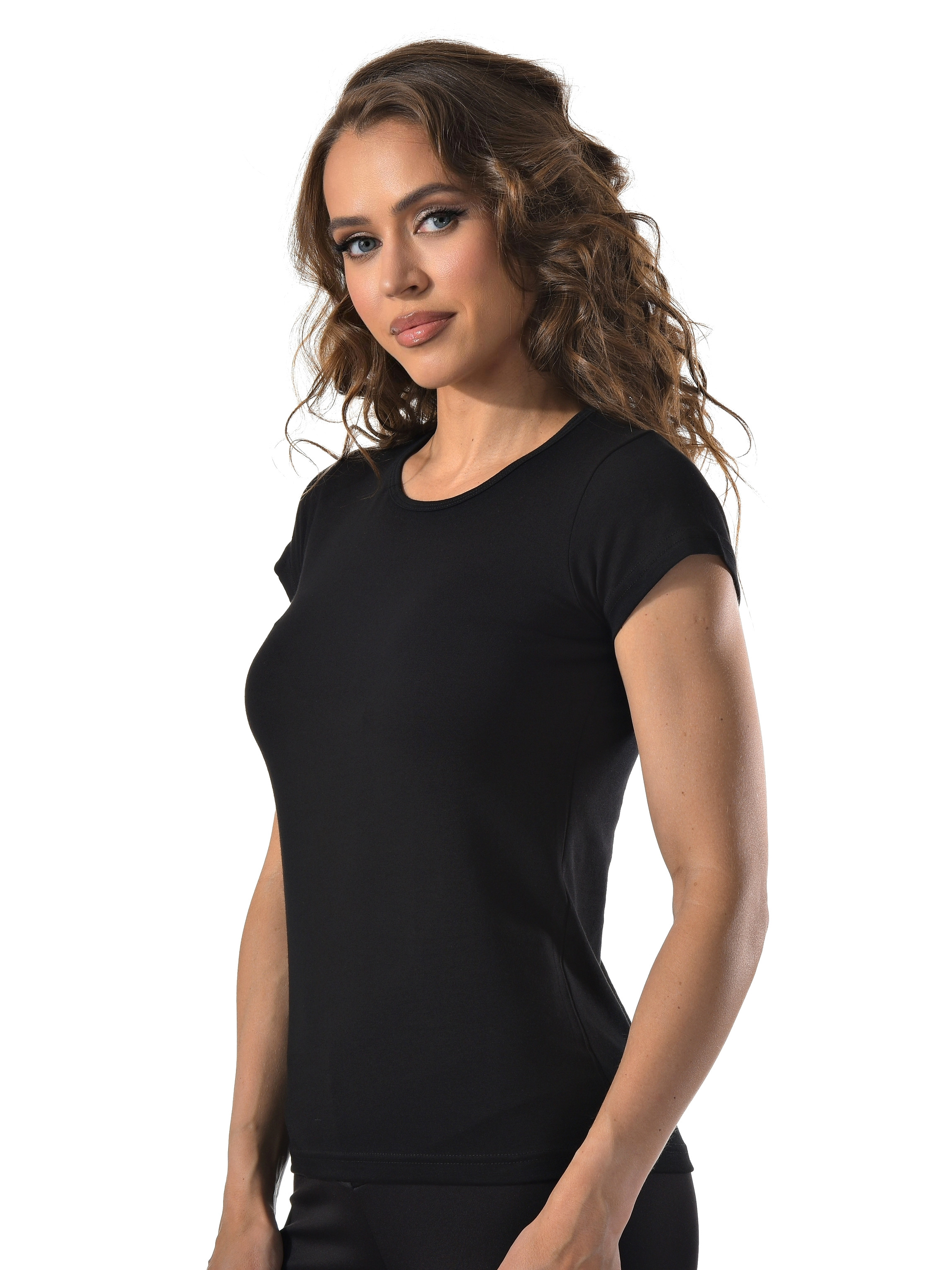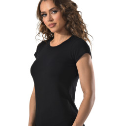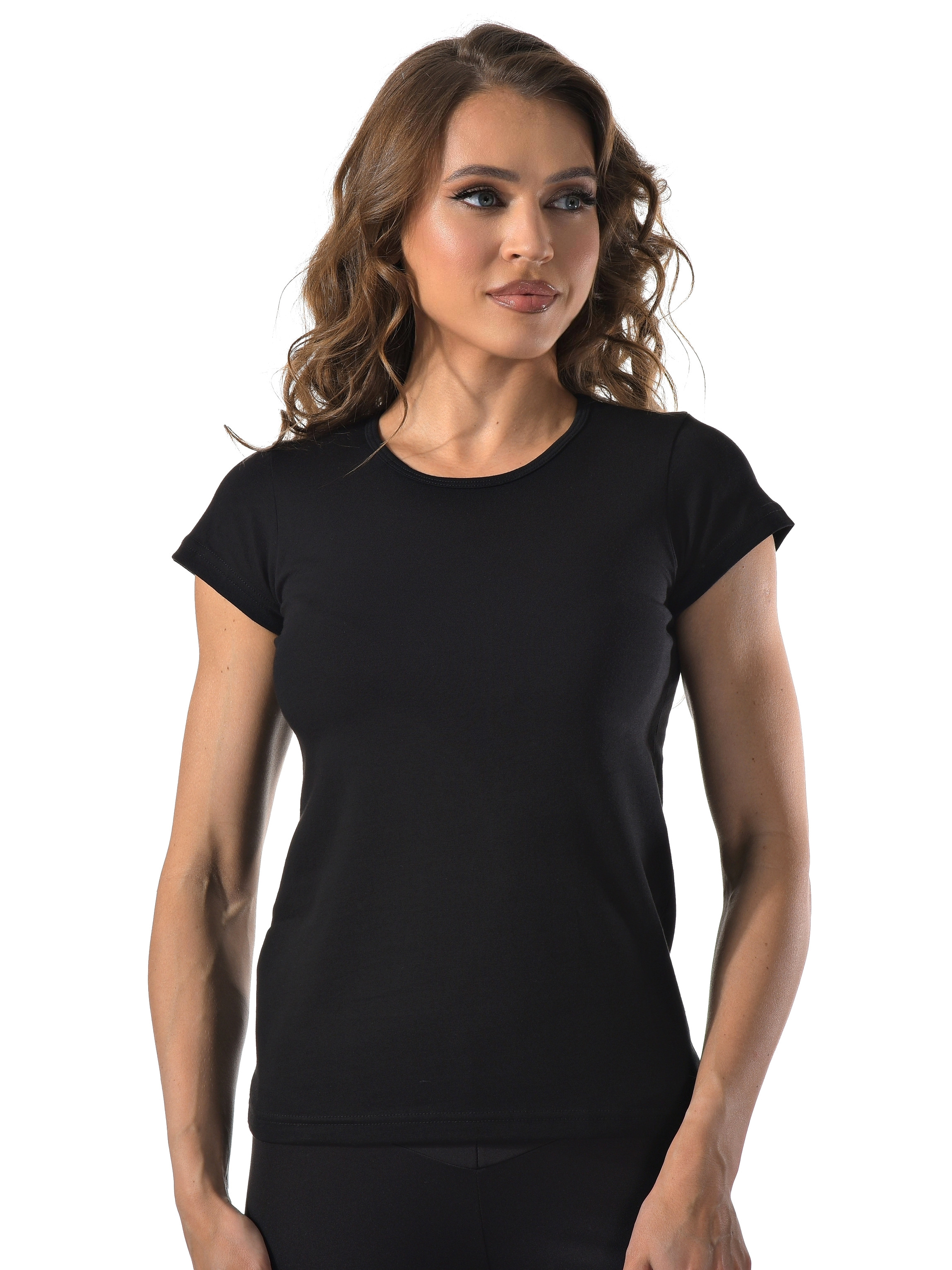Приталенная модель футболки с круглой горловиной и коротким рукавом.