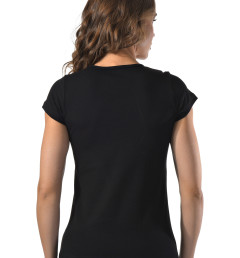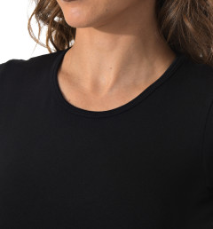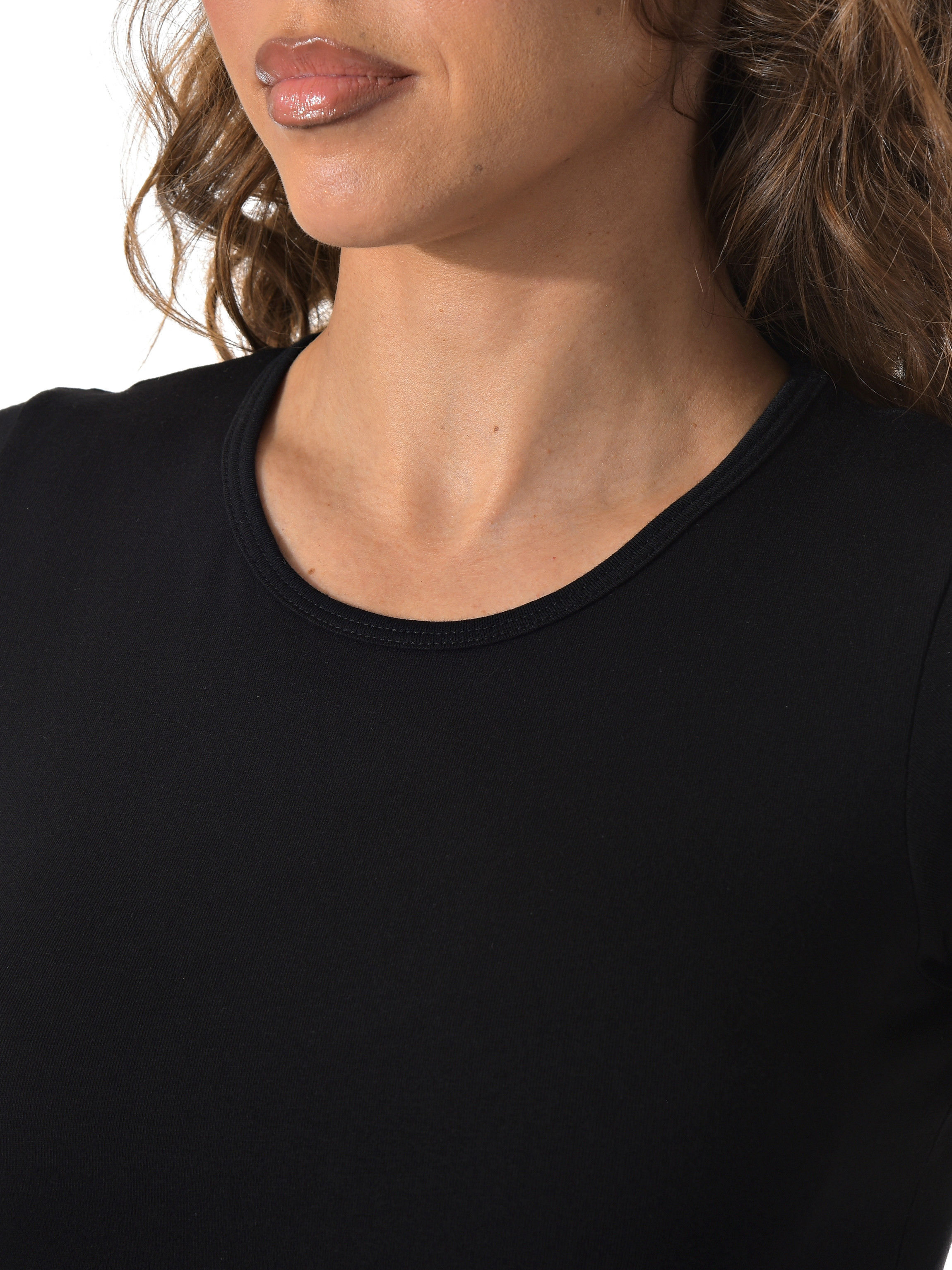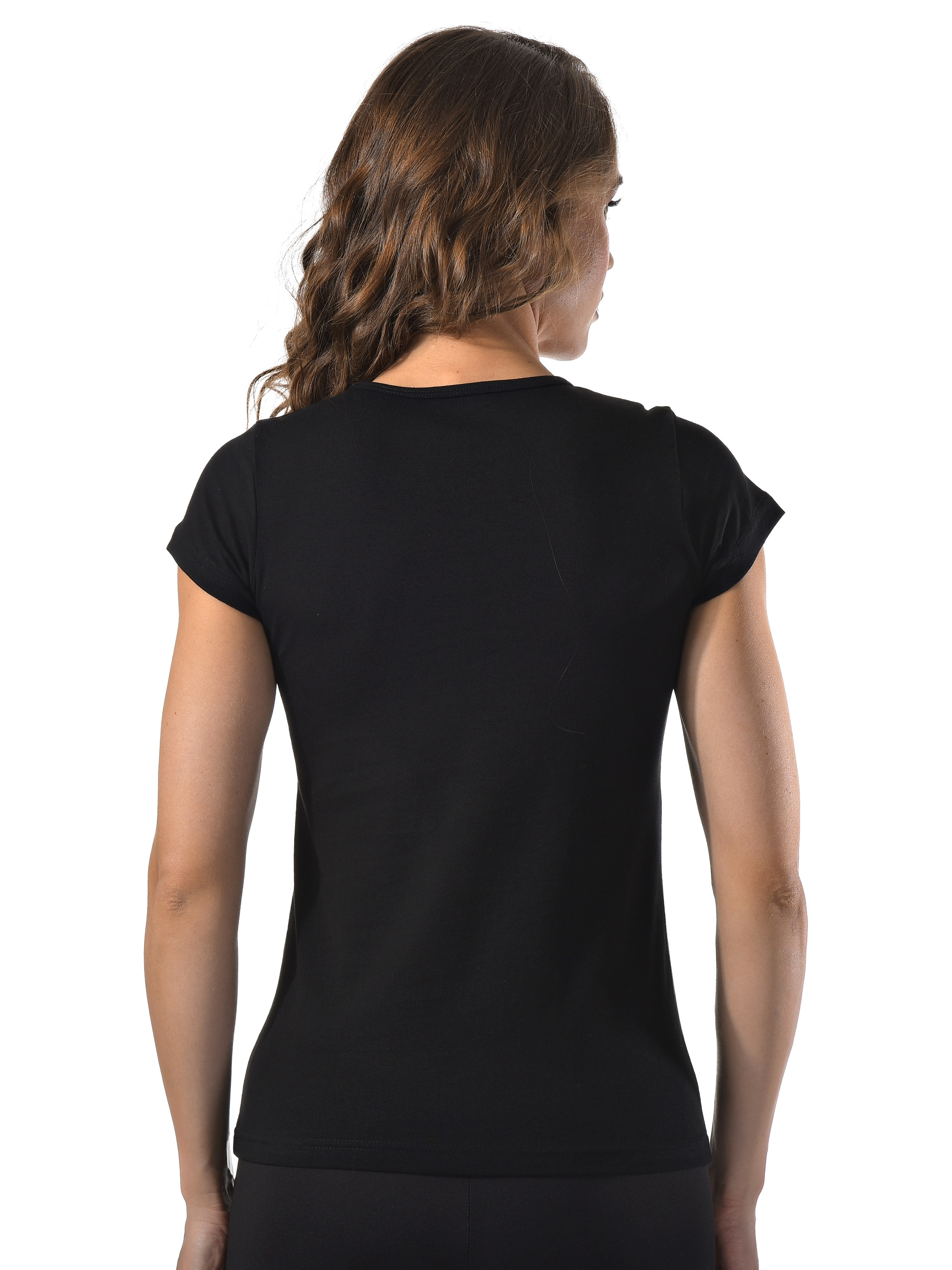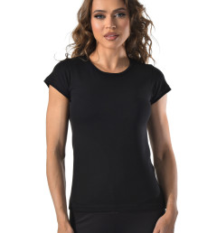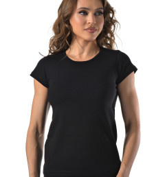 Приталенная модель футболки с круглой горловиной и коротким рукавом.