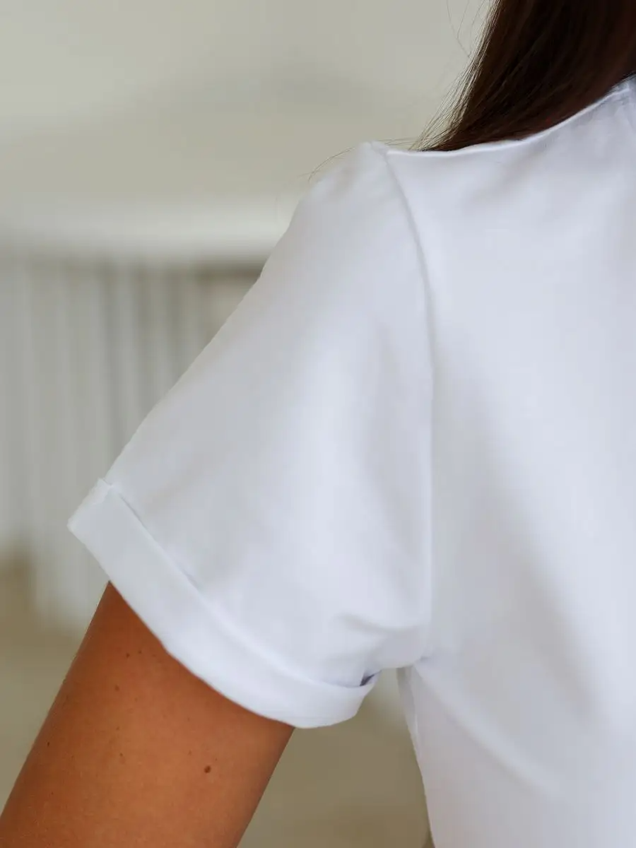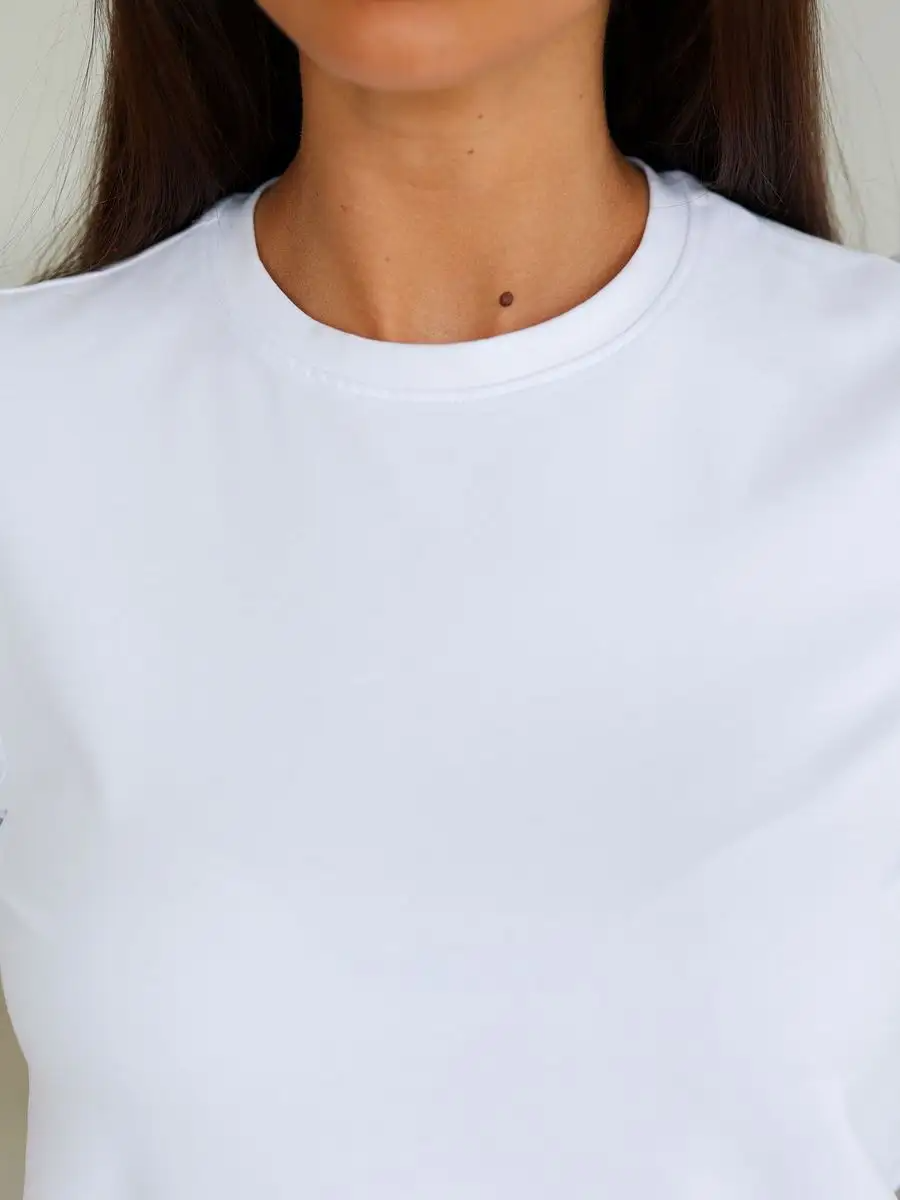 Размер на модели S. Длина изделия составляет 59 см, ширина футболки — 46 см, а длина рукава — 17 см.