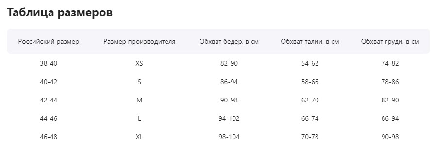Таблица размеров