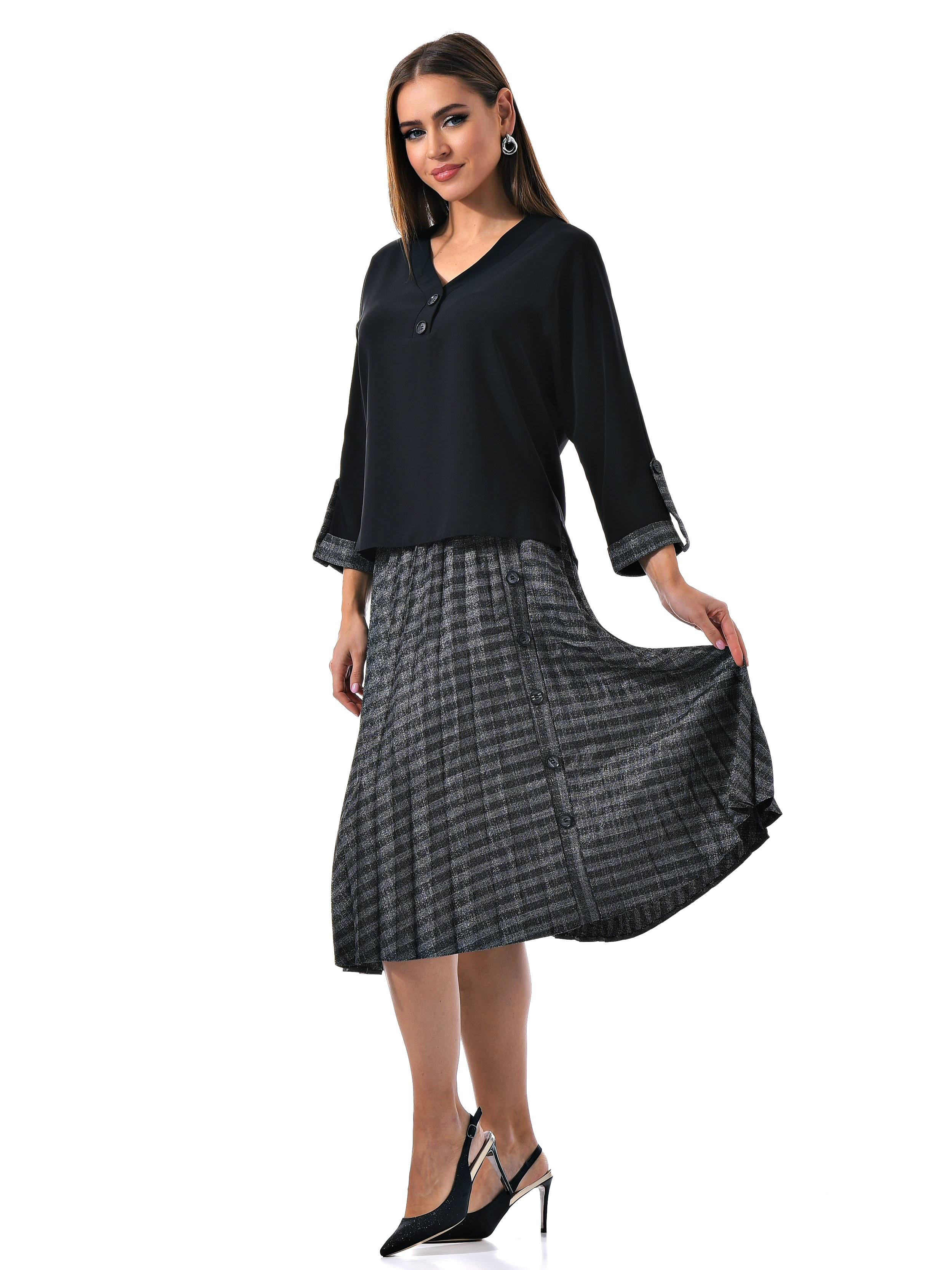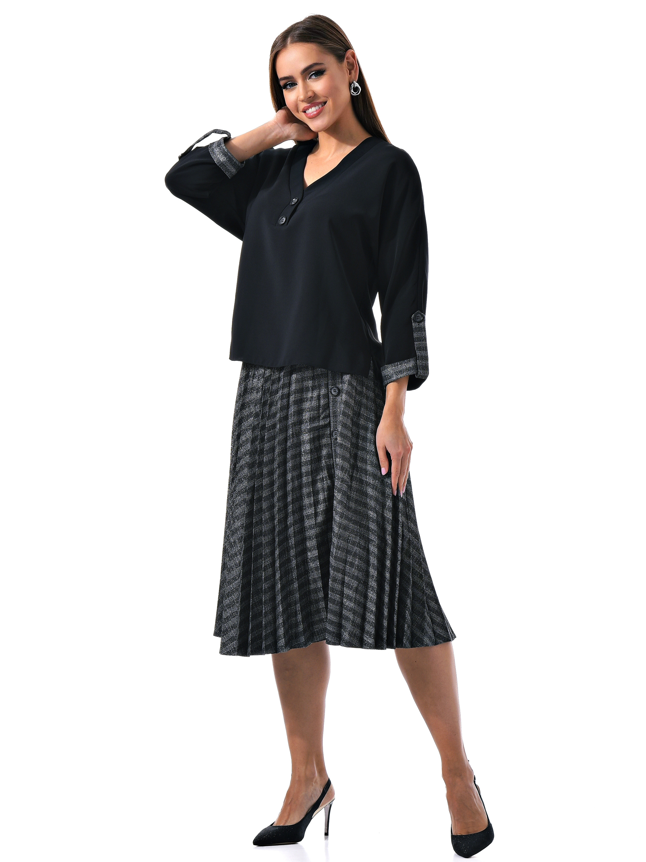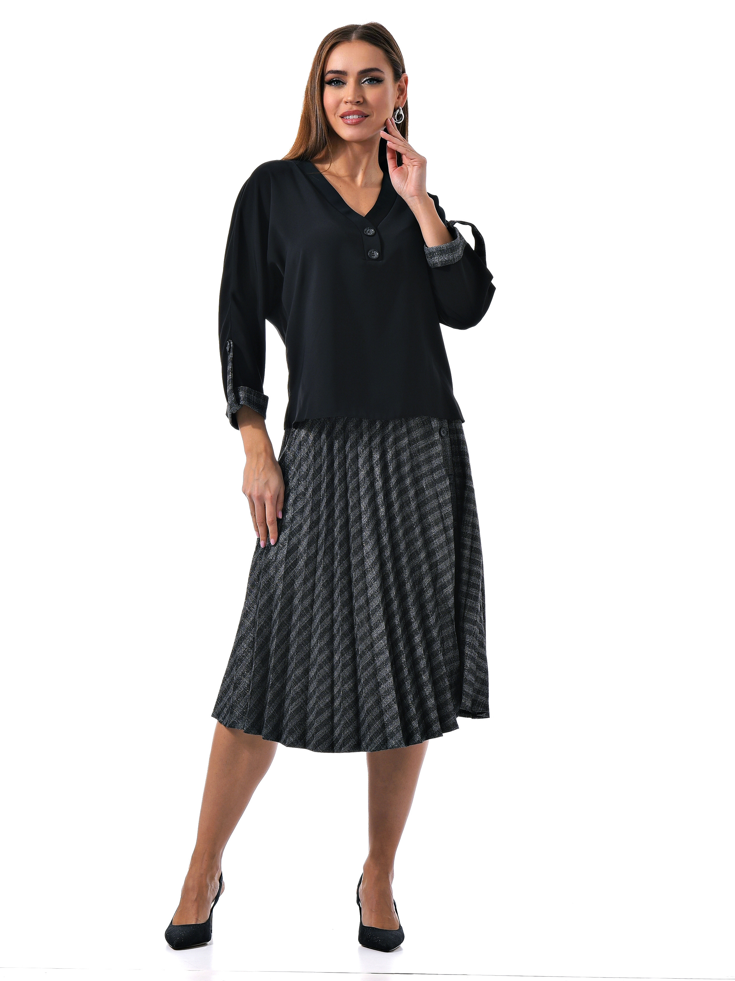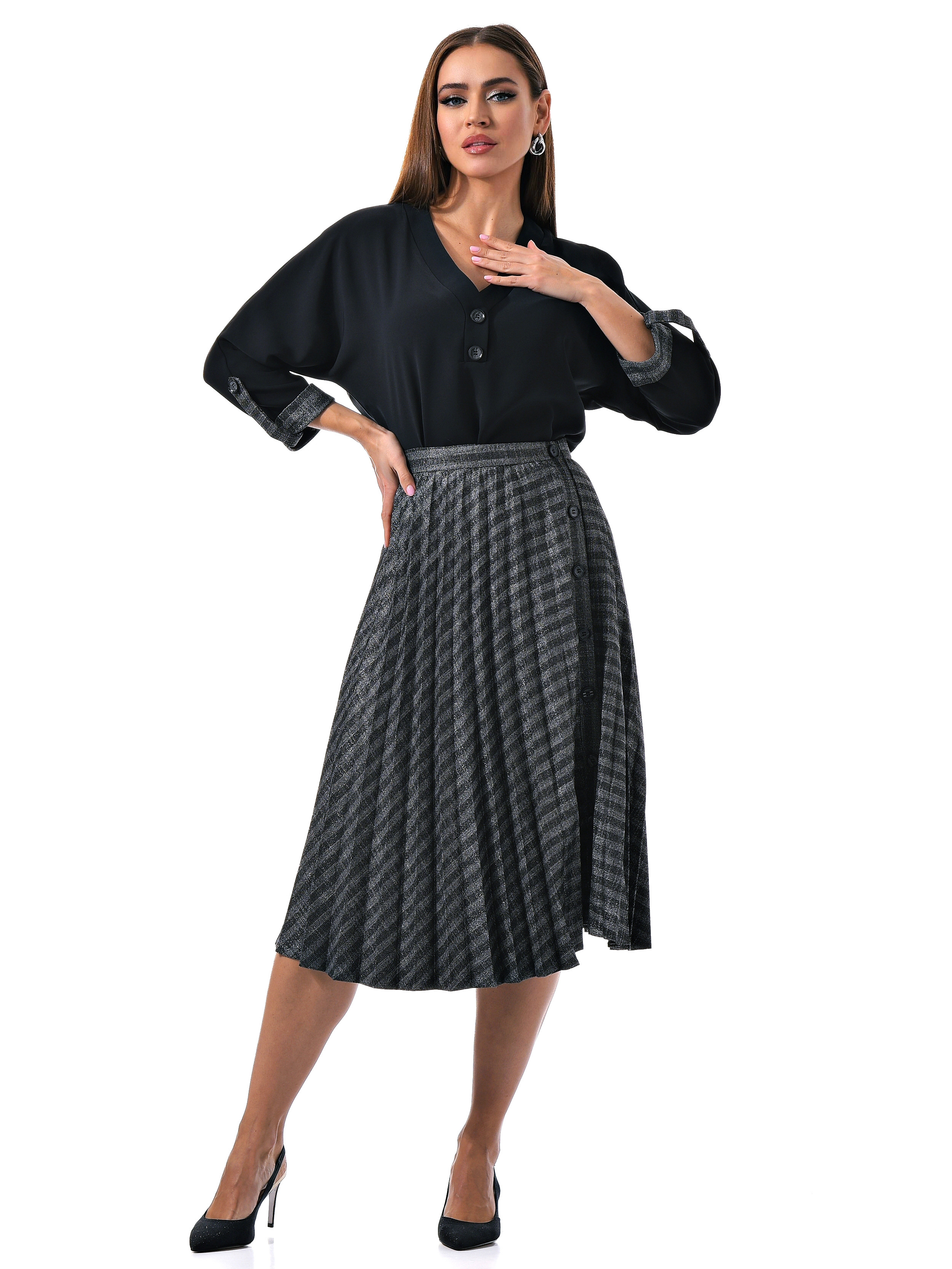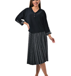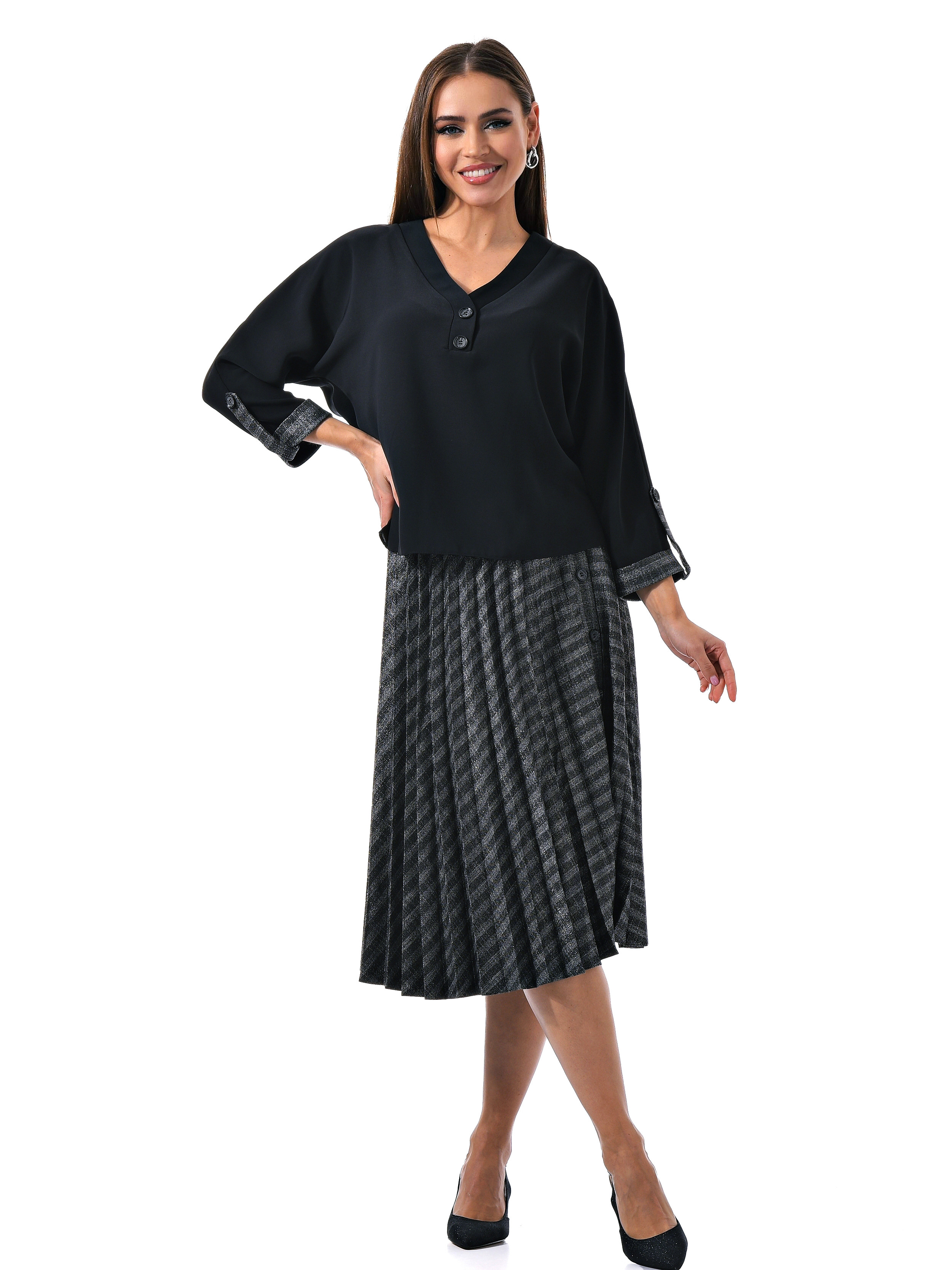 На фотографии представлен женский костюм-двойка, состоящий из черного блузона с длинными рукавами и V-образным вырезом, который застёгивается на пуговицы, и юбки в полоску. Юбка имеет среднюю длину и прямой крой. Цветовая гамма костюма включает оттенки серого и черного, что придаёт ему стильный и современный вид. Этот костюм отлично подойдёт как для офисного, так и для повседневного образа.
