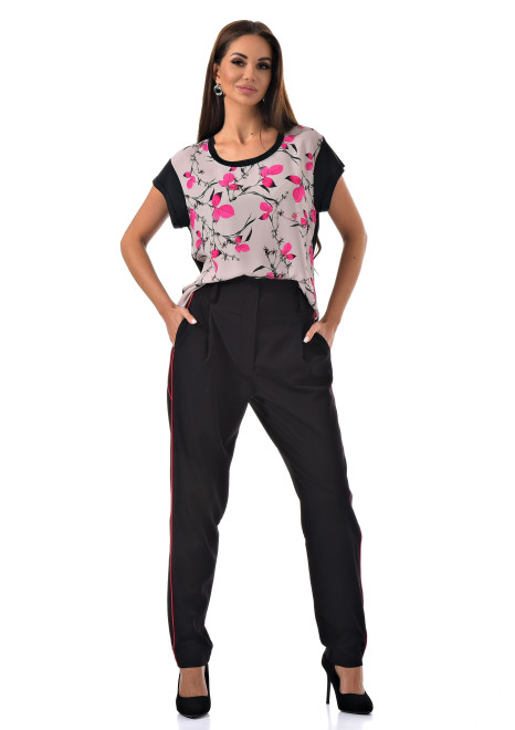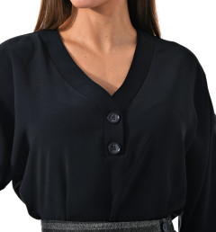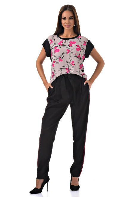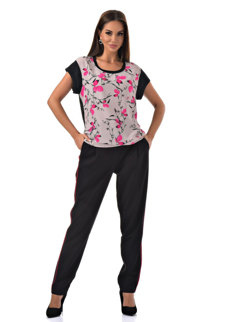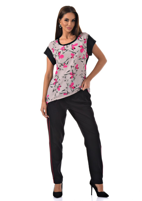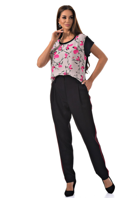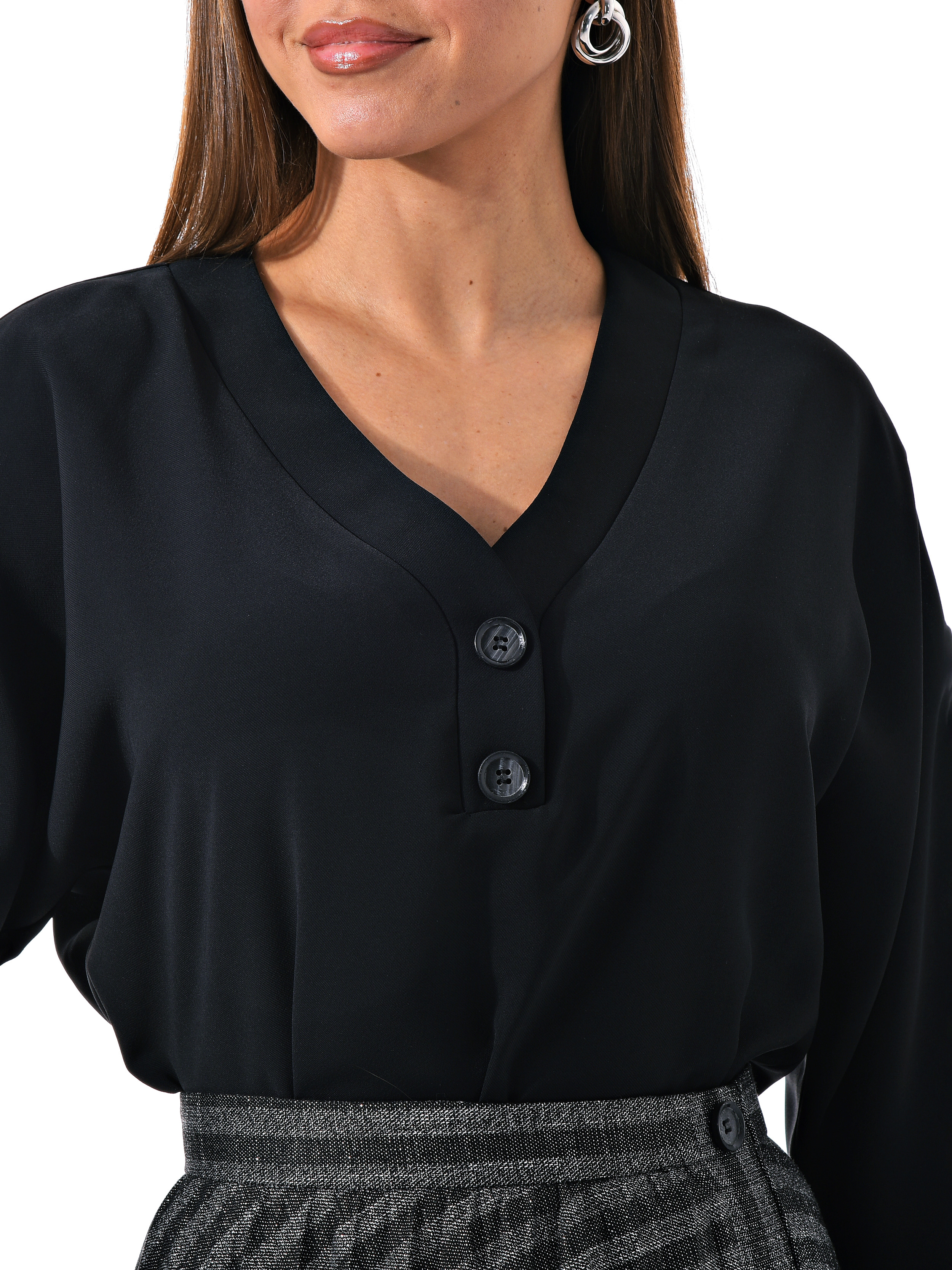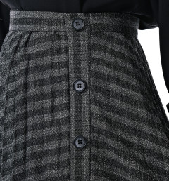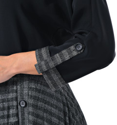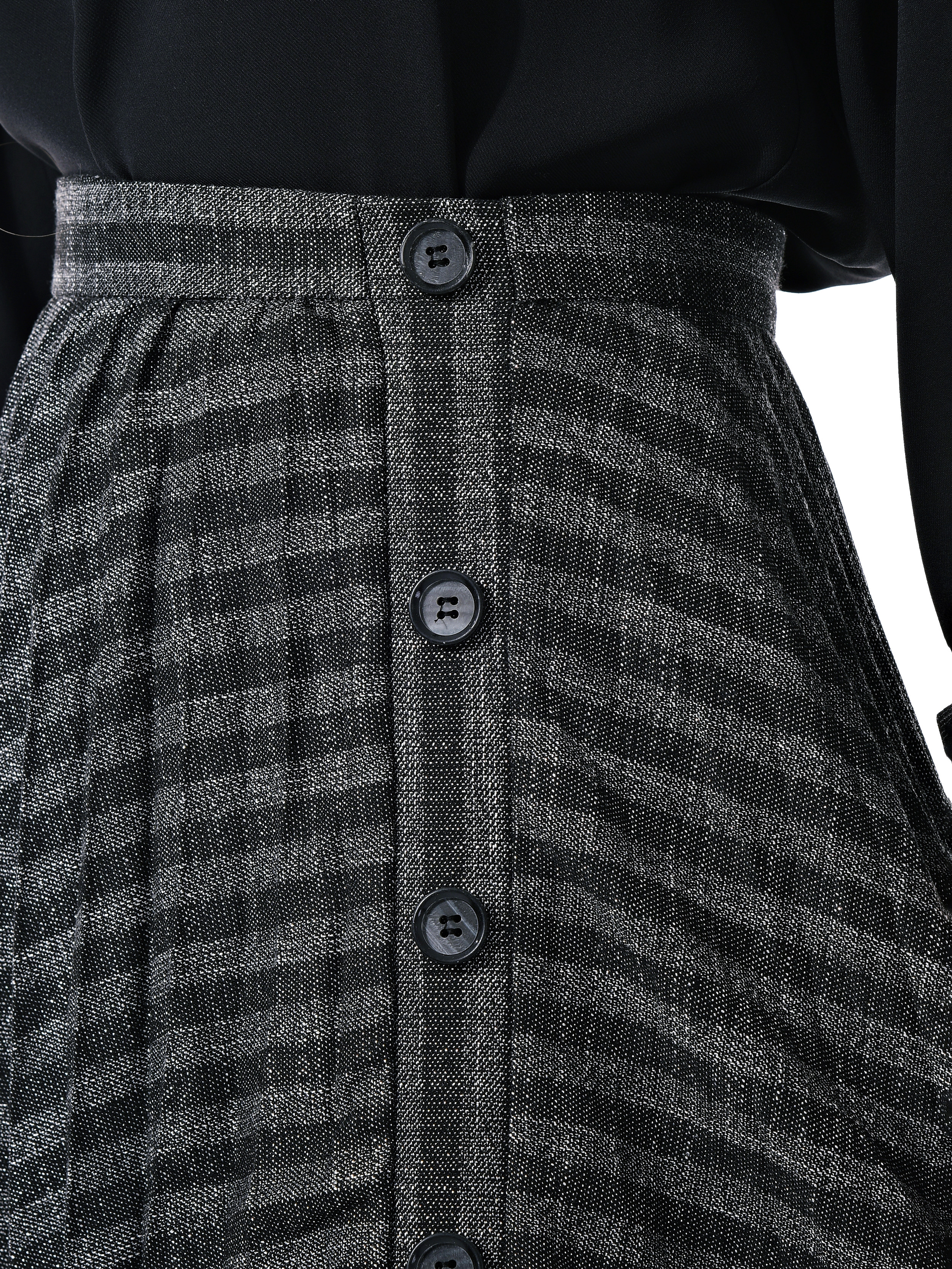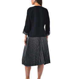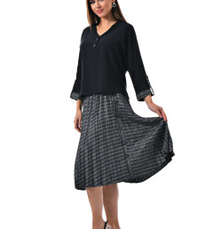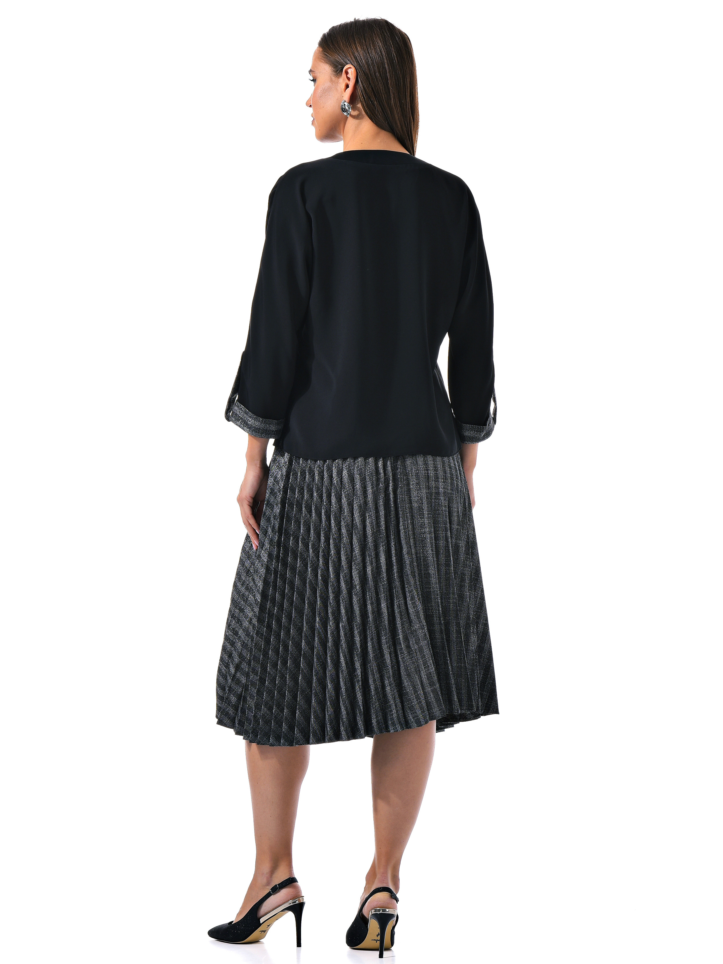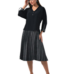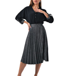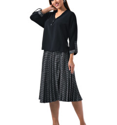 На фотографии представлен женский костюм-двойка, состоящий из черного блузона с длинными рукавами и V-образным вырезом, который застёгивается на пуговицы, и юбки в полоску. Юбка имеет среднюю длину и прямой крой. Цветовая гамма костюма включает оттенки серого и черного, что придаёт ему стильный и современный вид. Этот костюм отлично подойдёт как для офисного, так и для повседневного образа.