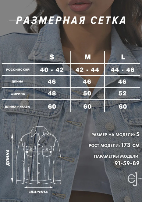 Длина по спинке 73 см, длина рукава по внутреннему шву 43 см, длина рукава внешняя 45 см, ширина манжета 10 см. Рост модели на фото 173 см. Параметры модели 89-62-93. Размер на модели S.